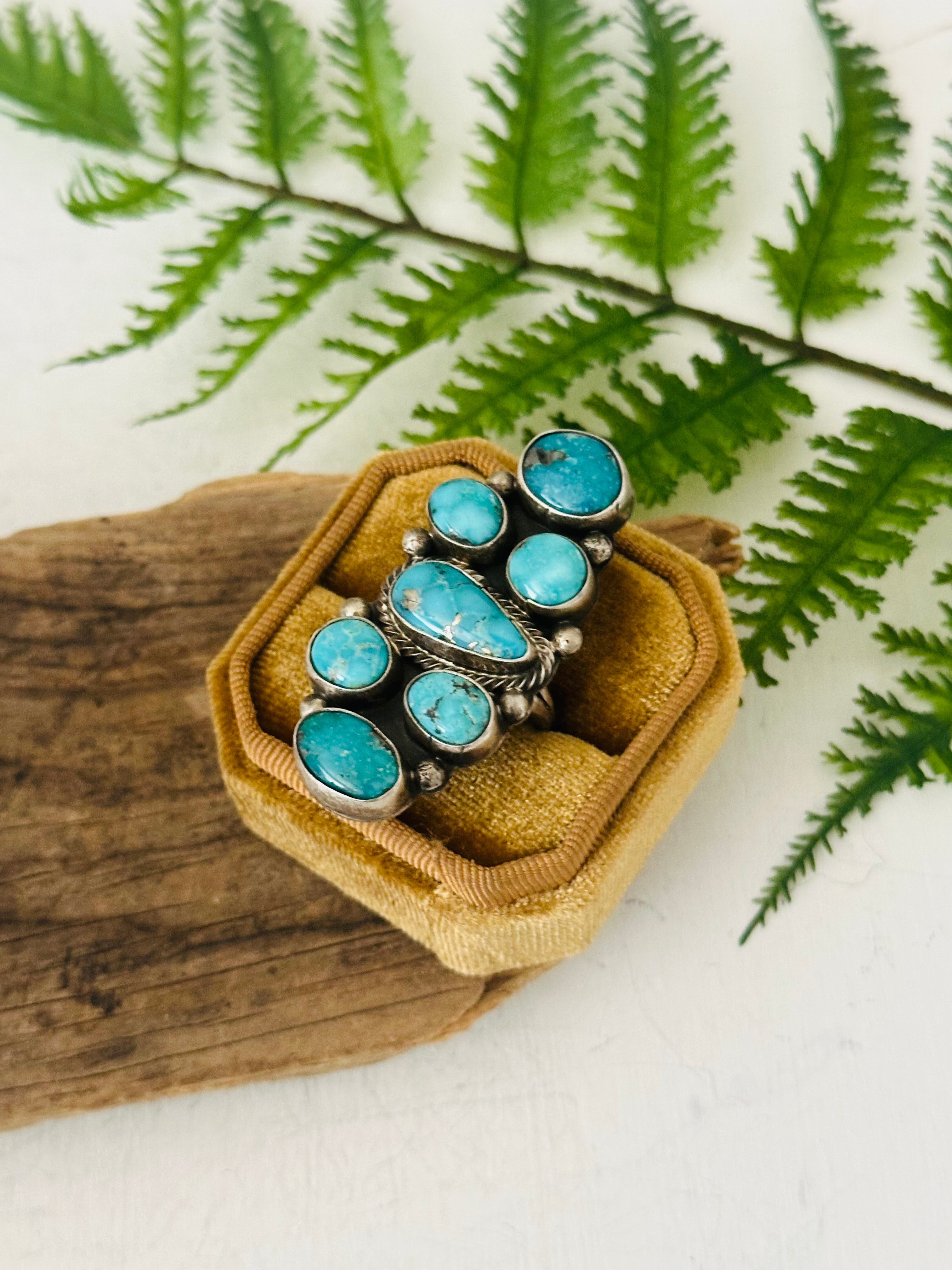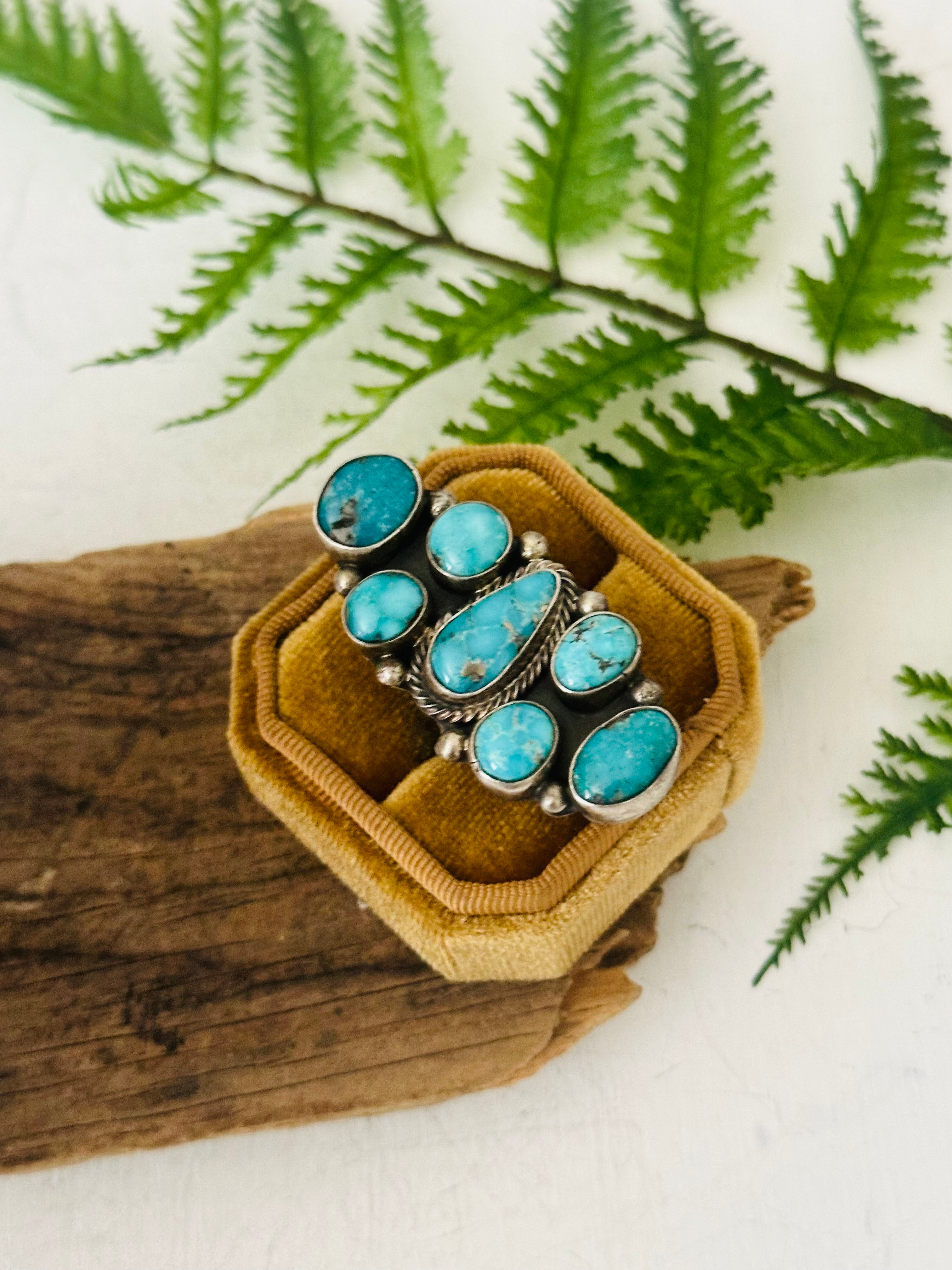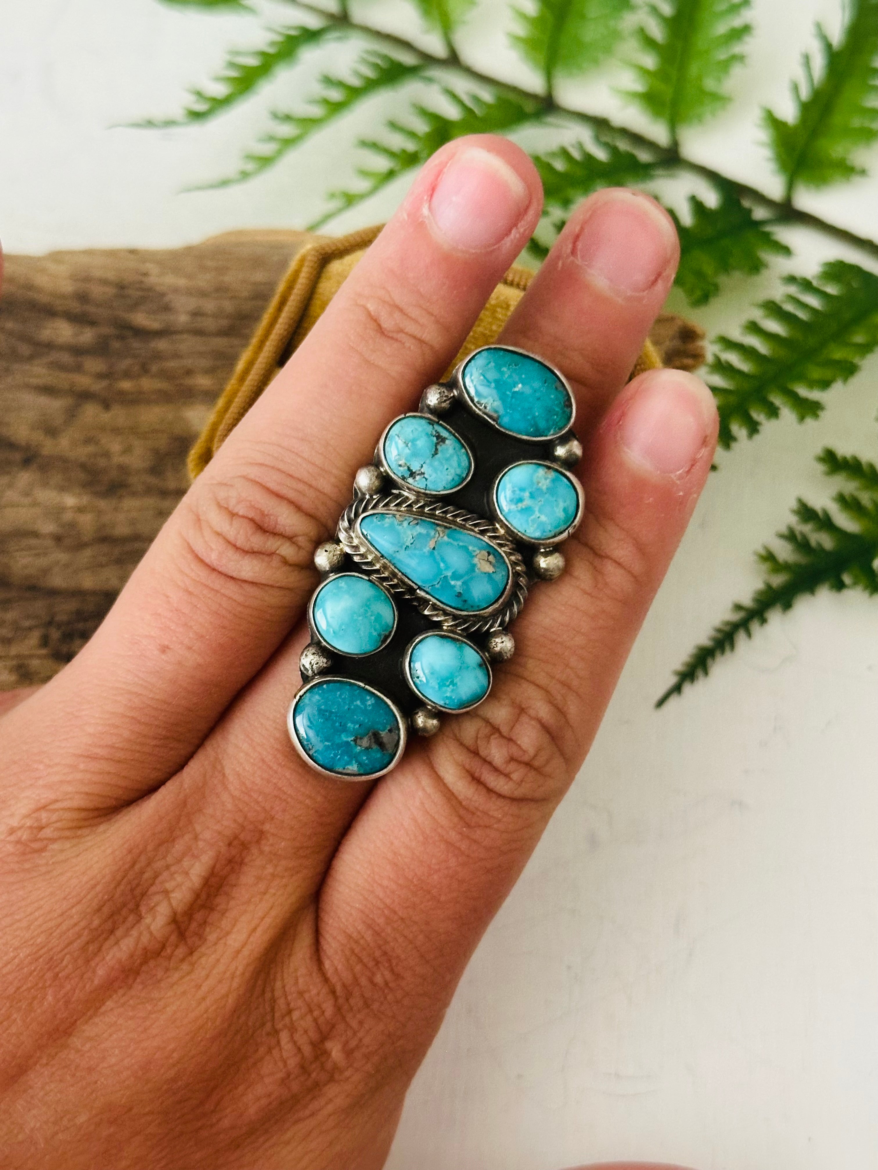 Sheila Becenti White Water Turquoise & Sterling Silver Adjustable Cluster Ring. It measures 2 3/8 inches long and 3/4 of an inch wide. Signed by the artist and stamped sterling silver.