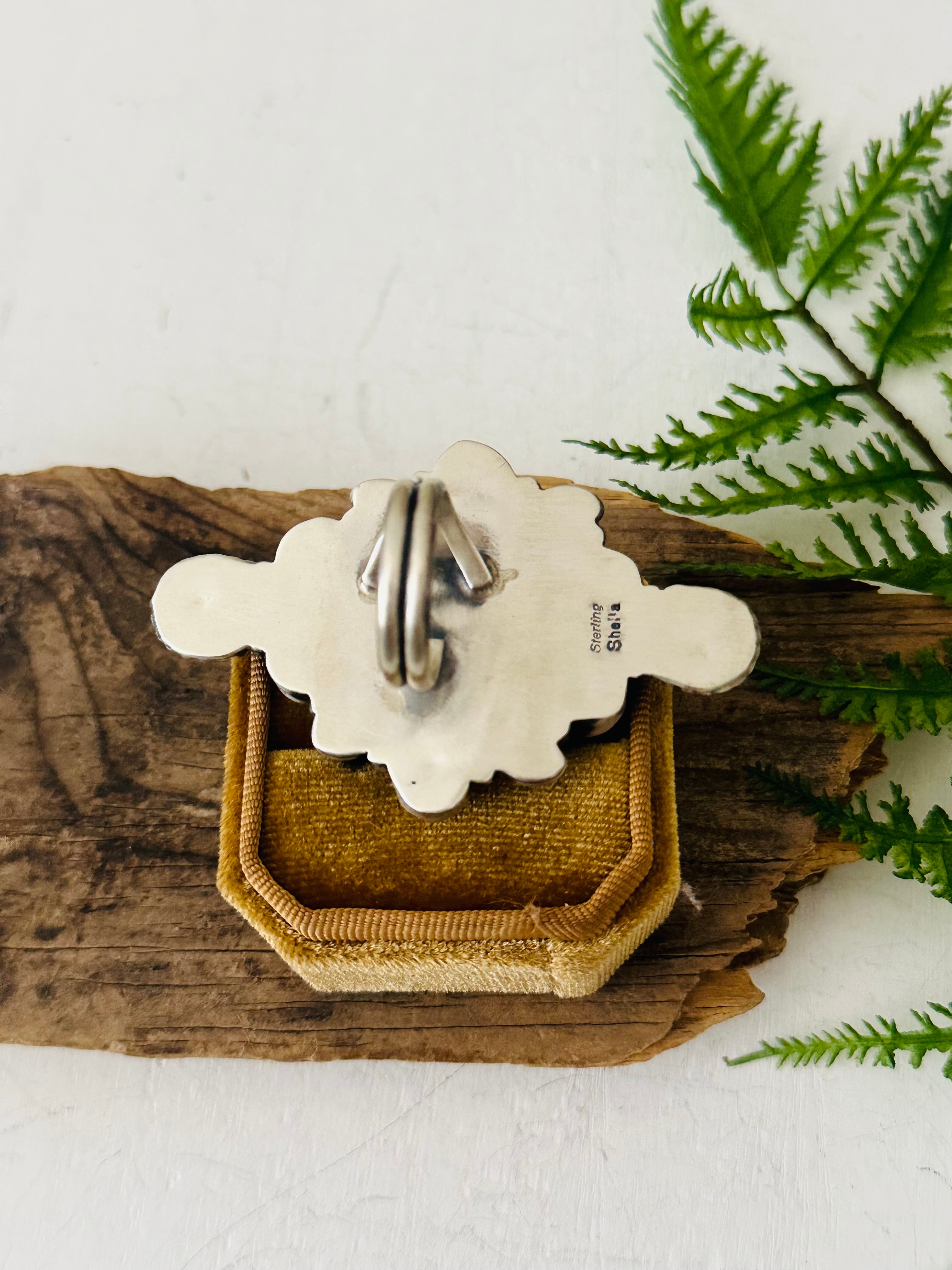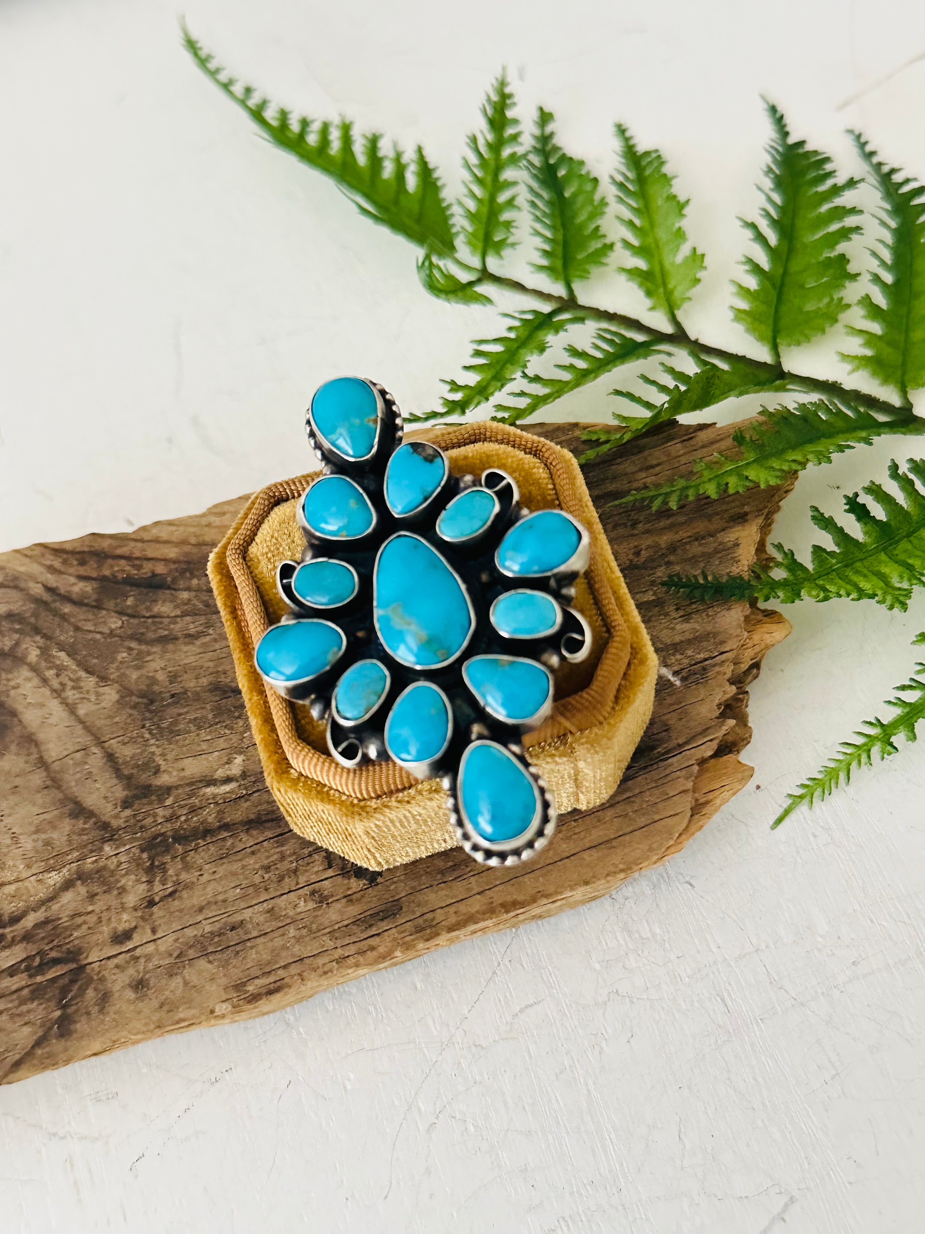 Sheila Becenti Blue Ridge Turquoise & Sterling Silver Adjustable Cluster Ring. It measures 2 5/8 inches long and 1 5/8 inches wide. Signed by the artist and stamped sterling silver.
