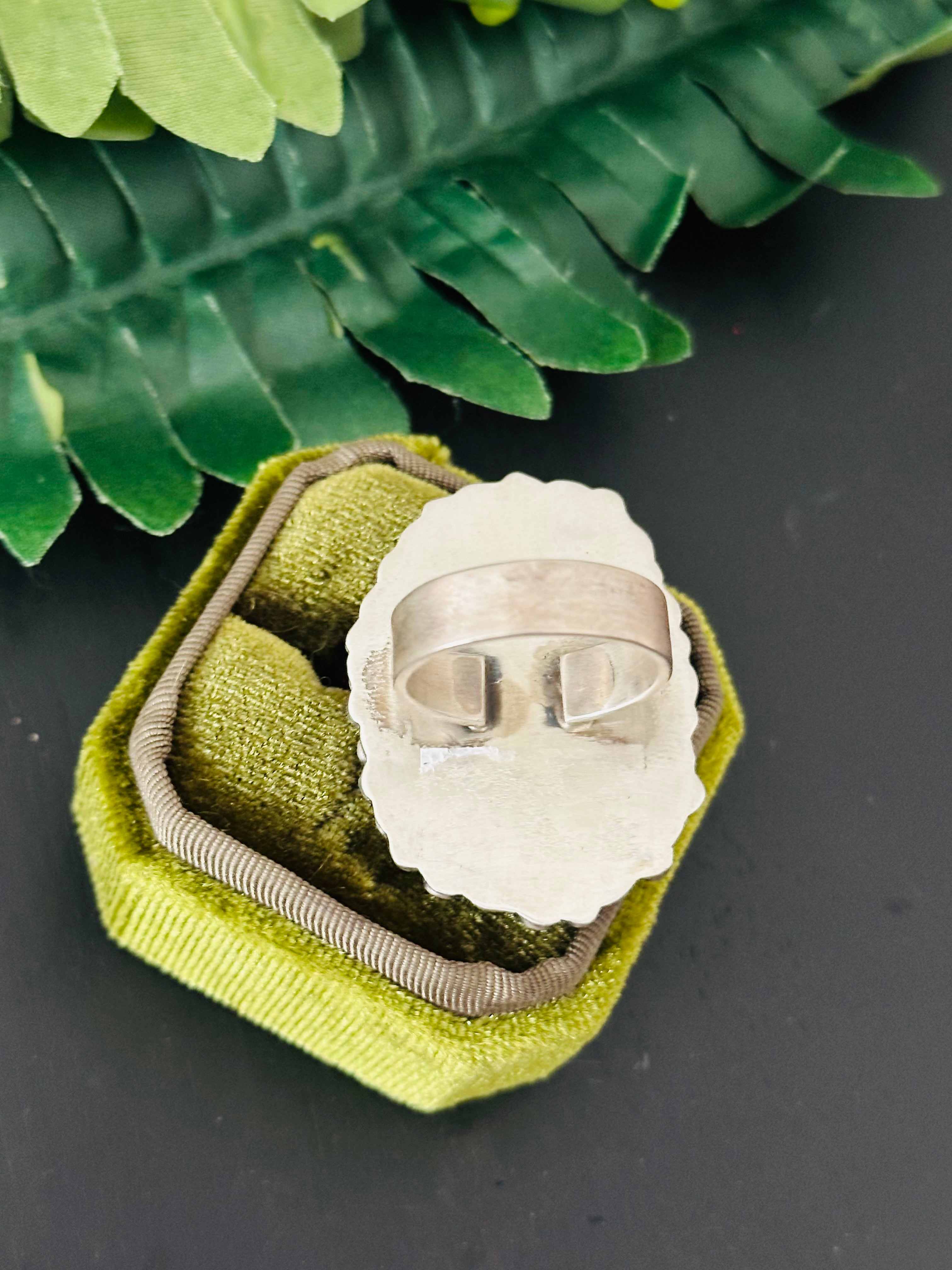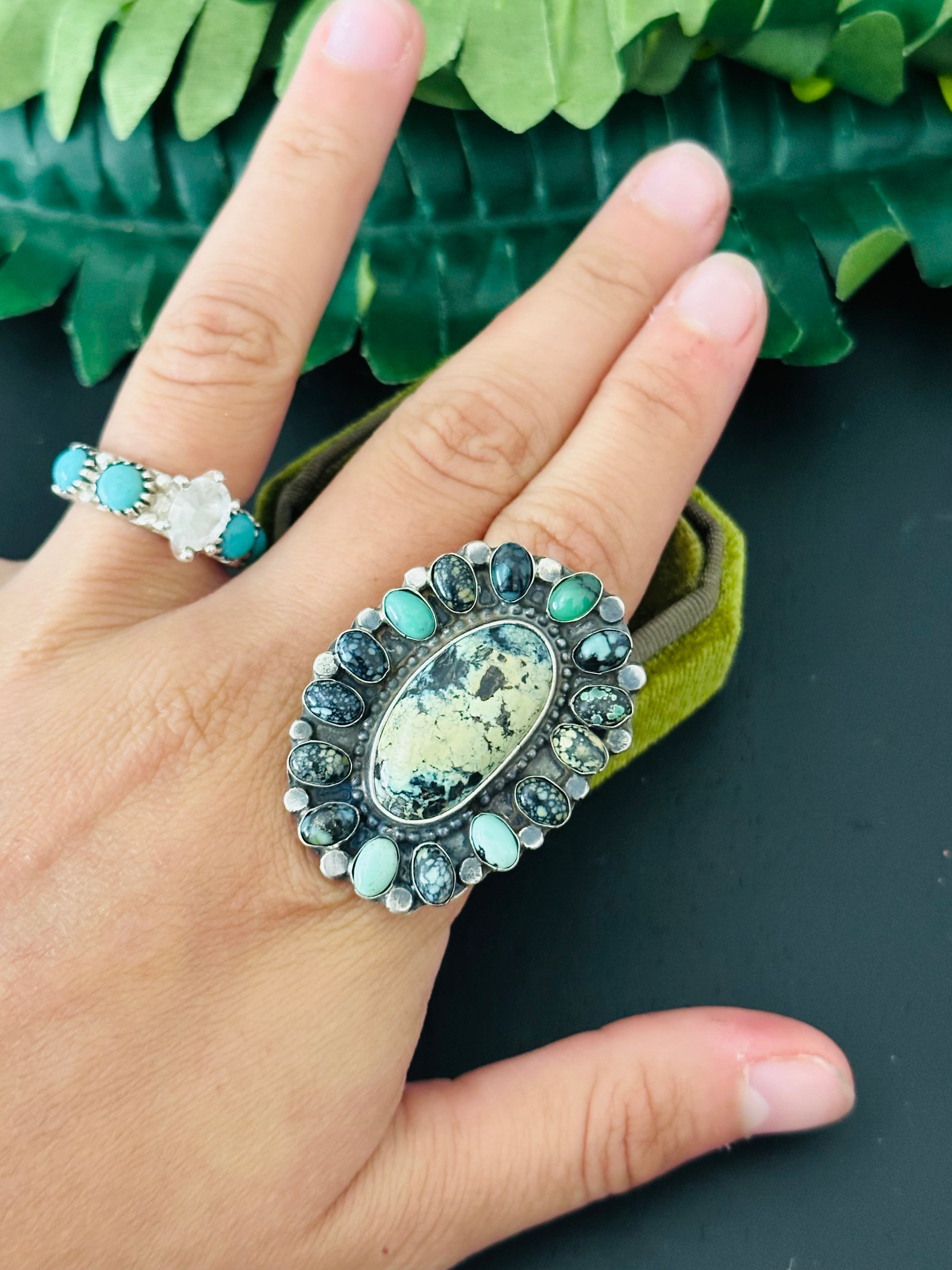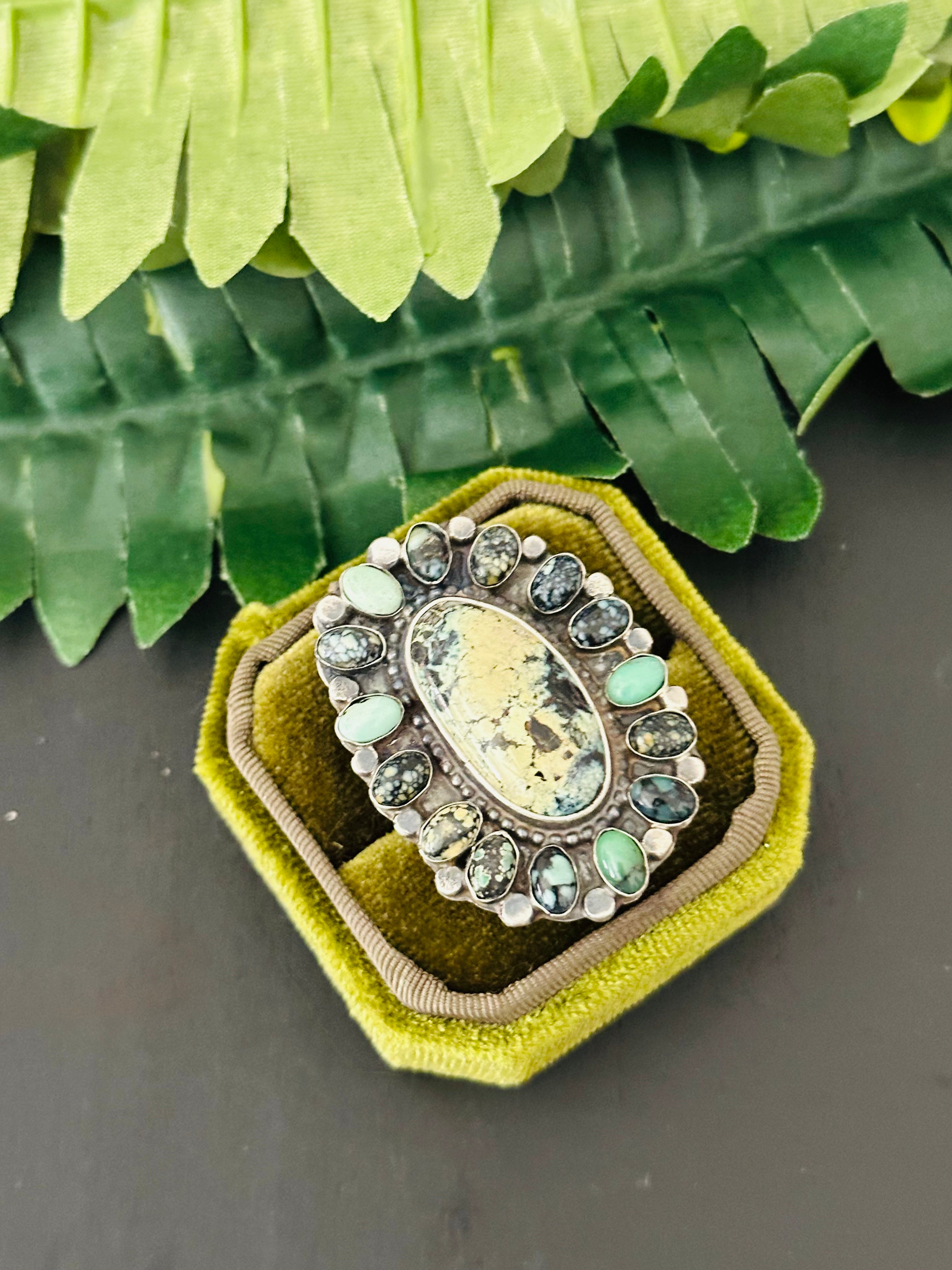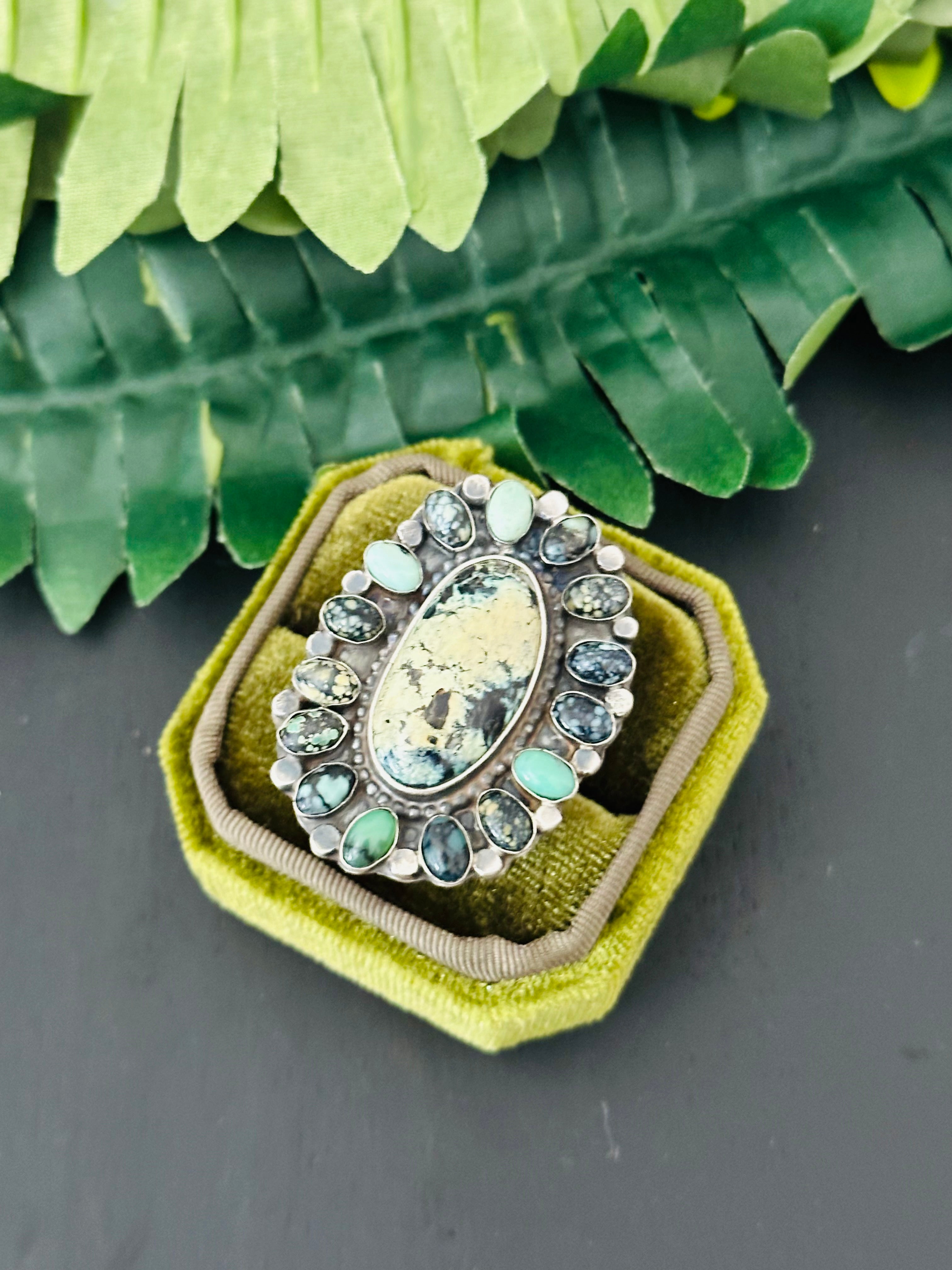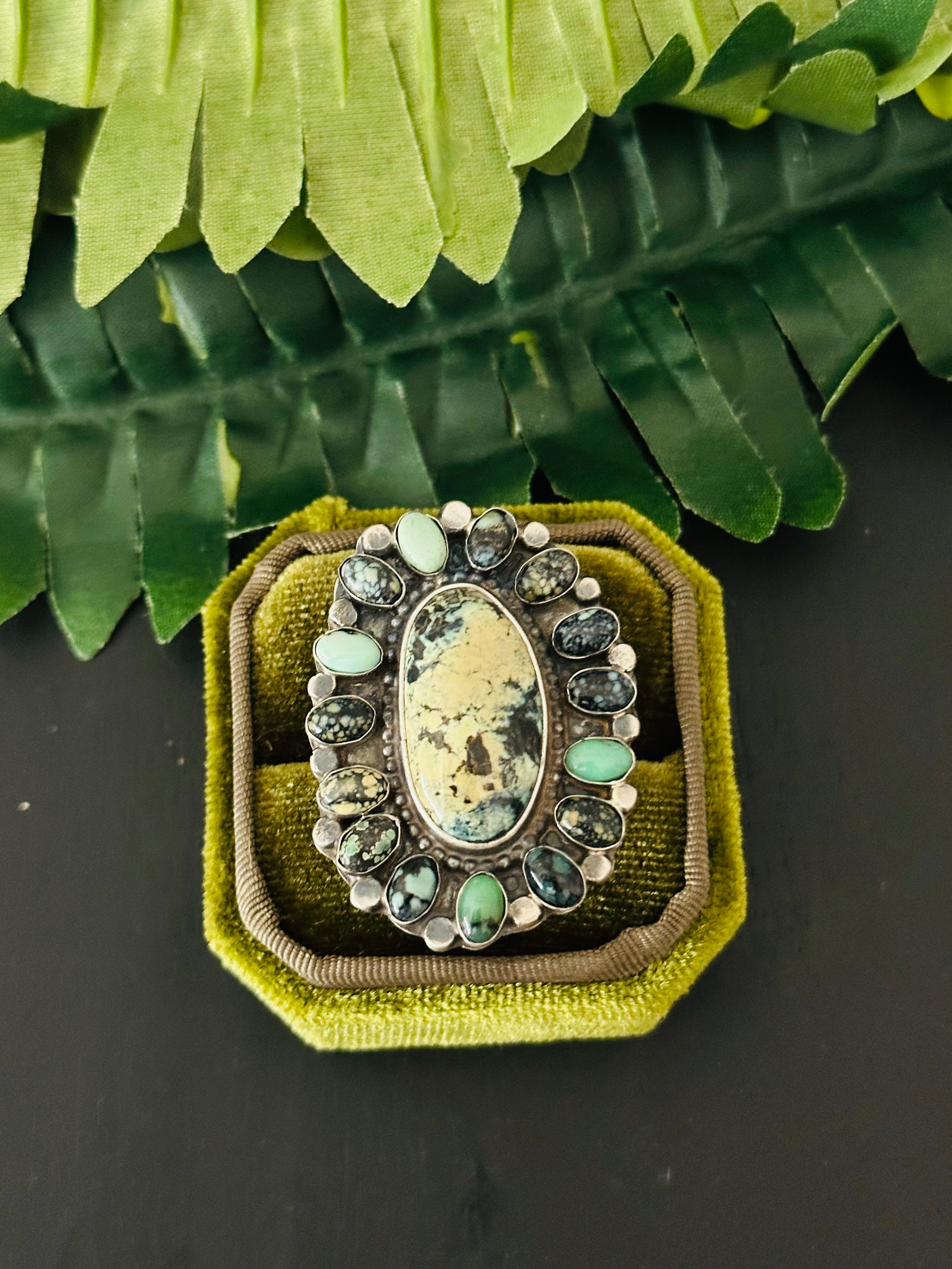 Sheila Becenti New Lander & Sterling Silver Cluster Ring Size 9.5. It measures 1 5/8 inches long and 1 1/8 inches wide. Signed by the artist and stamped sterling silver.