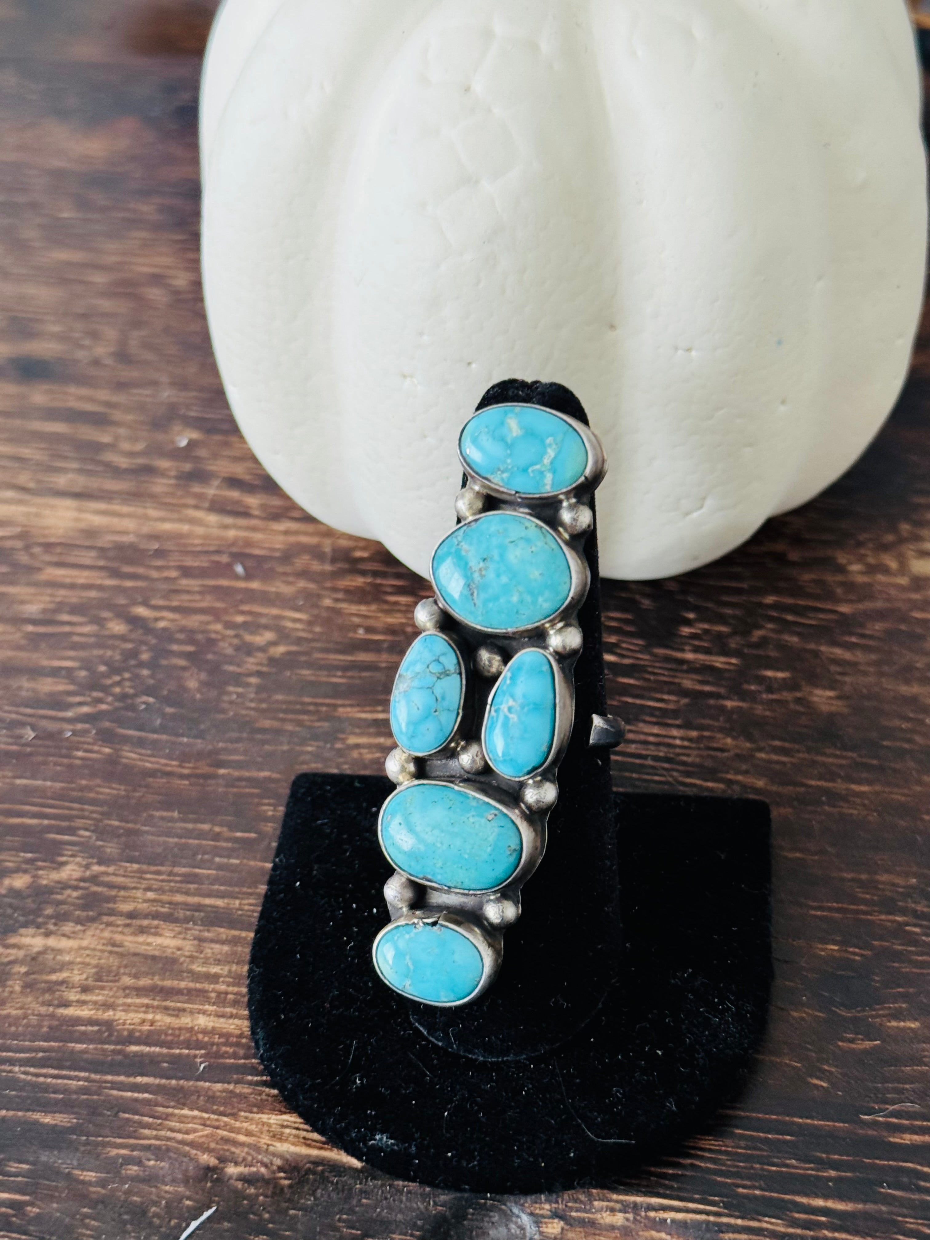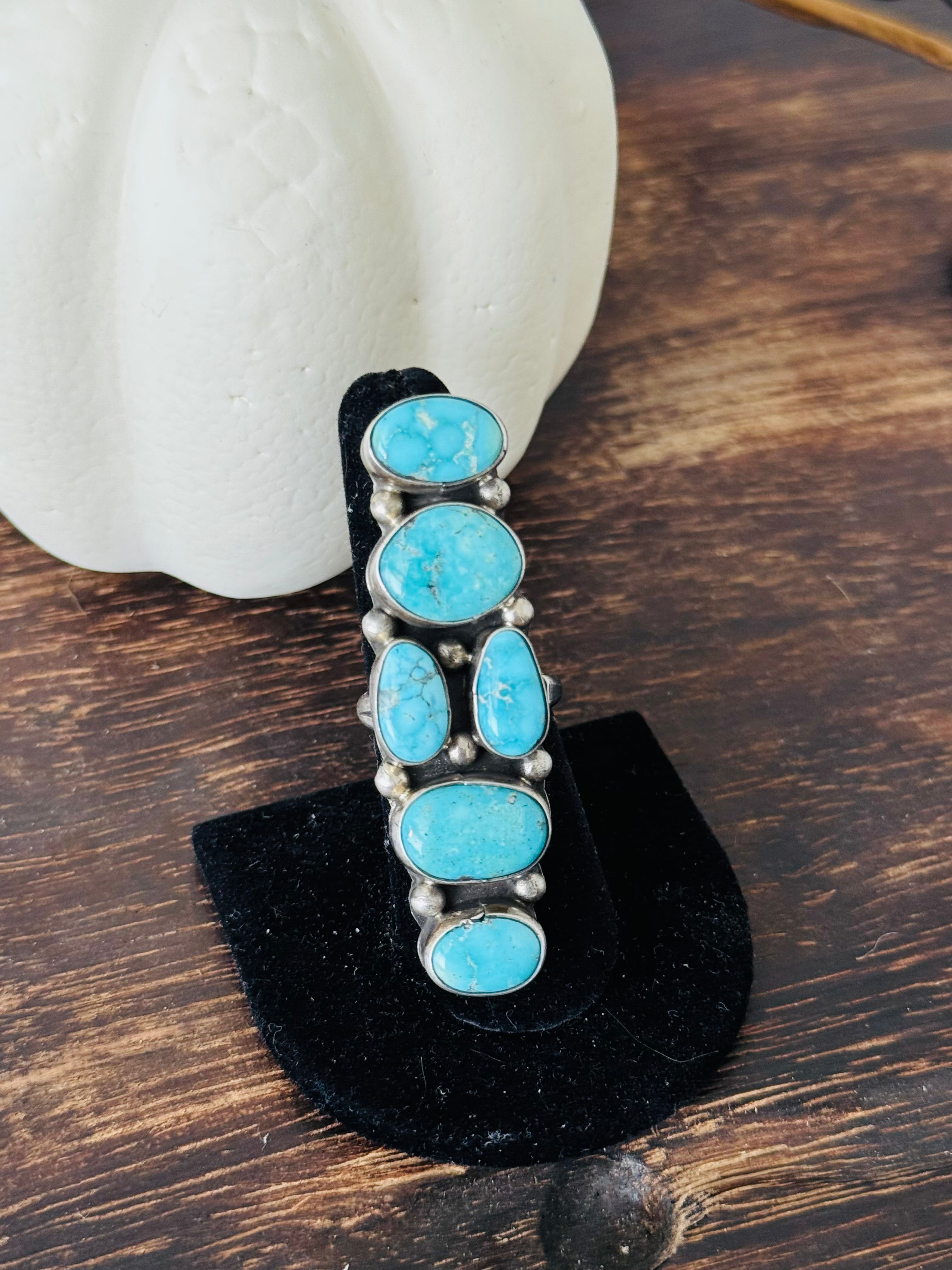 Sheila Becenti White Water Turquoise & Sterling Silver Adjustable Cluster Ring. It measures 2 3/8 inches long and 3/4 of an inch wide. Signed by the artist and stamped sterling silver.