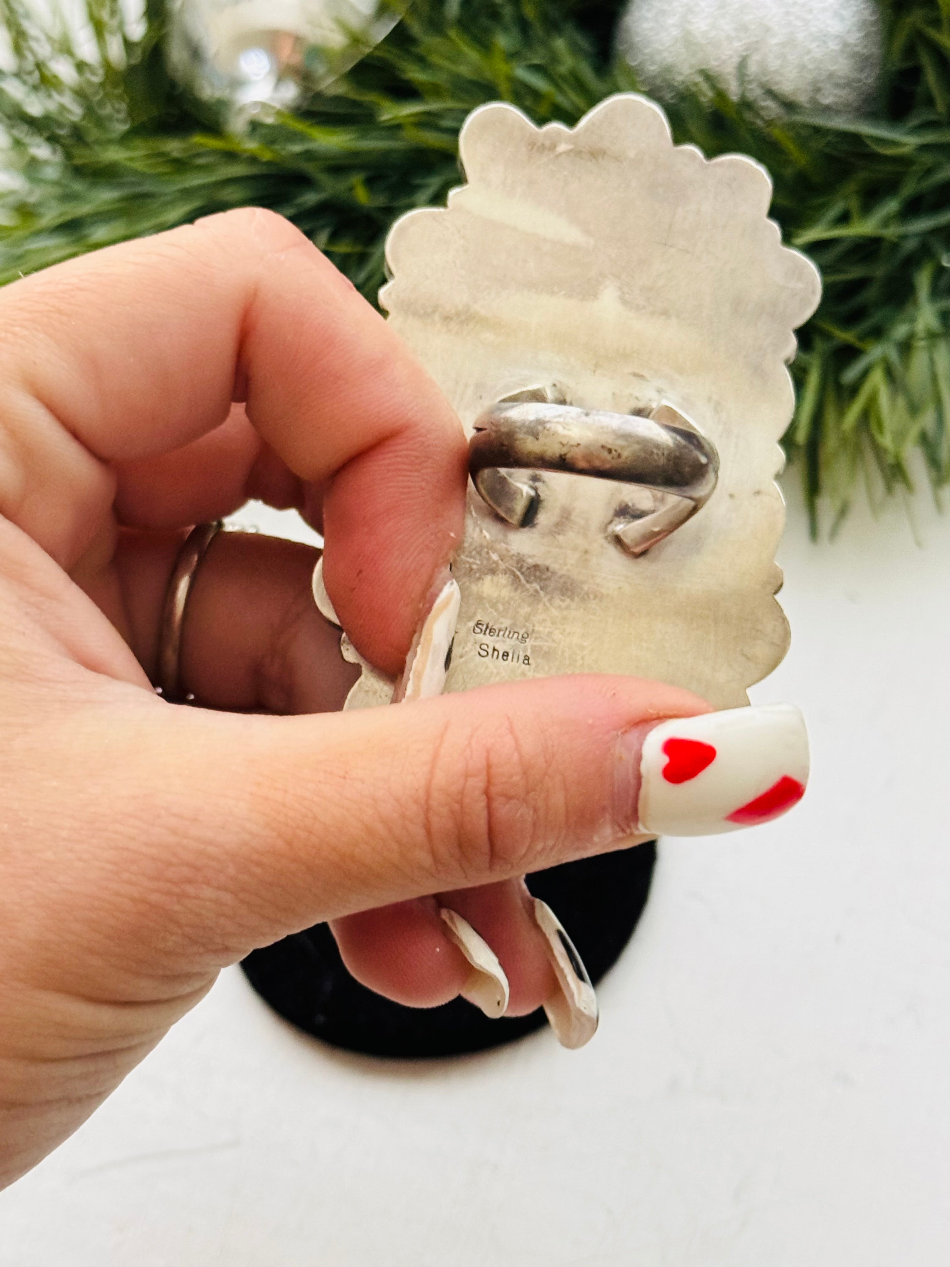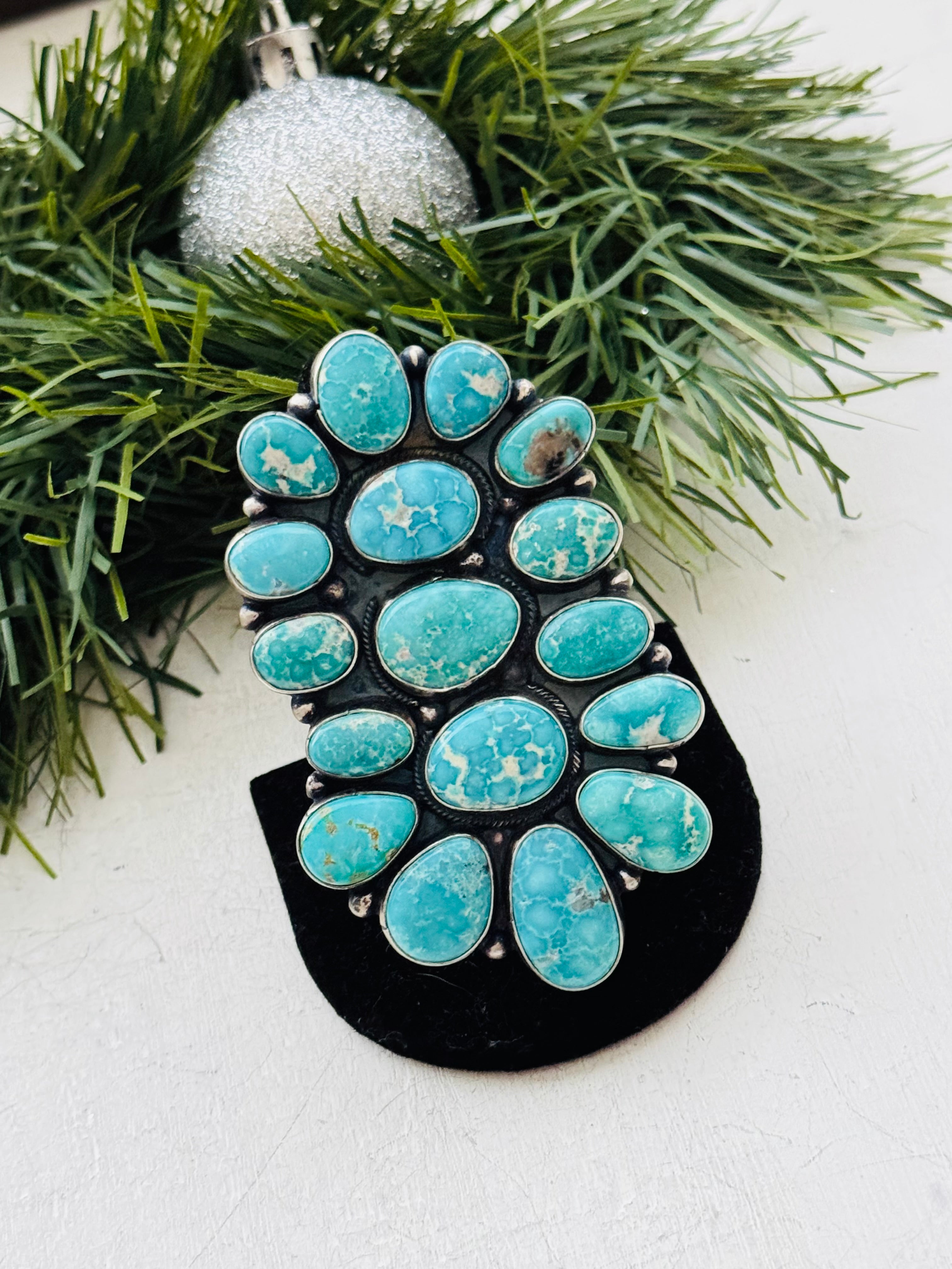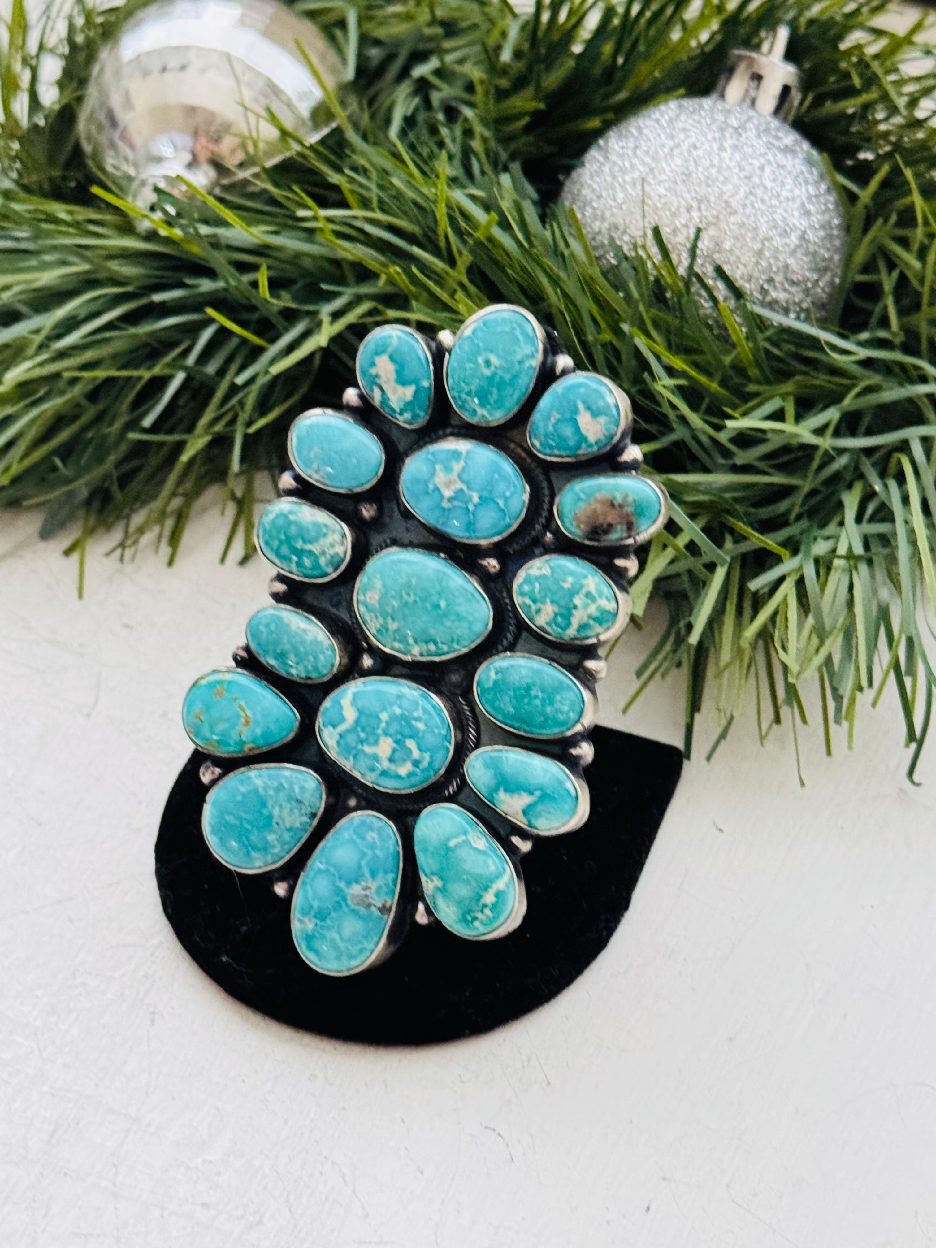 Sheila Becenti White Water Turquoise & Sterling Silver Cluster Ring Size 8.75. It measures 2 7/8 inches long and 1 5/8 inches wide. Signed by the artist and stamped sterling silver.