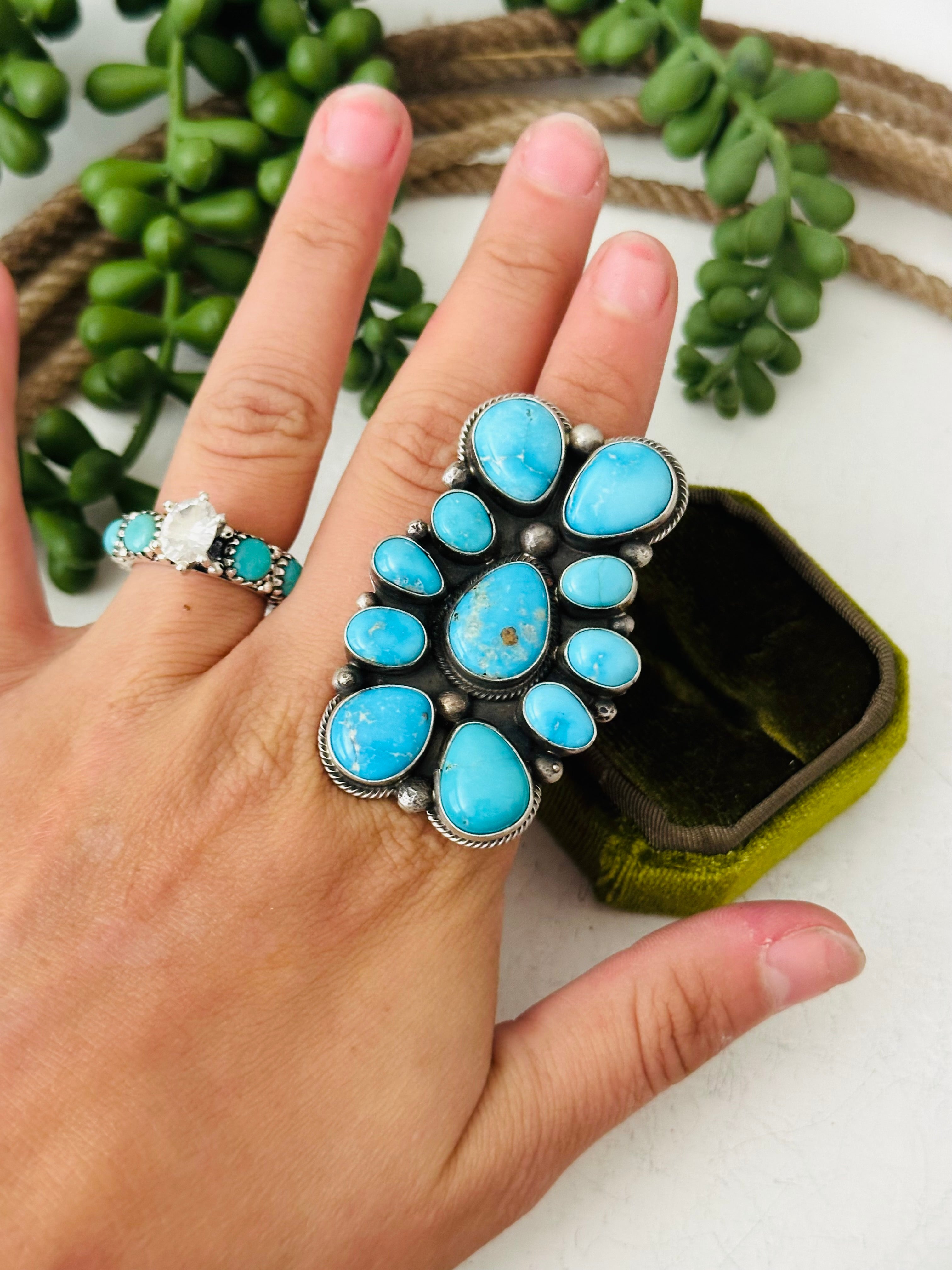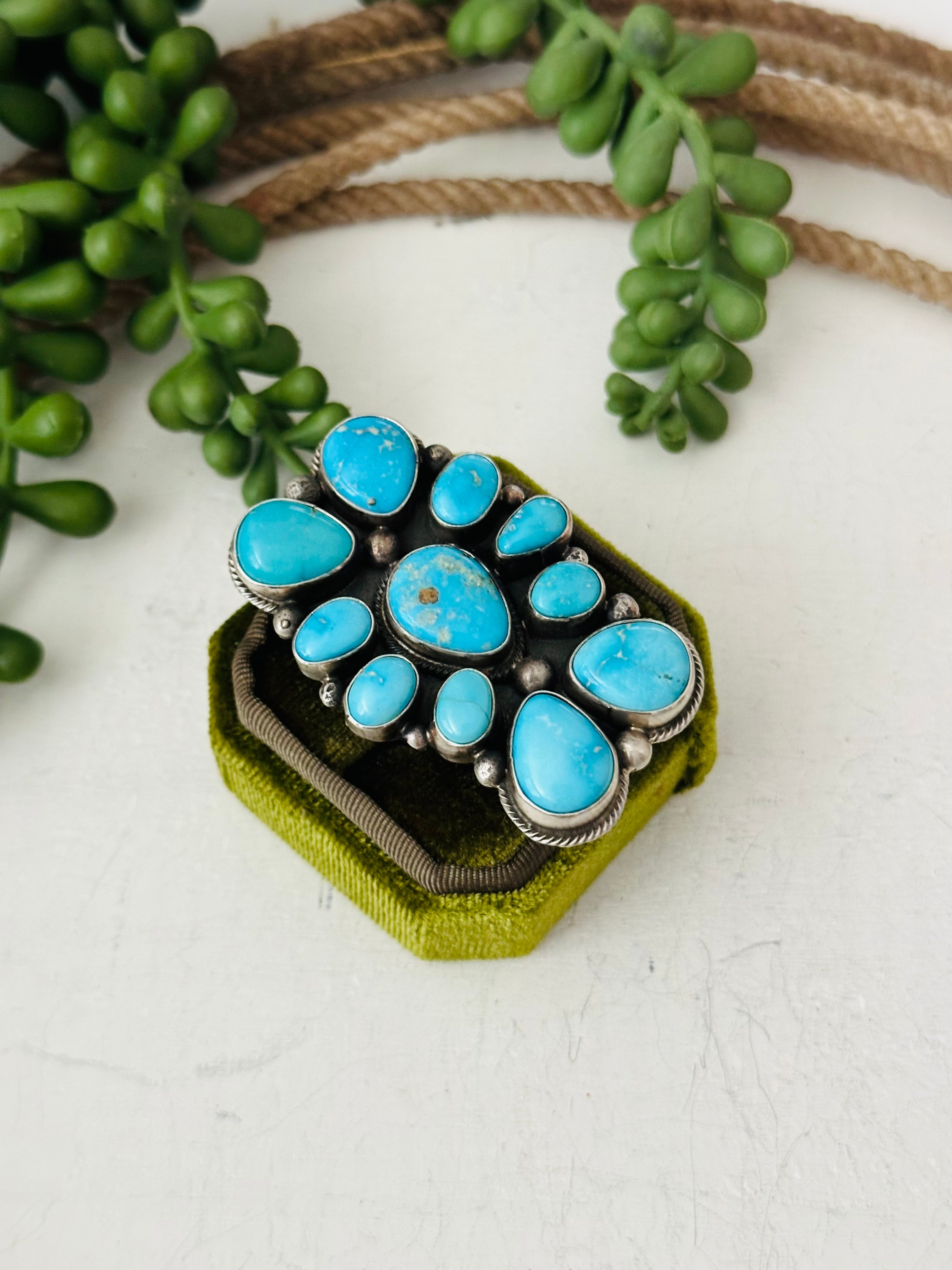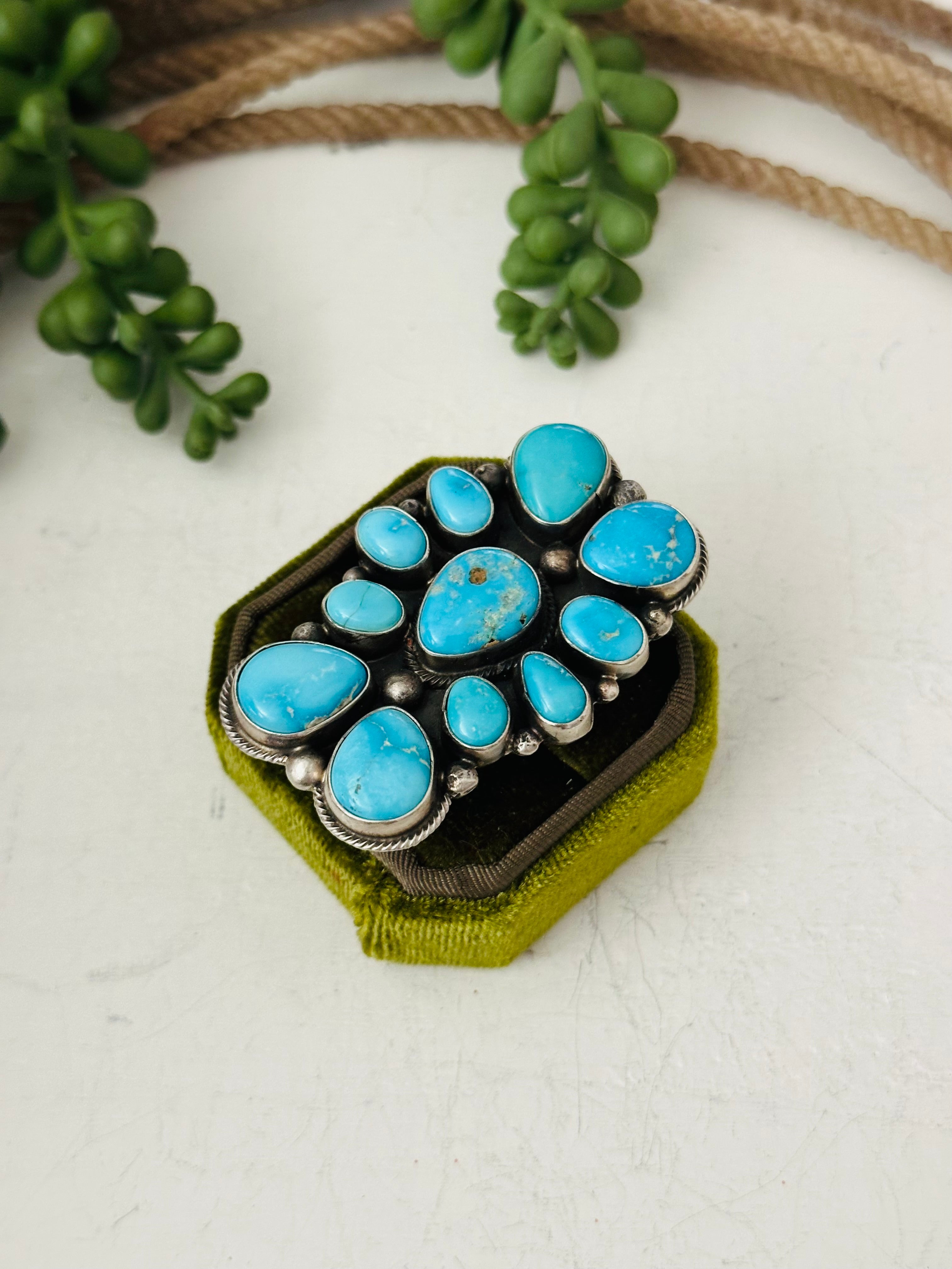 Sheila Tso Valley Blue Turquoise Sterling Silver Cluster Ring Size 8. It measures 2 1/4 inches long and 1 1/2 inches wide. Signed by the artist and stamped sterling silver.