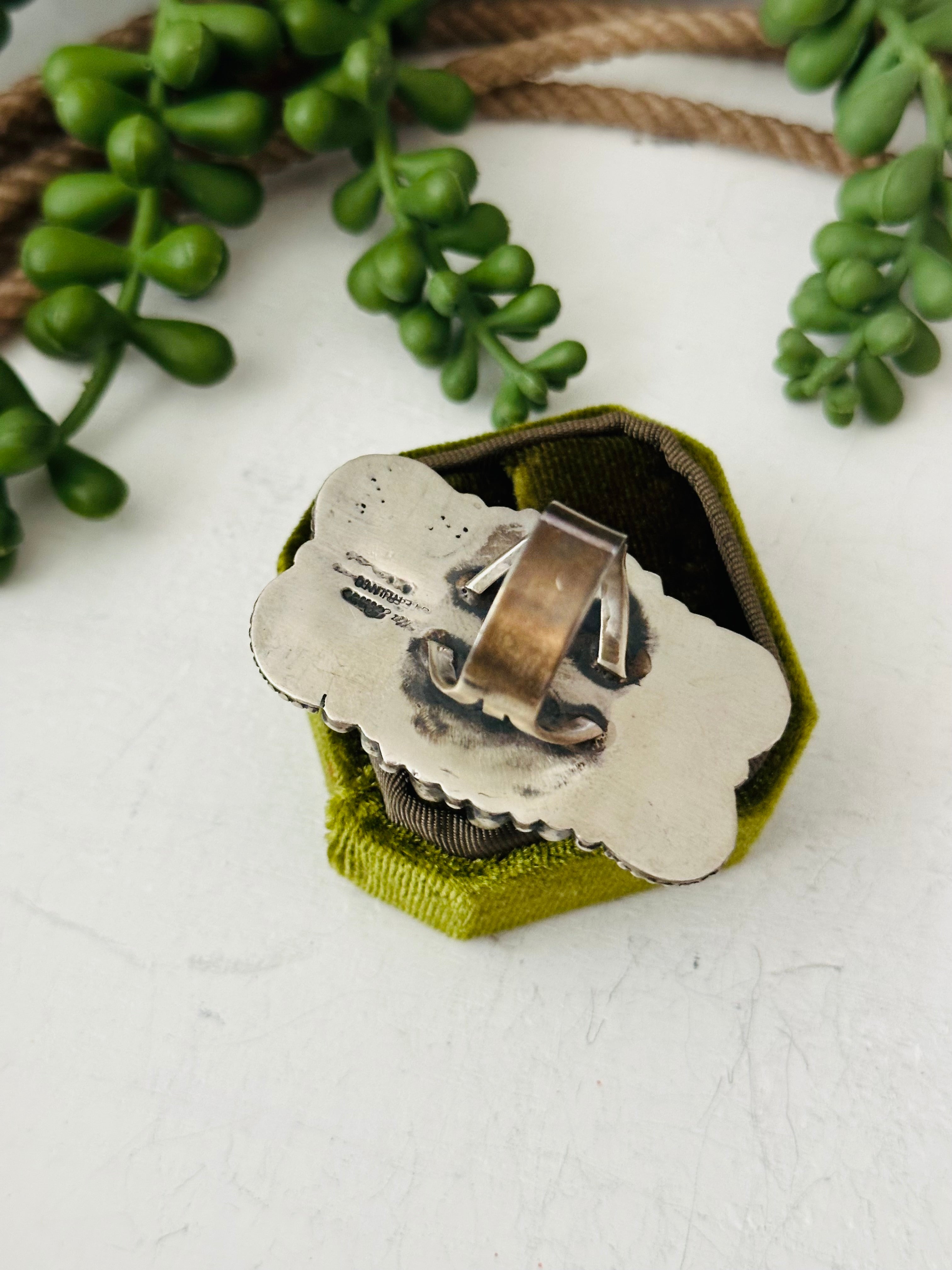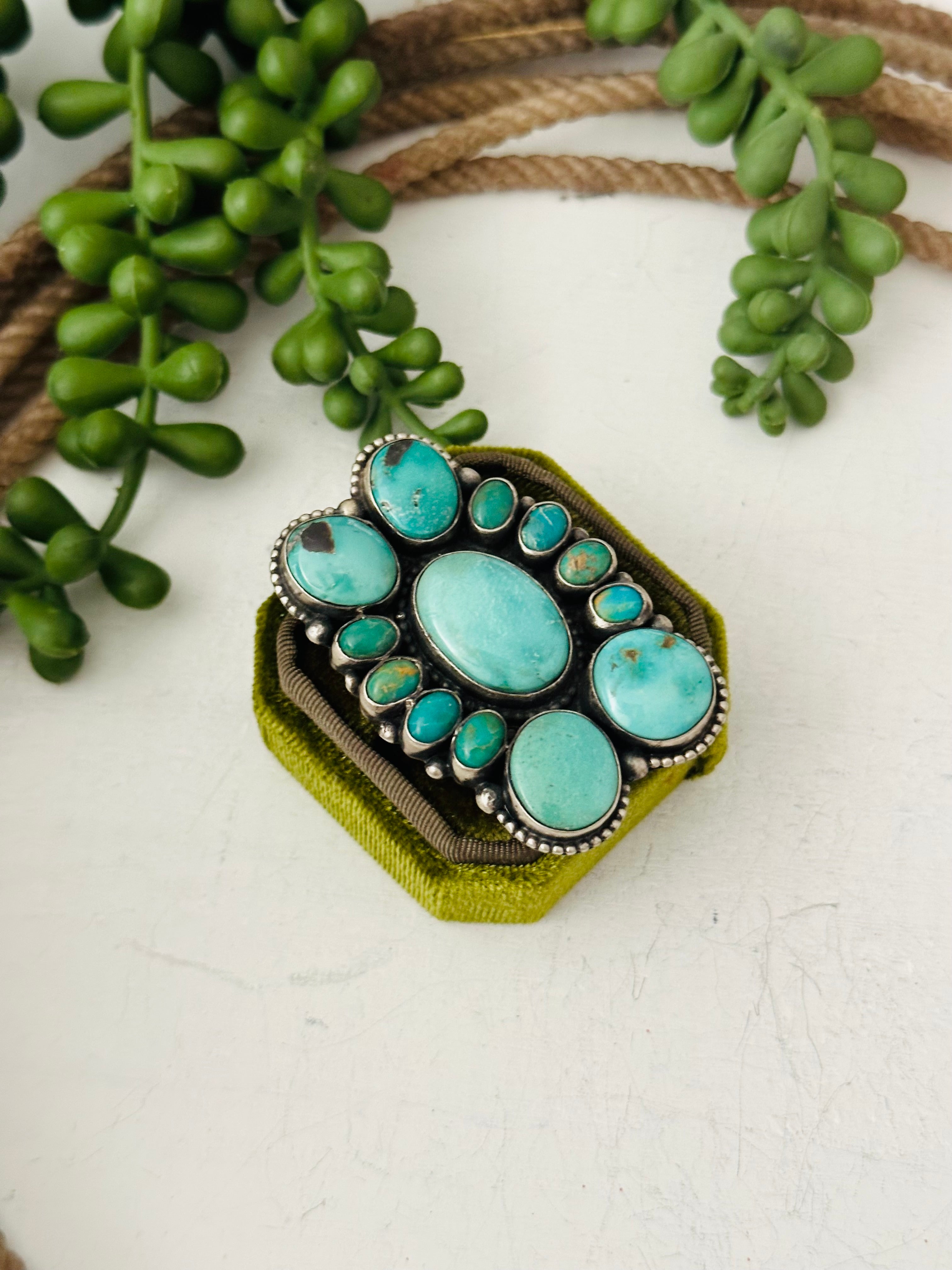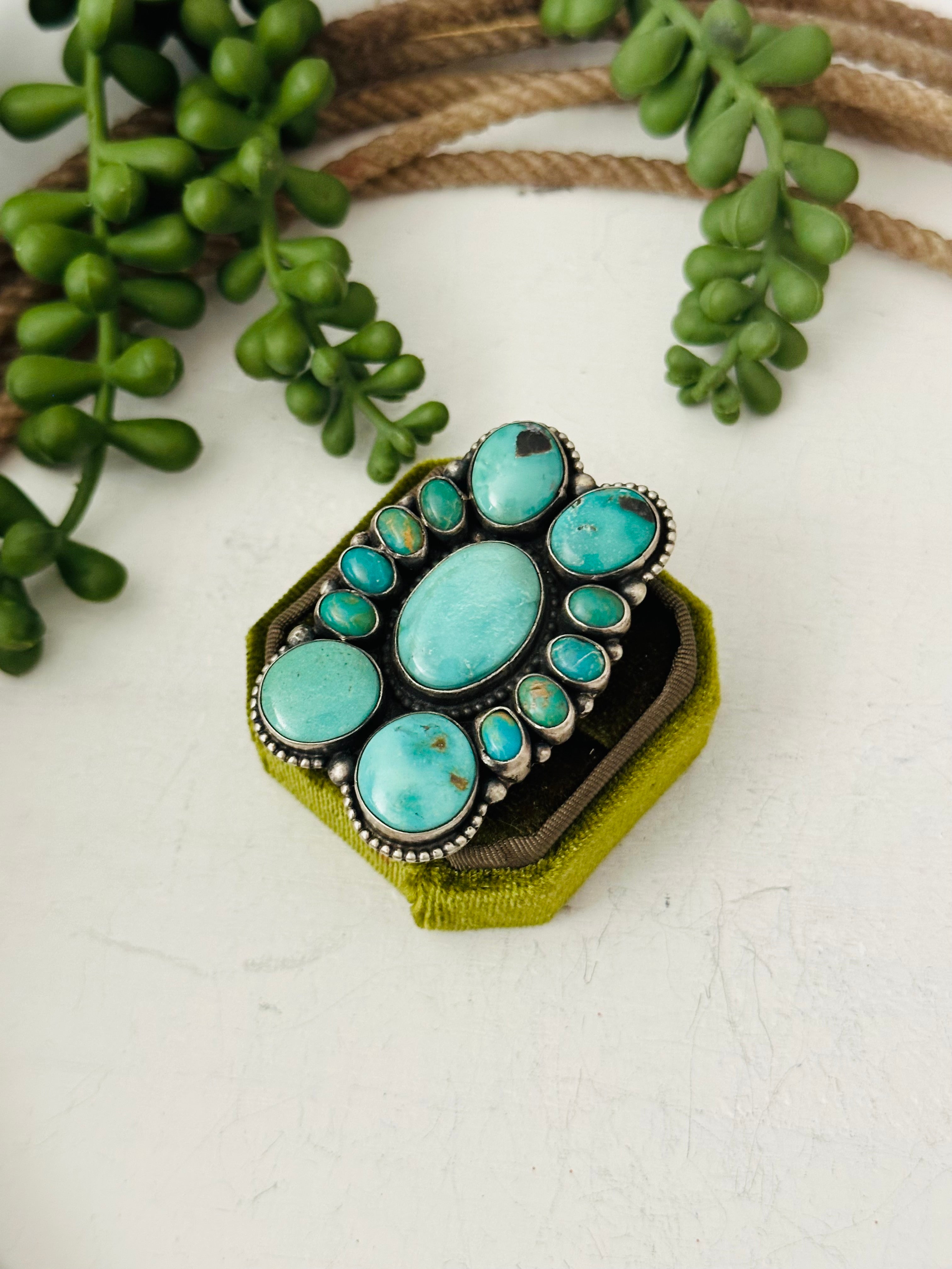 Sheila Tso Carico Lake Turquoise Sterling Silver Cluster Ring Size 6.25. It measures 2 1/4 inches long and 1 1/2 inches wide. Signed by the artist and stamped sterling silver.