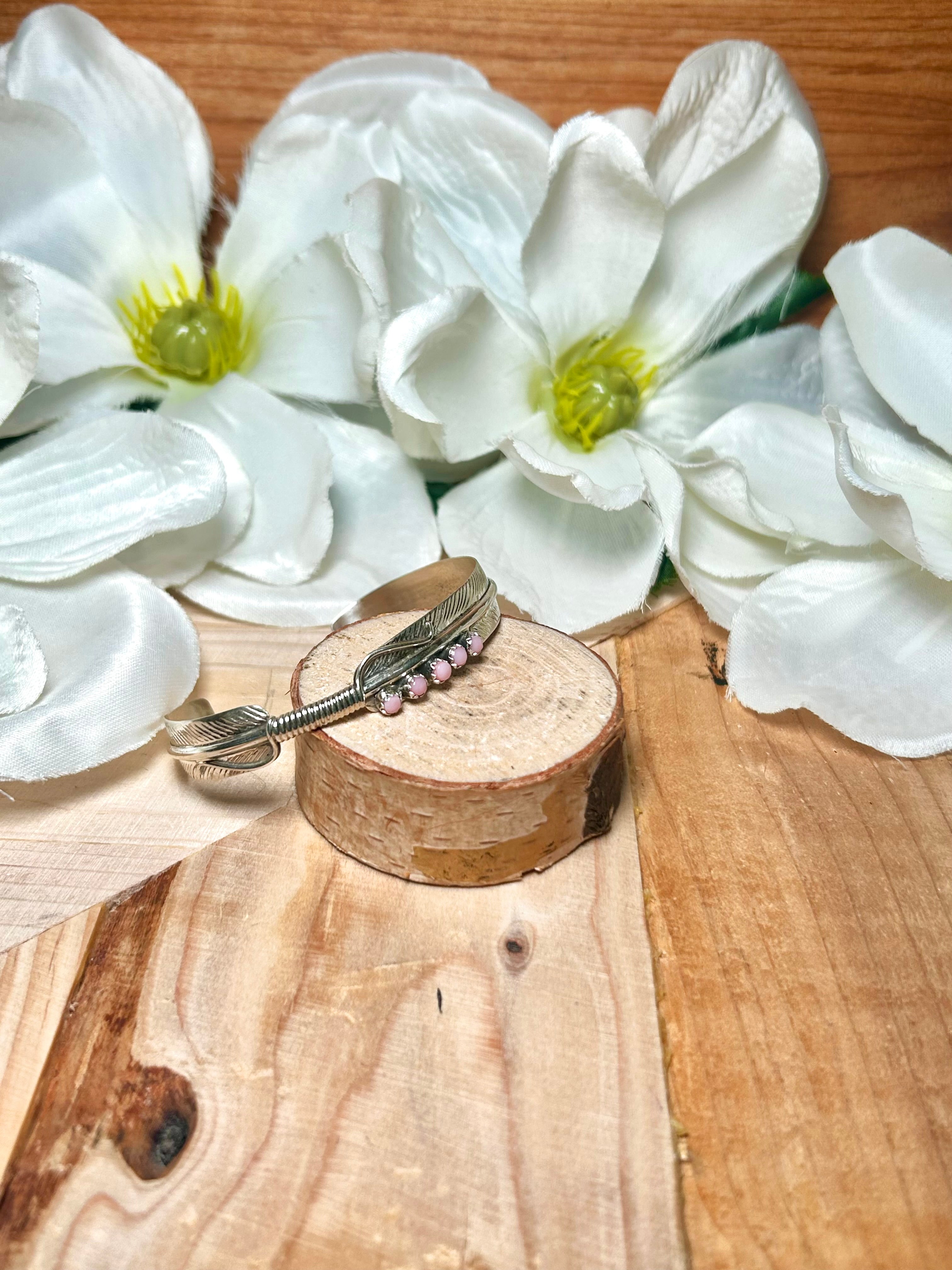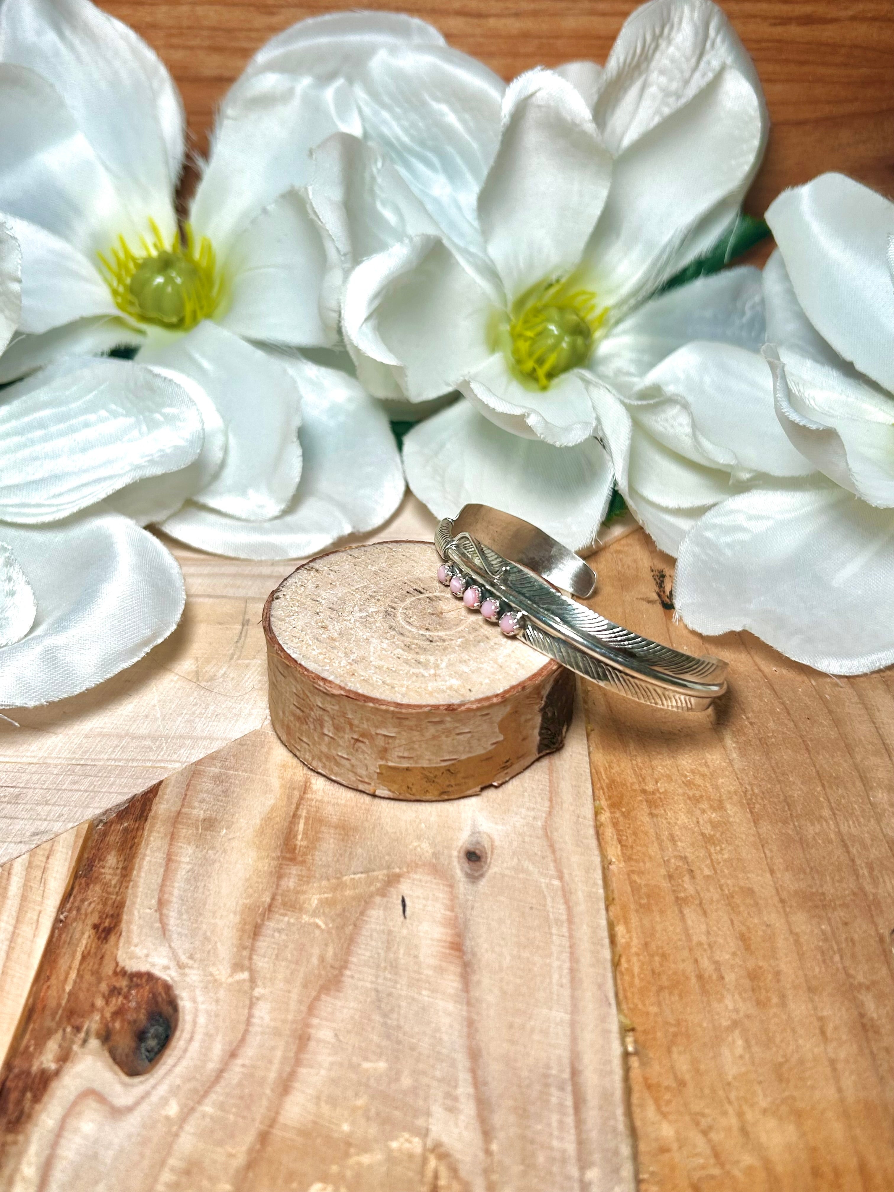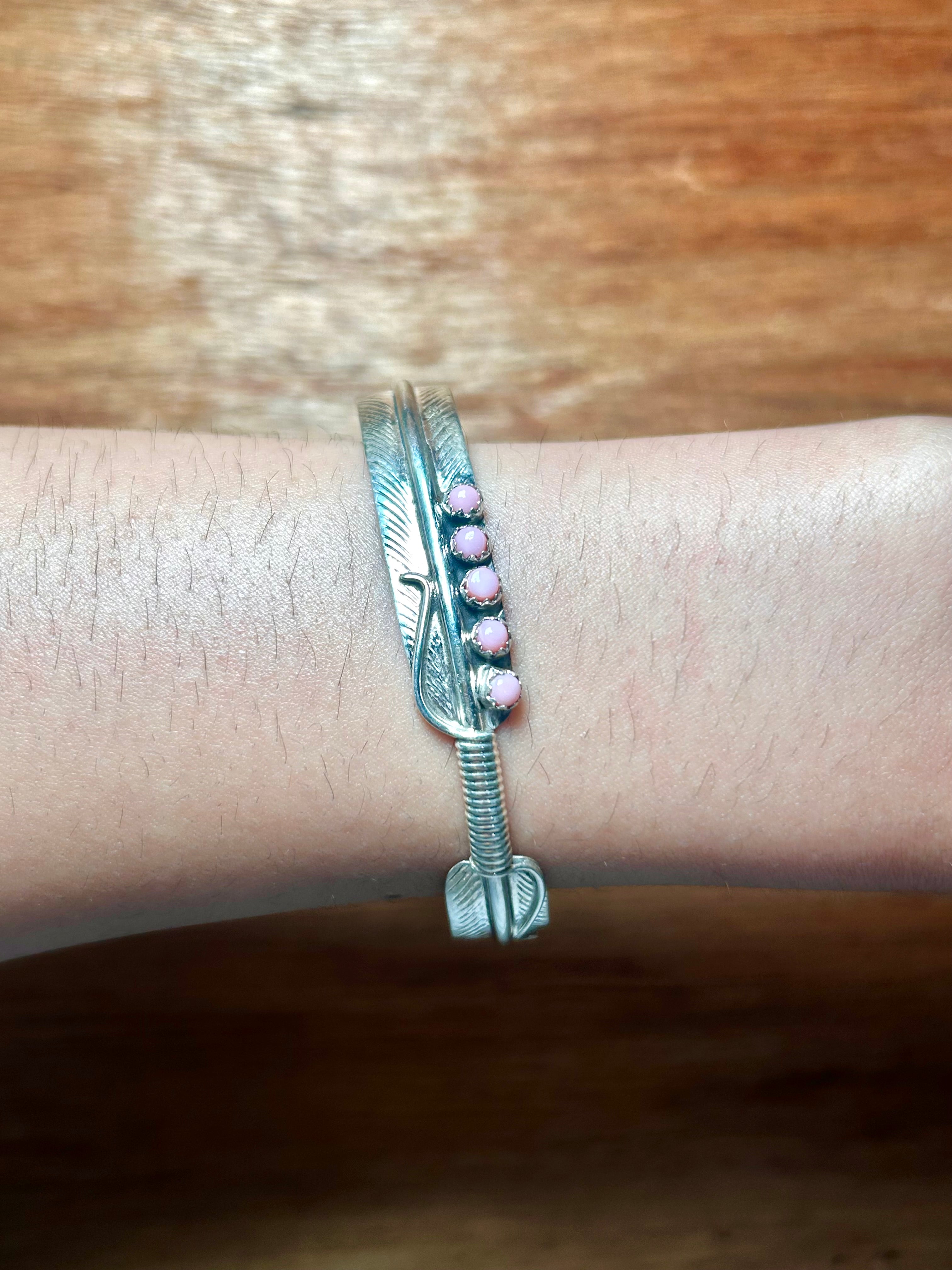 Aaron Davis Pink Conch & Sterling Silver Cuff Bracelet. It measures 3/8 of an inch wide with an inside circumference of 5 3/8 inches and a gap of 1 1/8 inches. Signed by the artist and stamped sterling silver.
