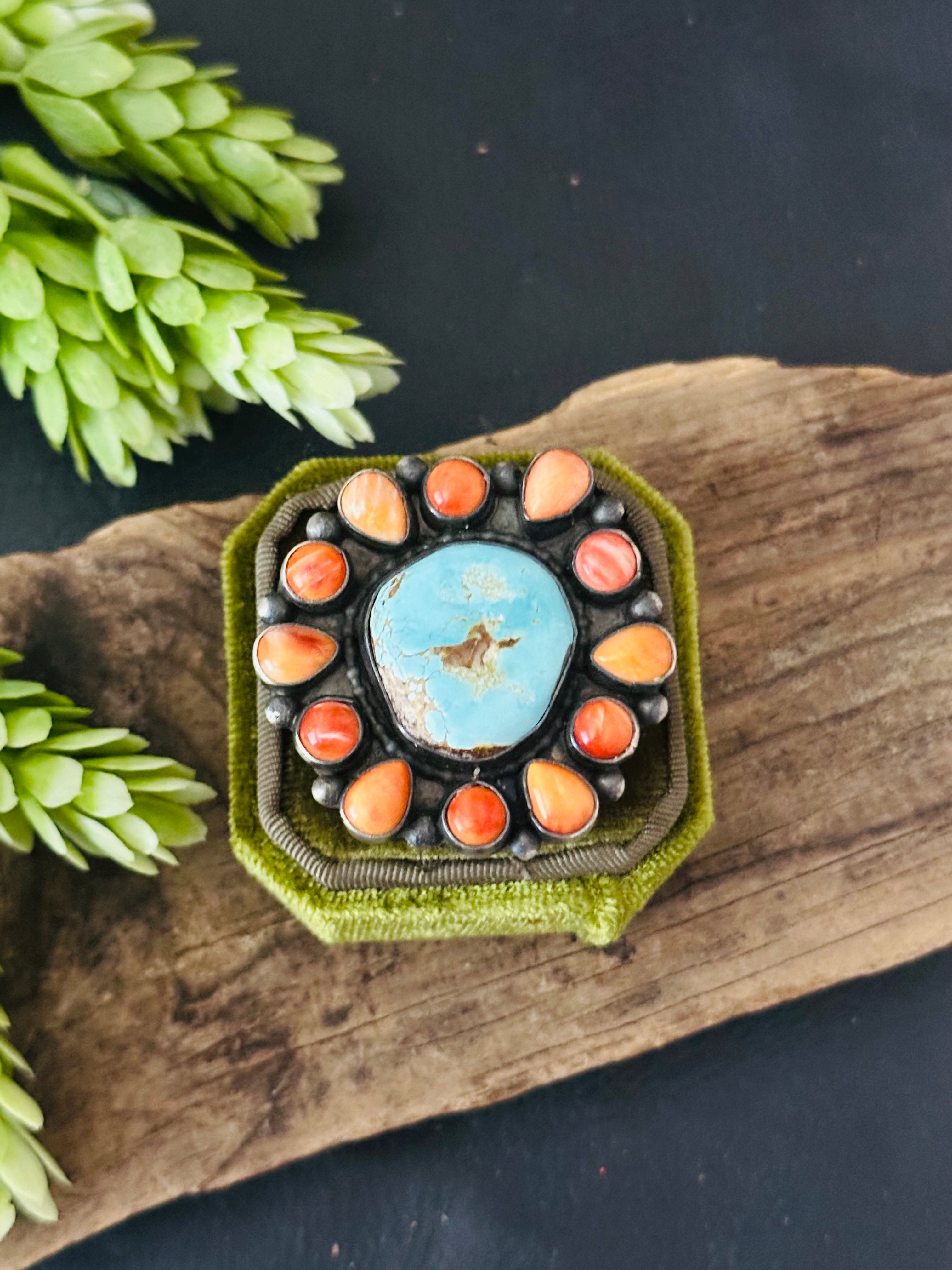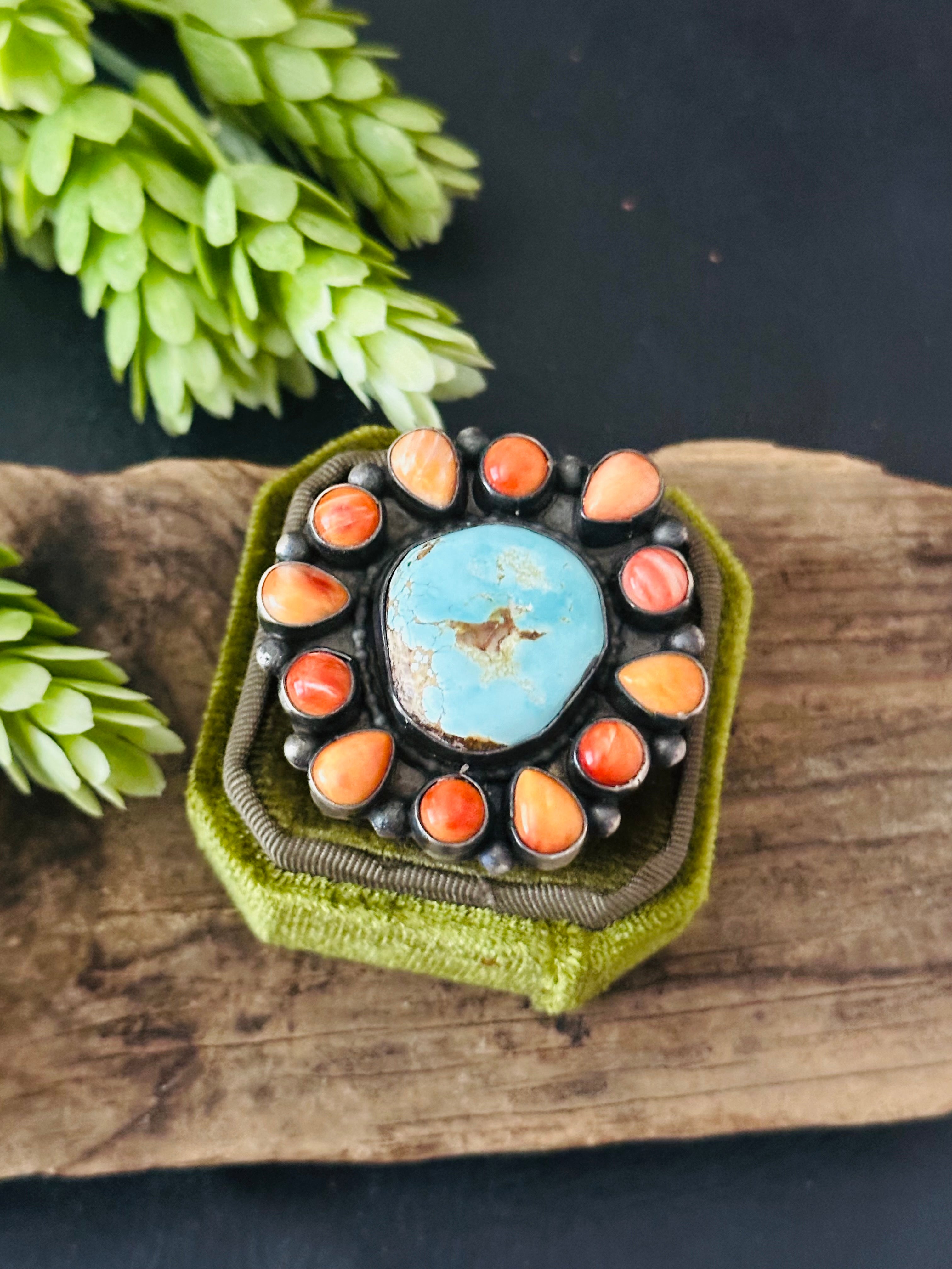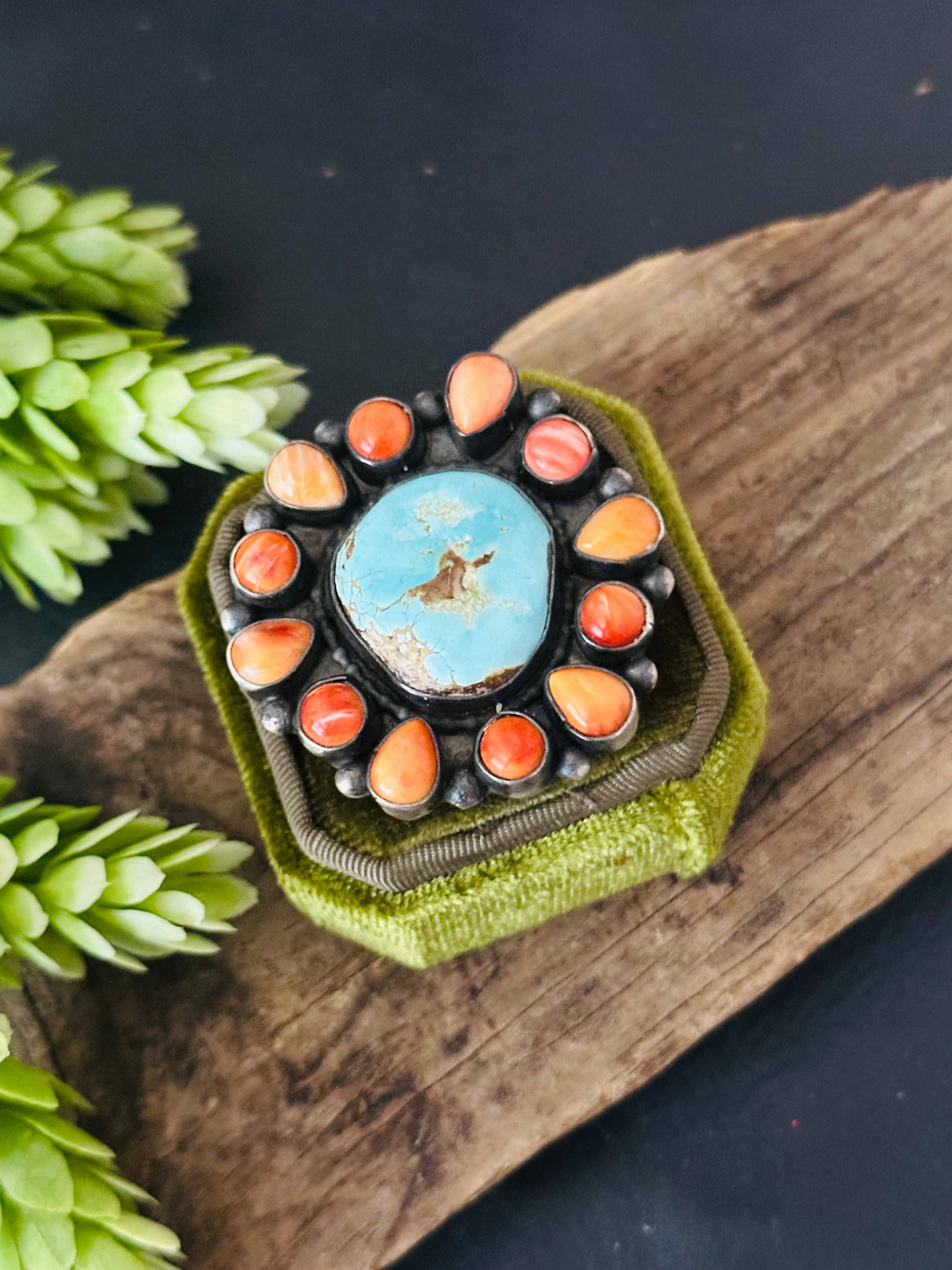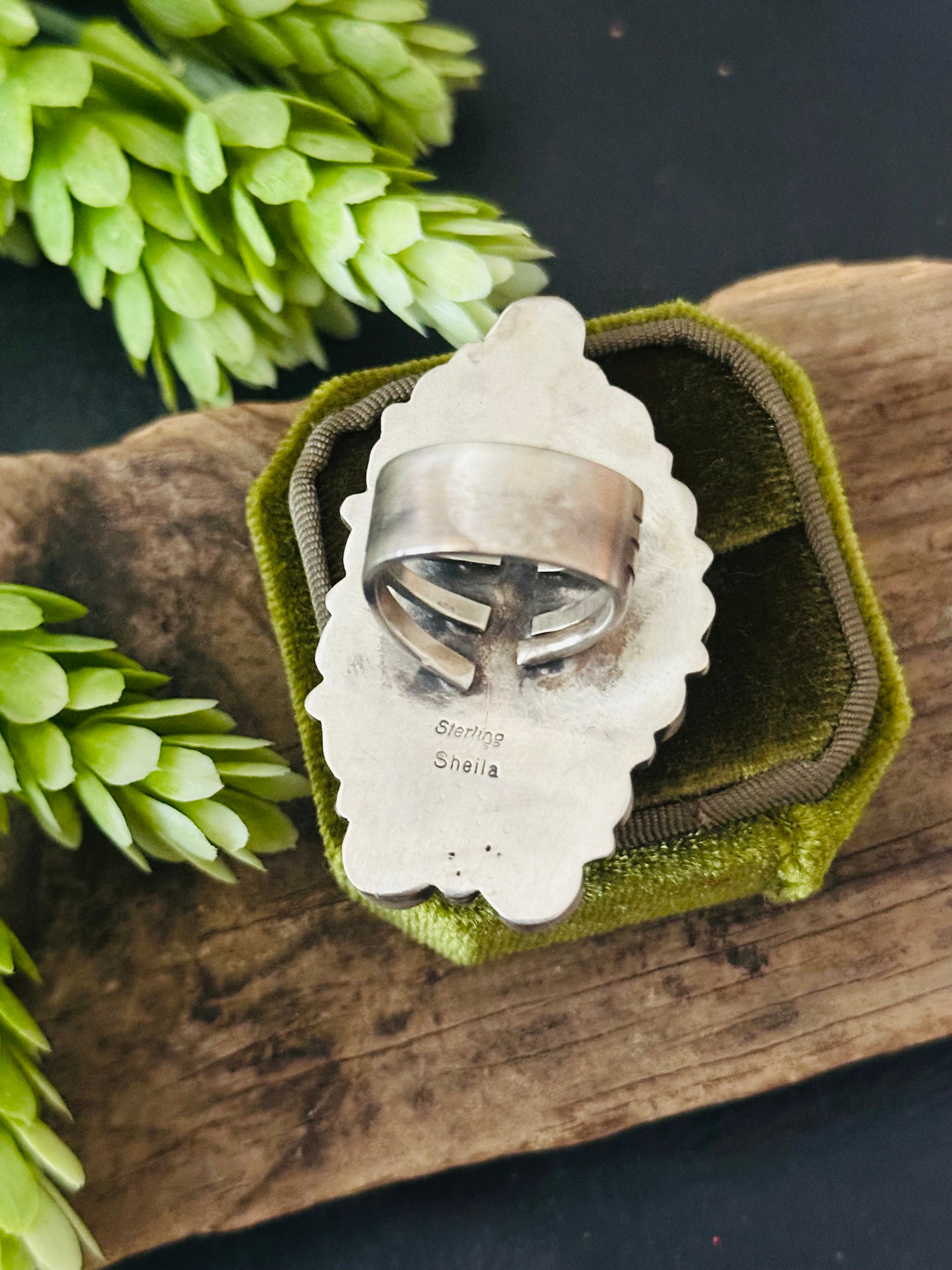 Beautiful ring. Shelia Becenti Multi Stone & Sterling Silver Ring Size 7.5. It measures 1 5/8 inches long and 1 1/2 inches wide. Stamped sterling silver and signed by artist.