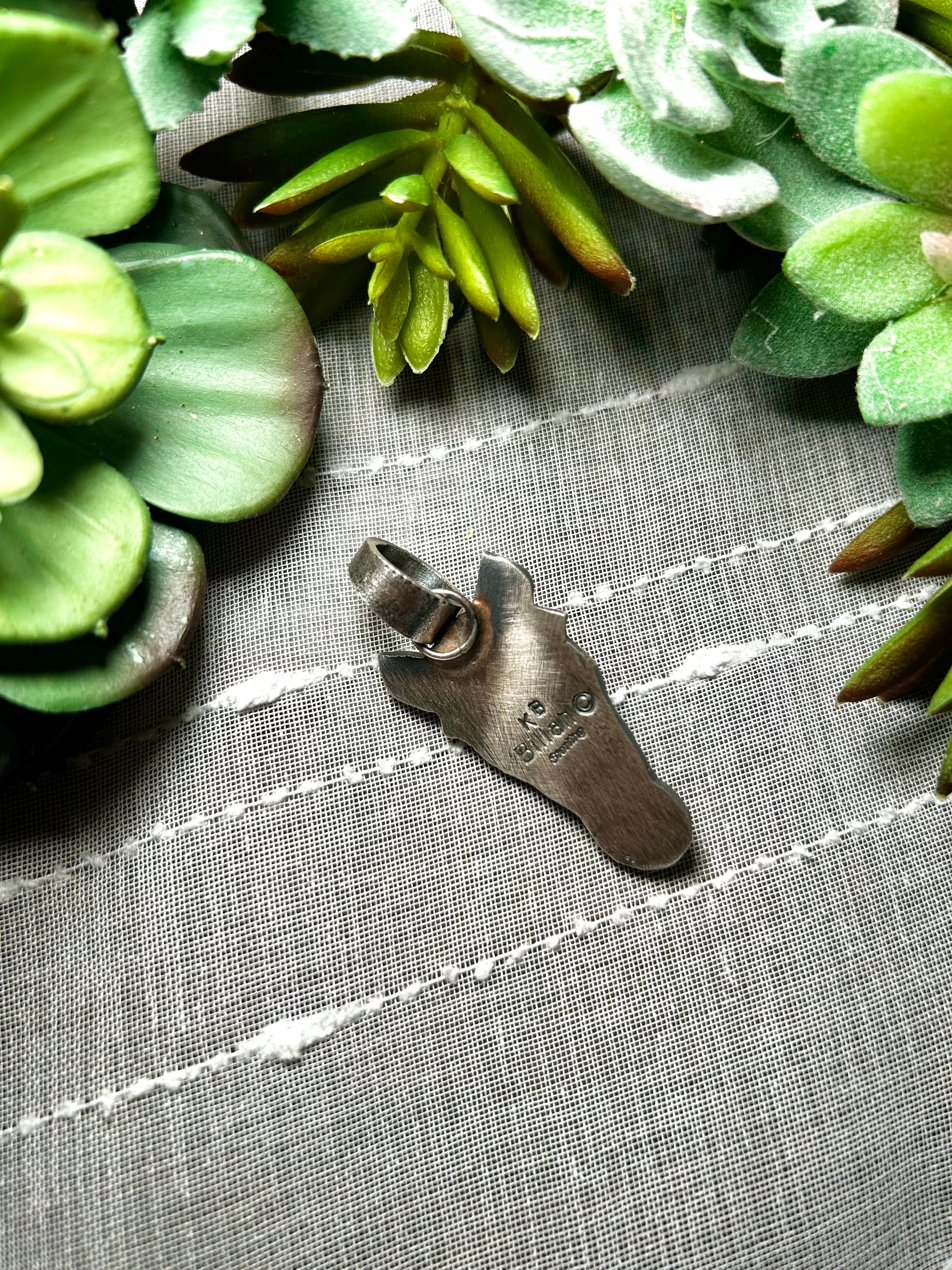 Kindale Billah Sonoran Mountain Turquoise & Sterling Silver Pendant. It measures 2 inches long and 7/8 of an inch wide. Pendant Only! Signed by the artist and stamped sterling silver.