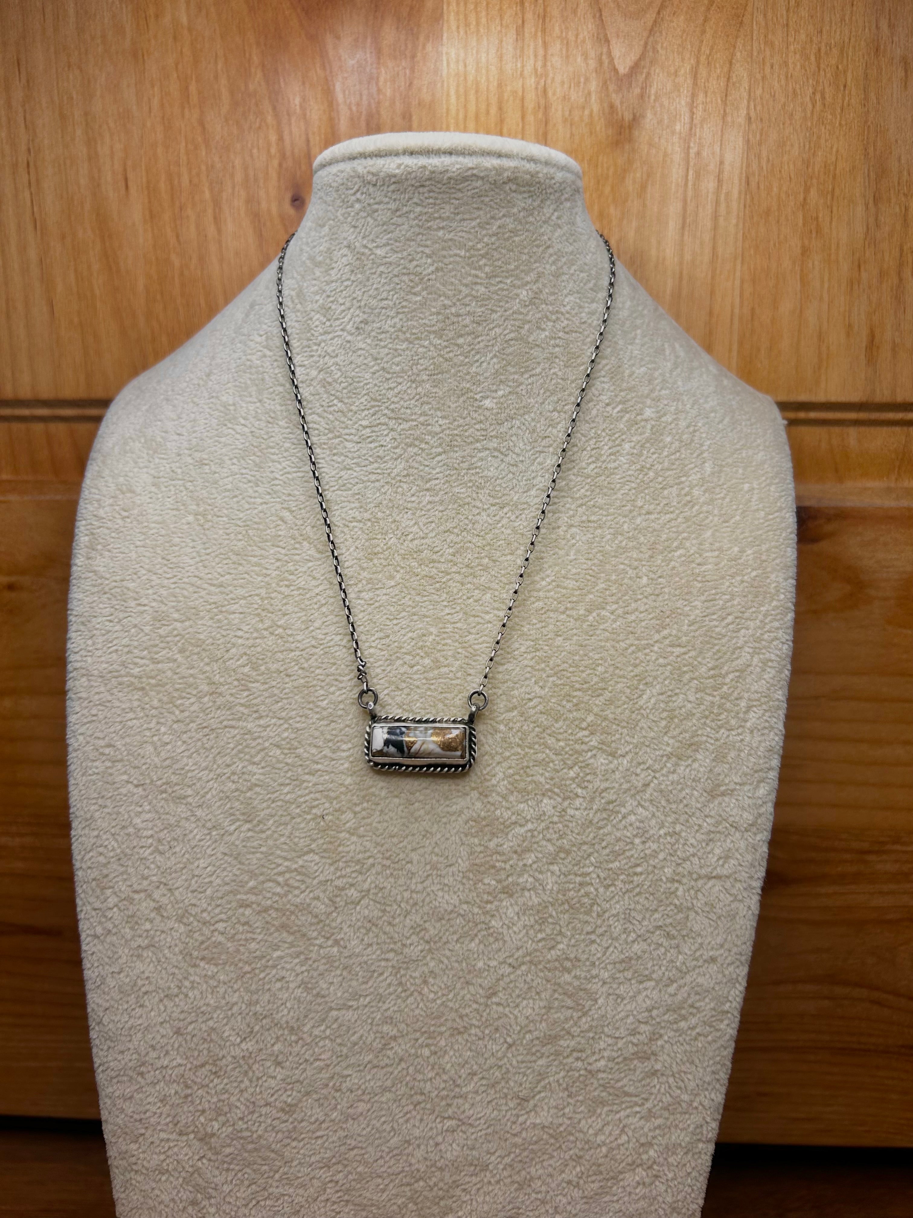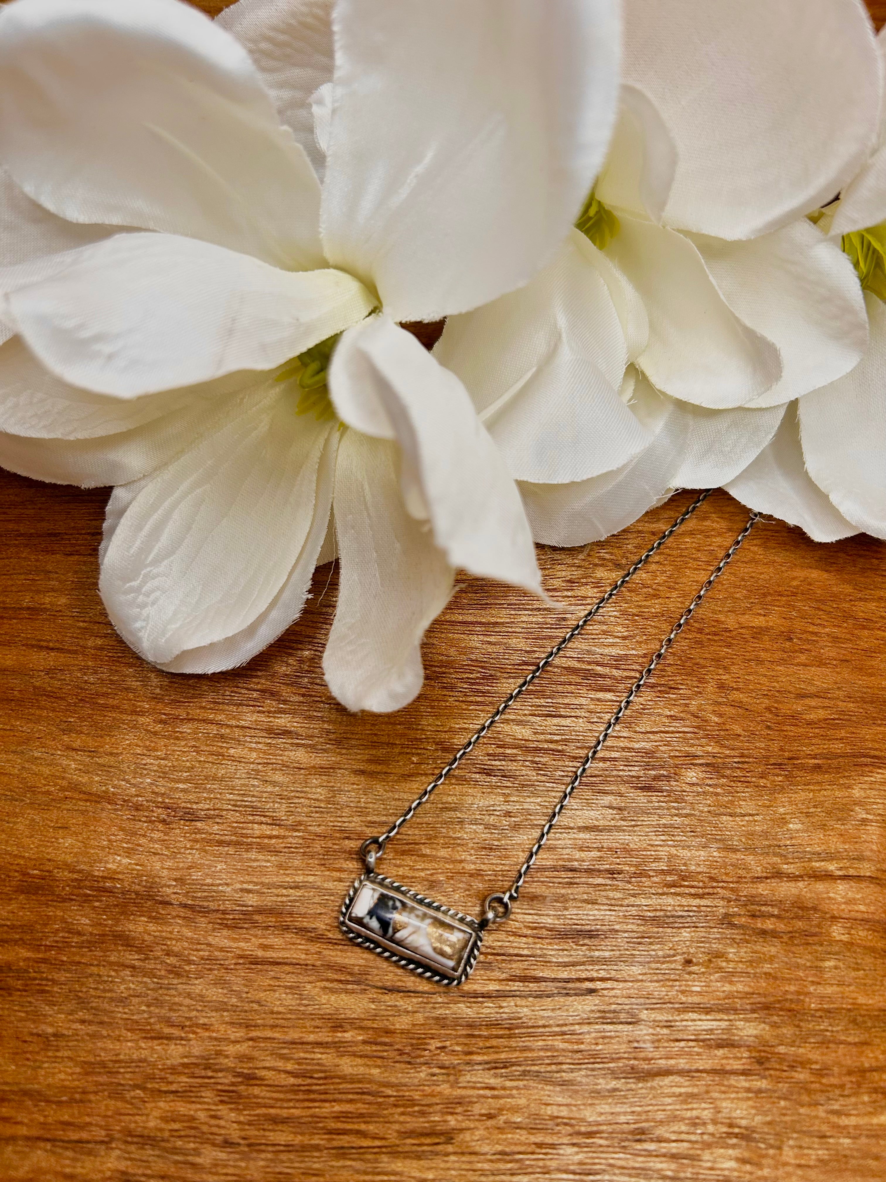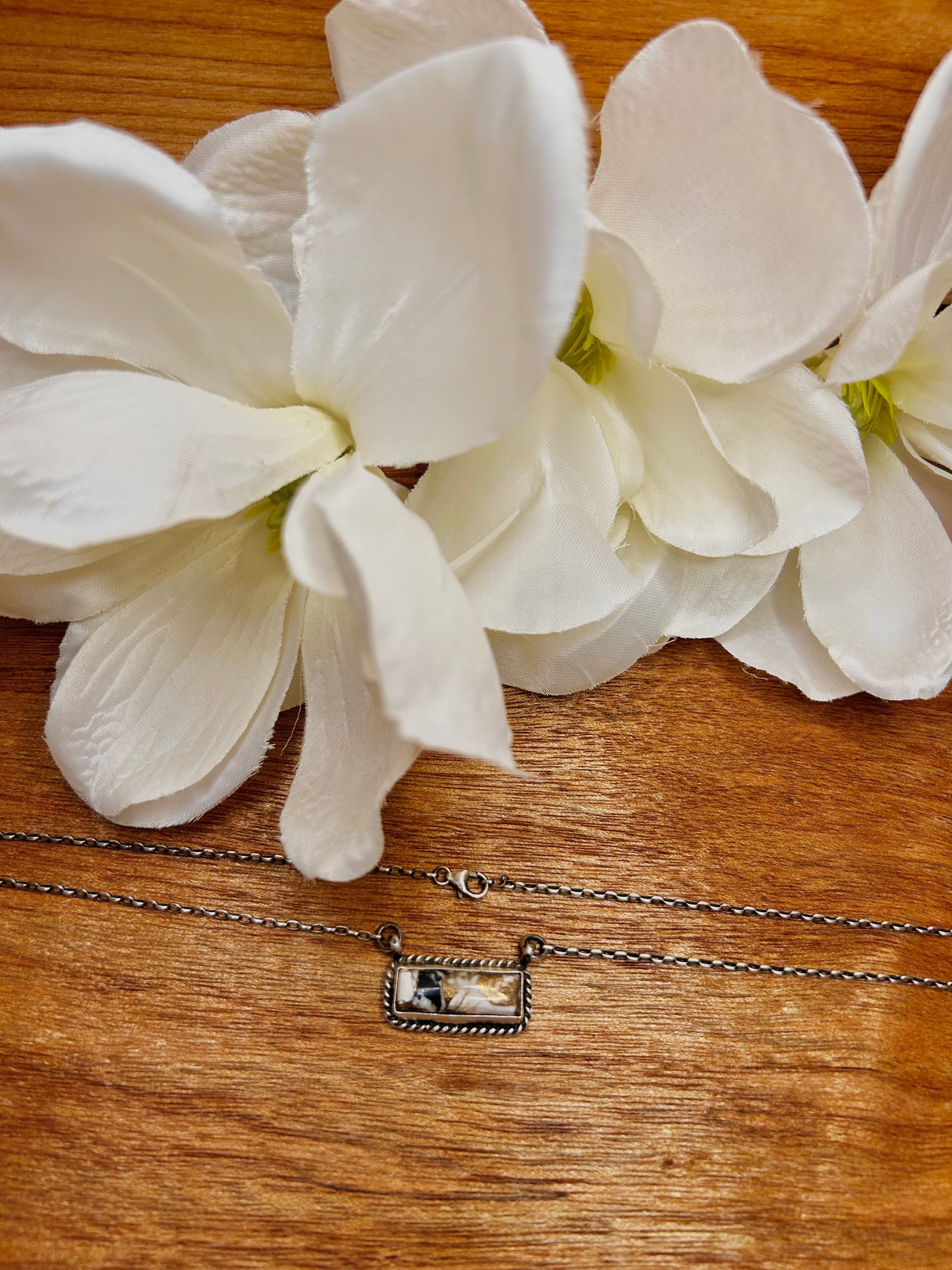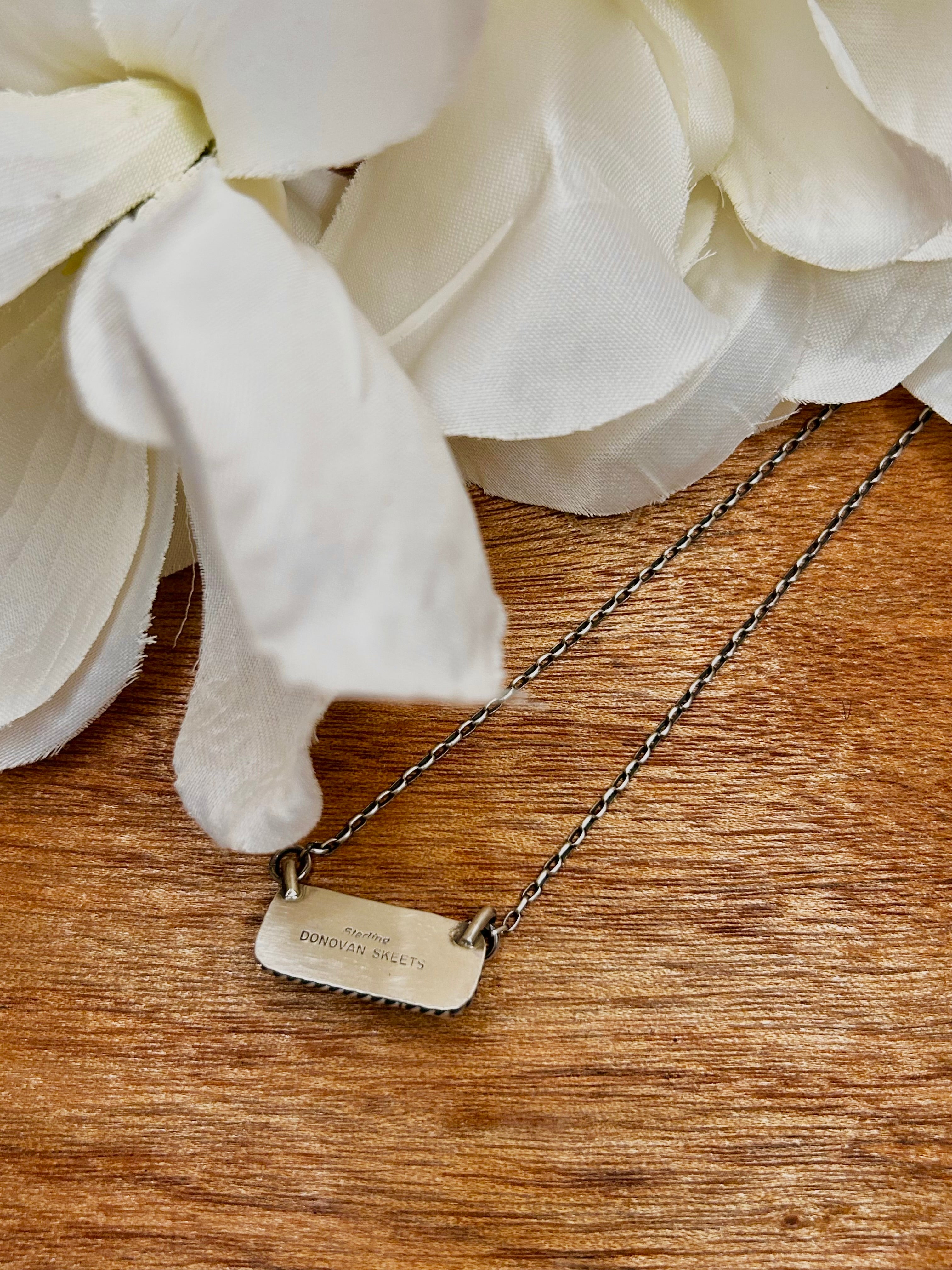 Donovan Skeets Navajo Made White Buffalo & Sterling Silver Bar Necklace. It measures 18 1/4 inches long with hang while the chain by itself measures 17 inches long. Signed by the artist and stamped sterling silver. Stones will differ due to natural stones.