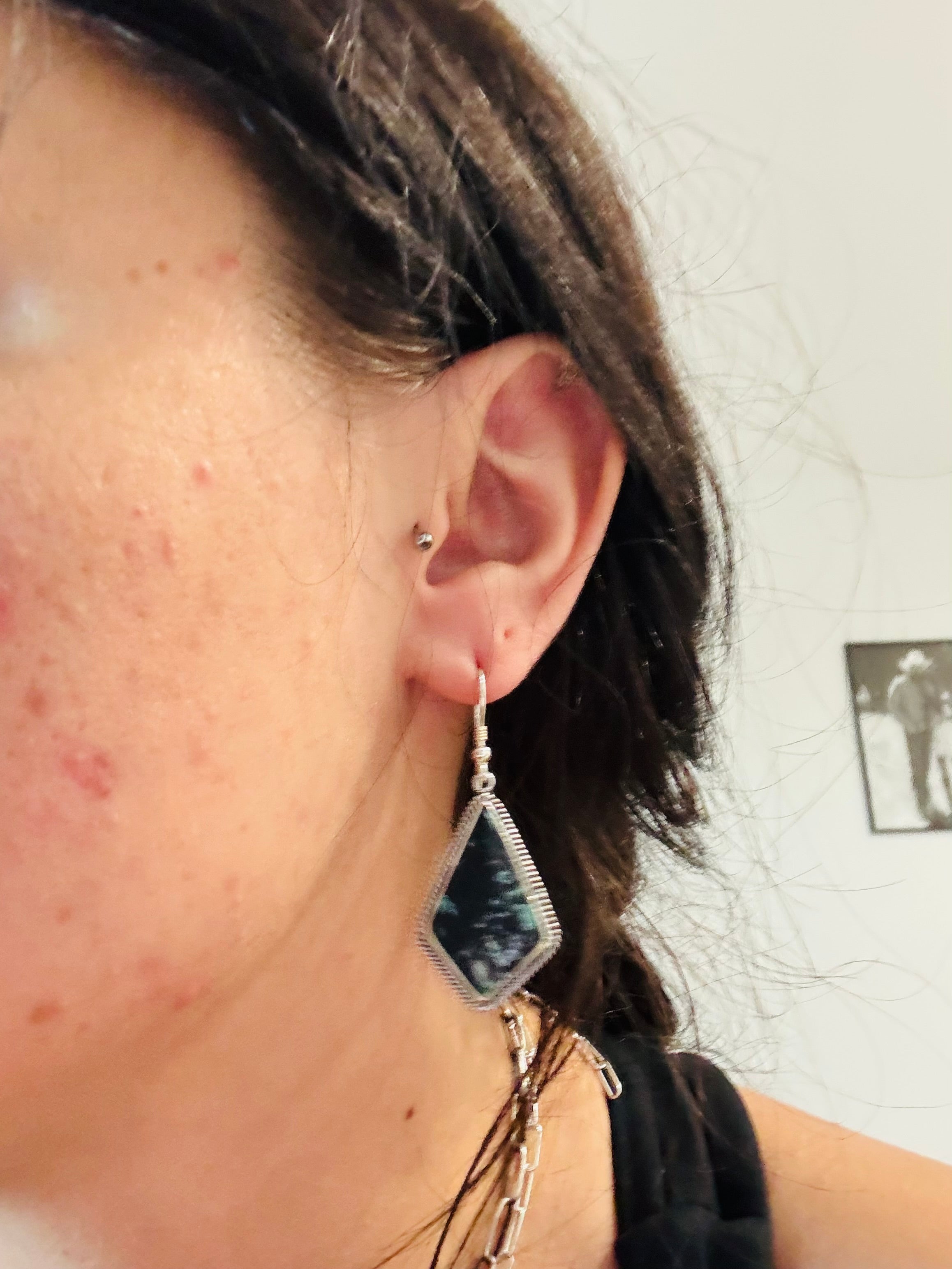 Southwest Handmade Black Jack Turquoise & Sterling Silver Dangle Earrings. They measure 1 7/8 inches long and 3/4 of an inch wide.