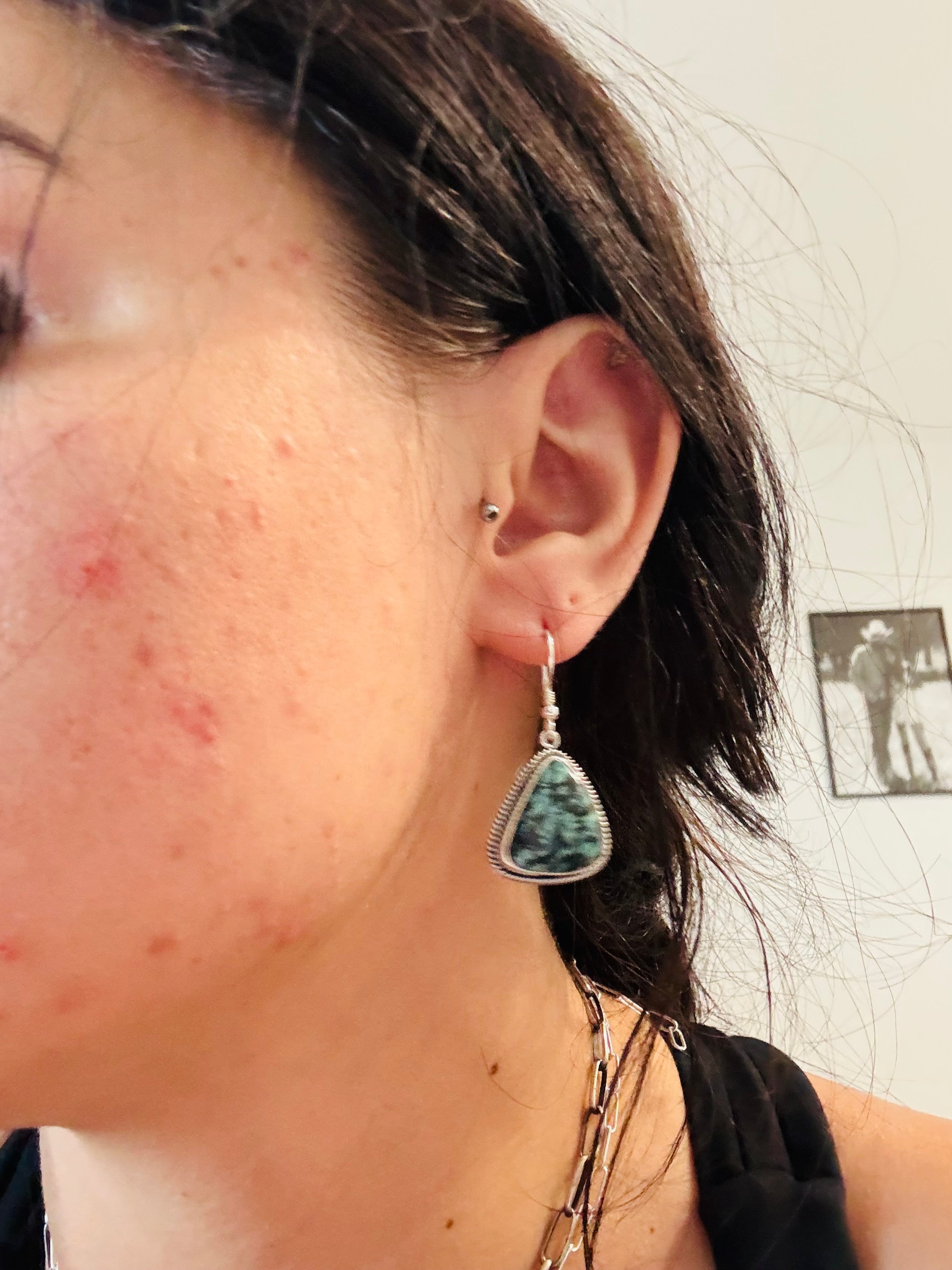 Southwest Handmade Emerald Rose Variscite & Sterling Silver Dangle Earrings. They measure 1 1/2 inches long and 3/4 of an inch wide.