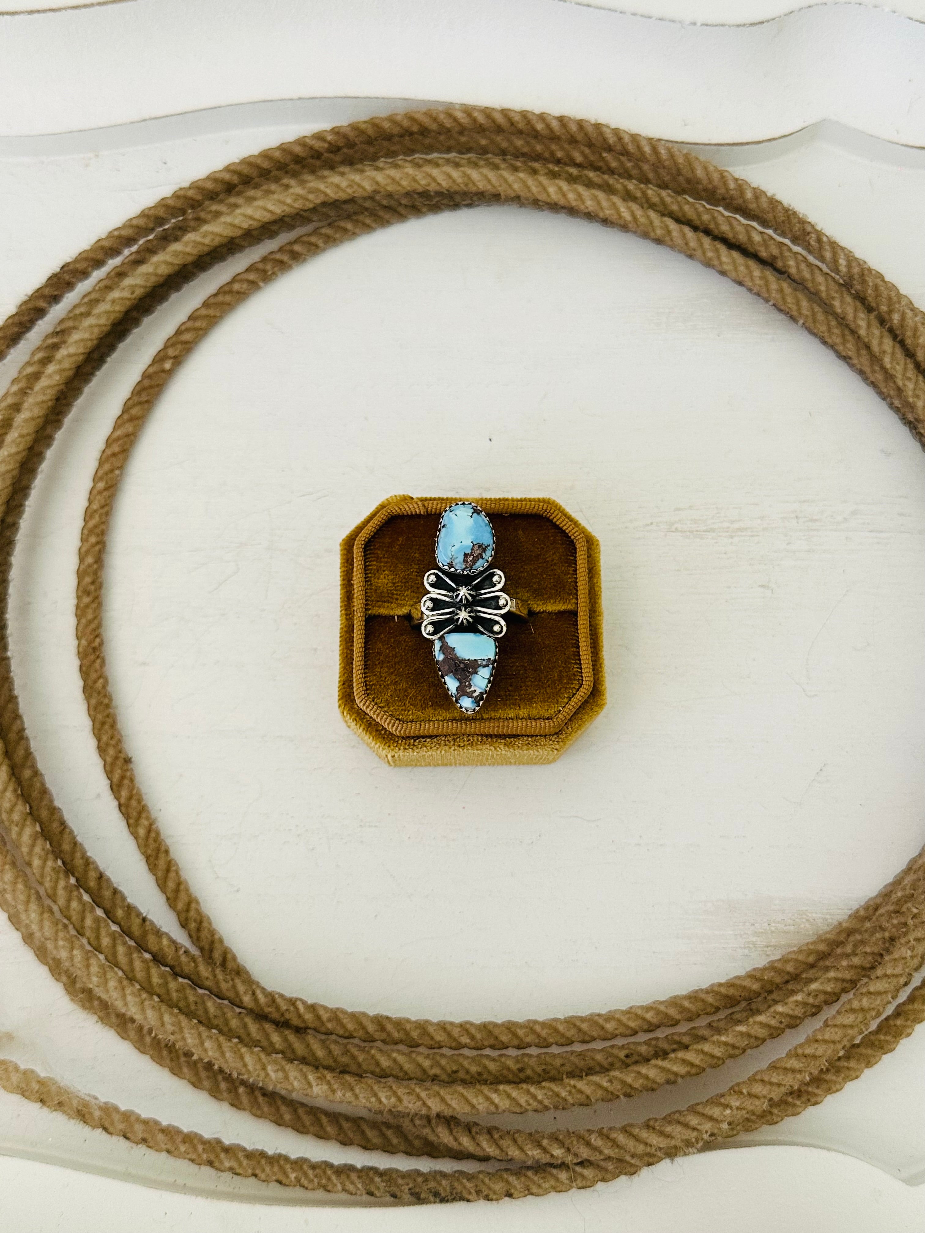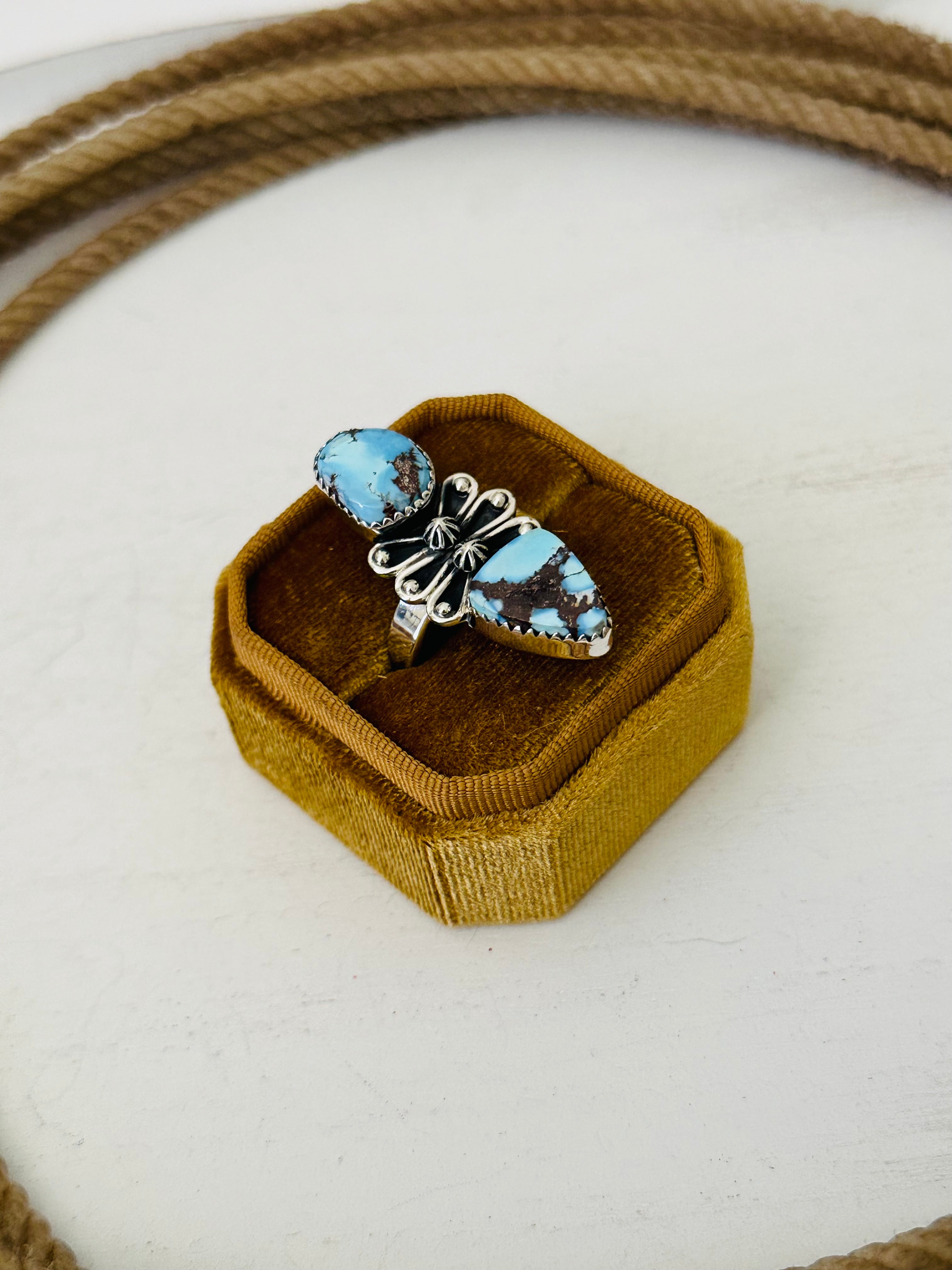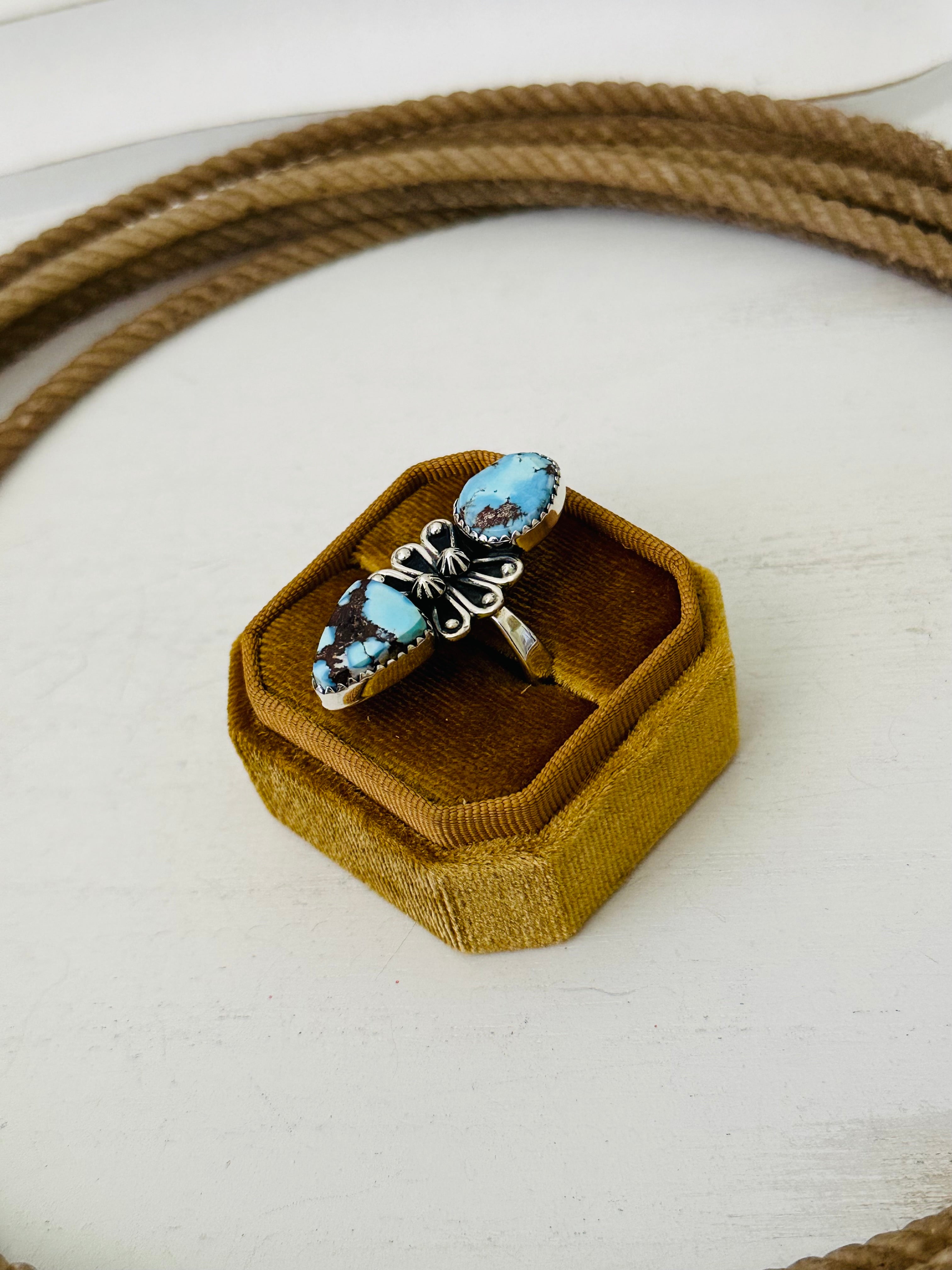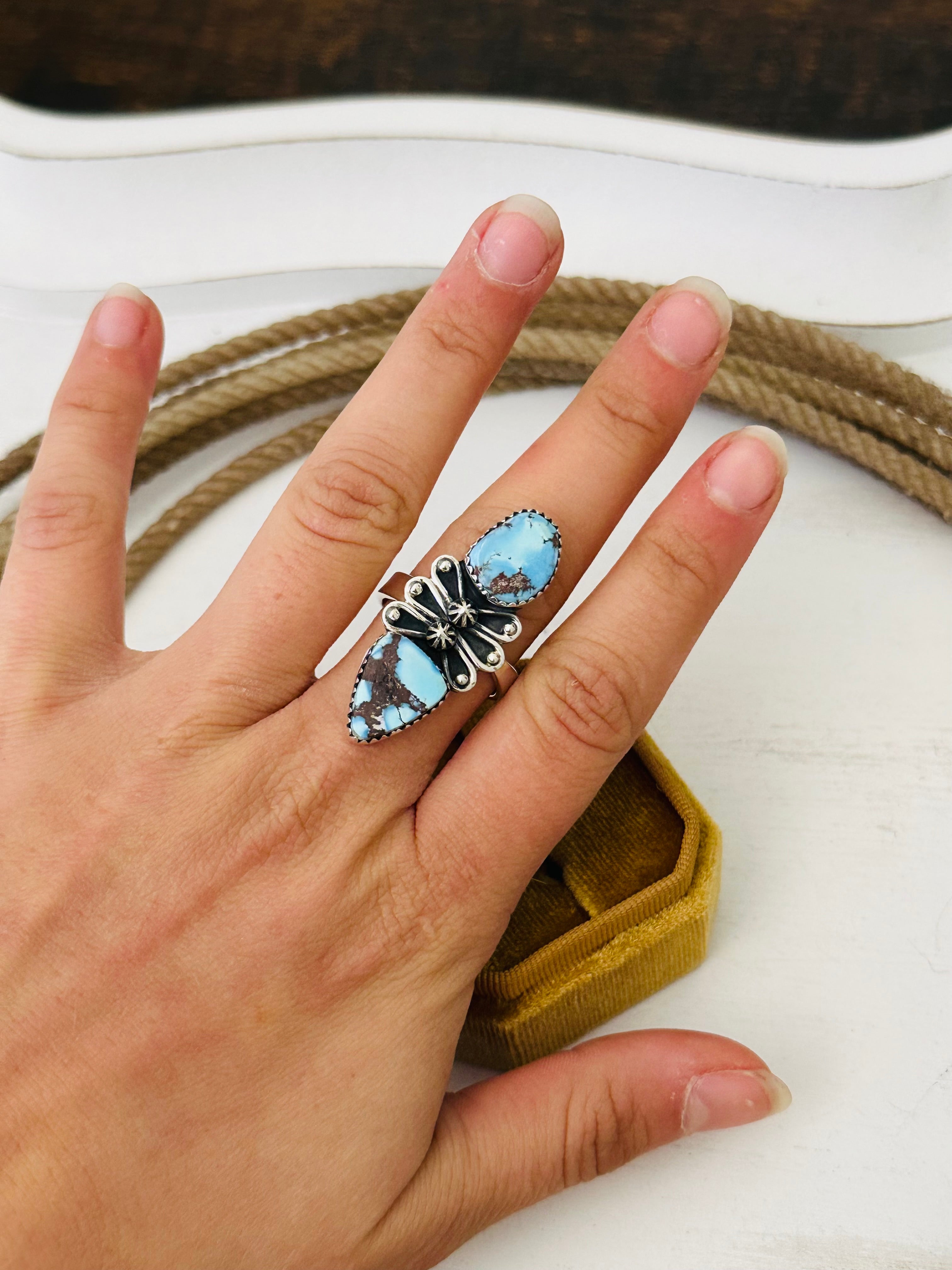 Beautiful ring. Southwest Handmade Golden Hills Turquoise & Sterling Silver Adjustable Ring. It measures 1 1/2 inches long and 5/8 of an inch wide. Signed by the artist and stamped sterling silver.