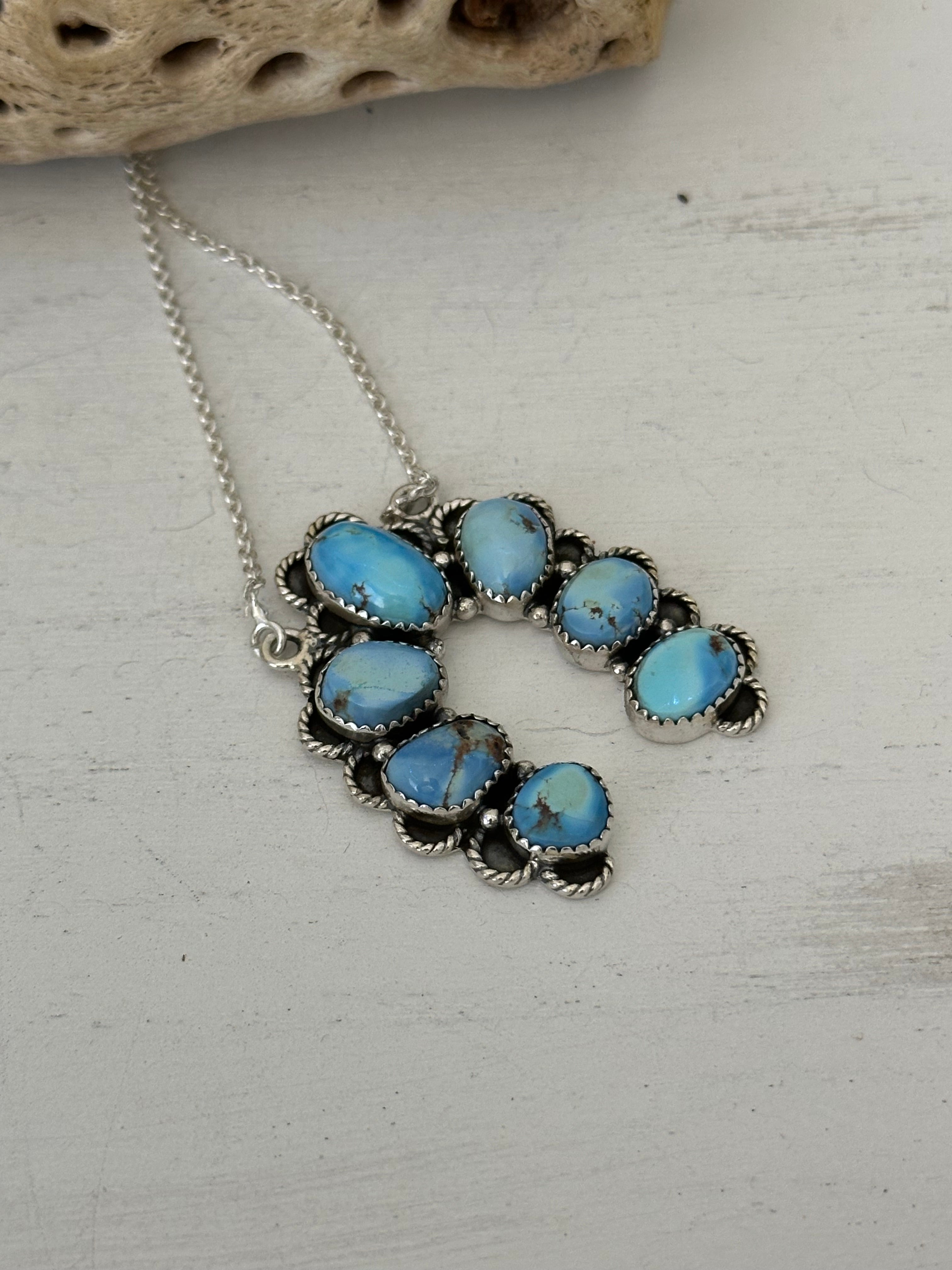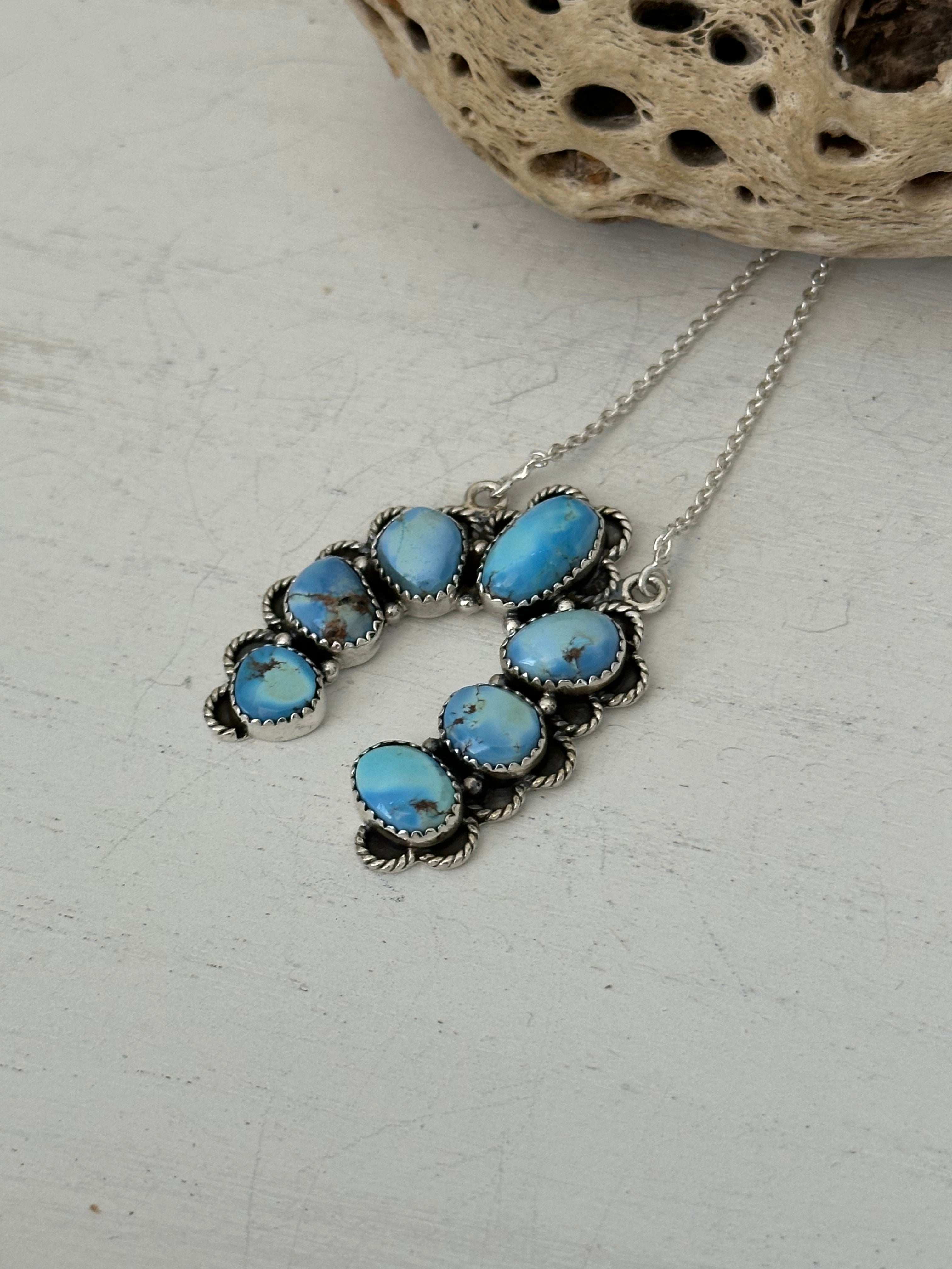 Beautiful necklace. Southwest Handmade Golden Hills Turquoise & Sterling Silver Cluster Naja Necklace. It measures 22 inches long with hang while the chain by itself measures 19 inches long but can be adjusted down to 16 1/2 inches long. Signed by the artist and stamped sterling silver.