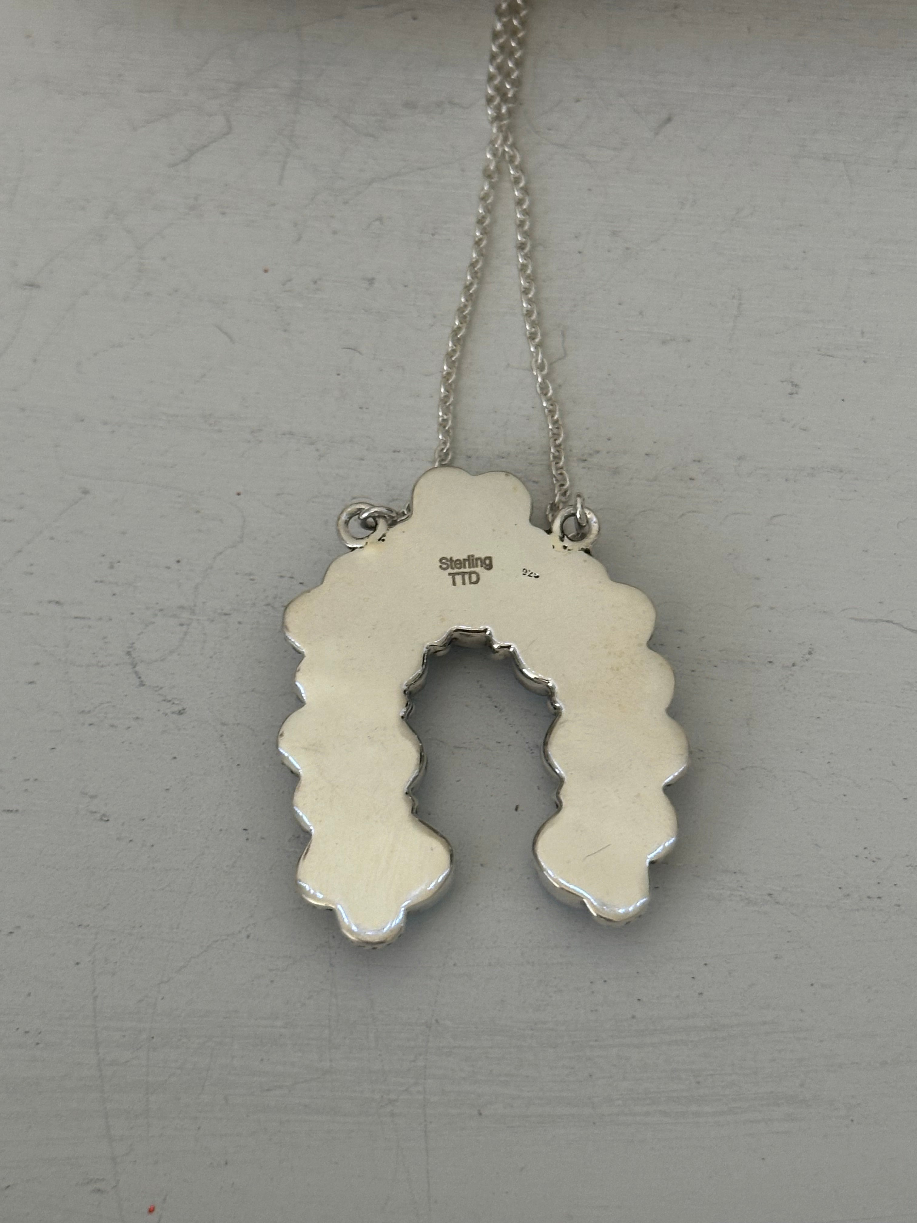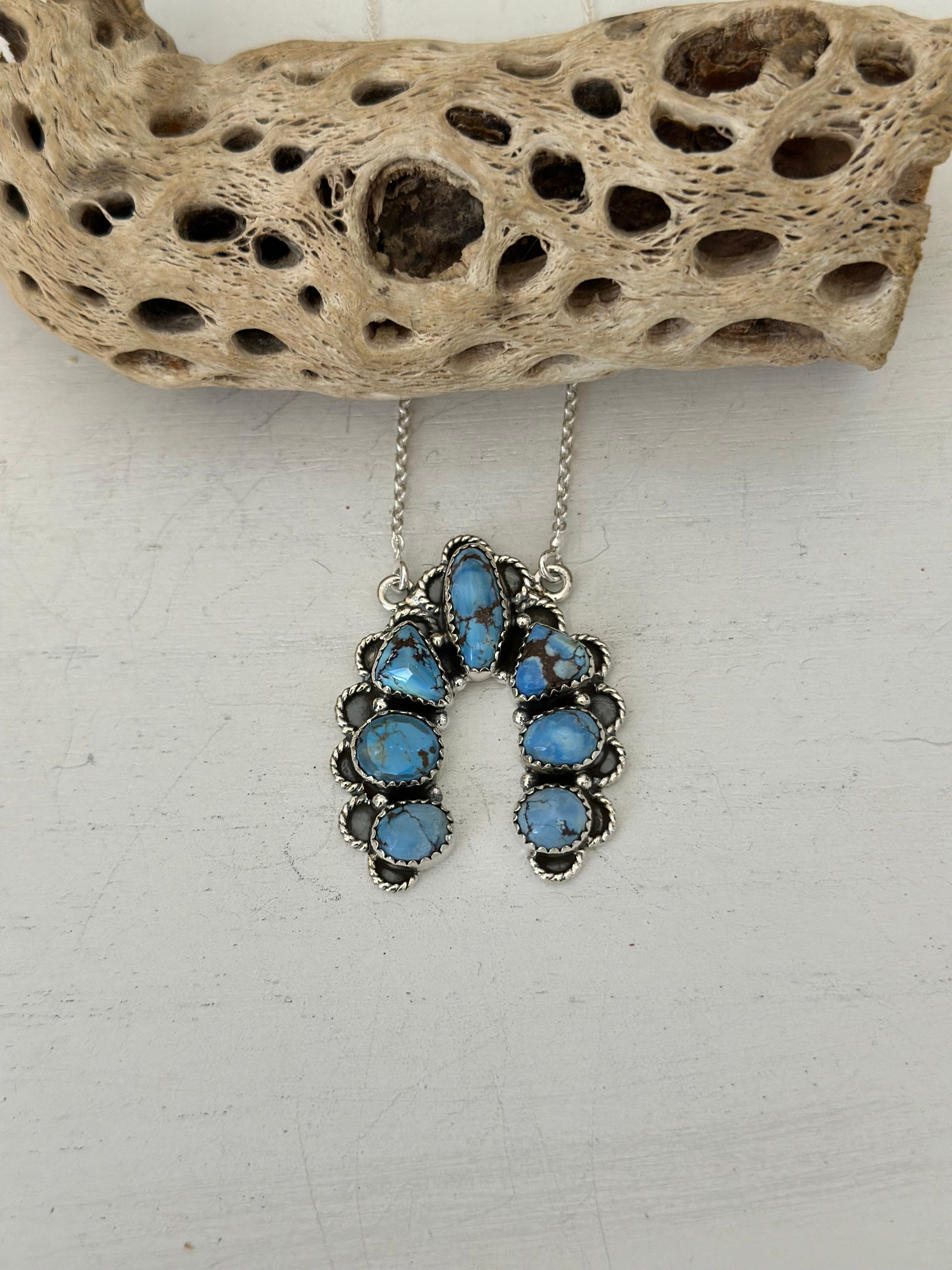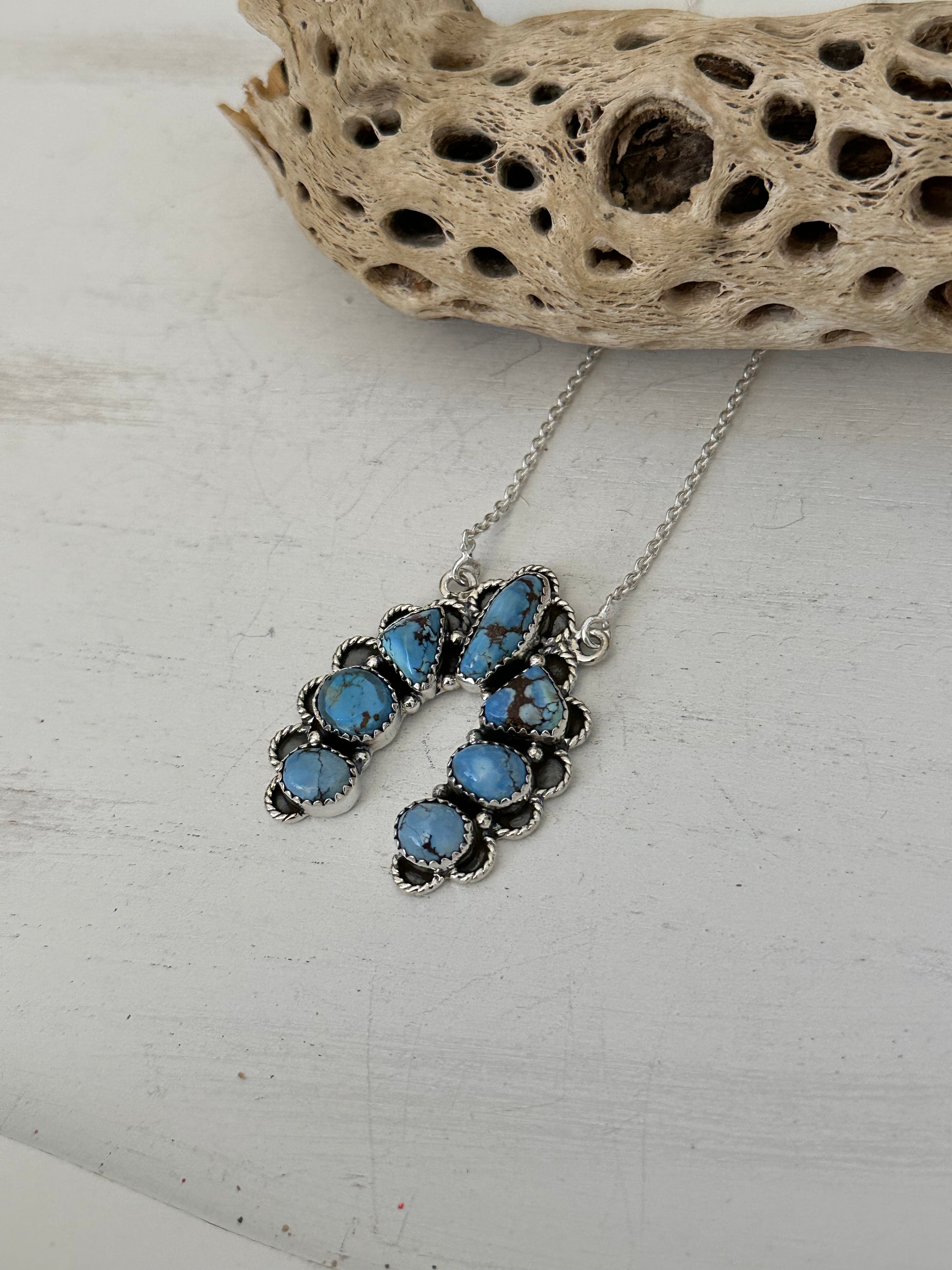 Beautiful necklace. Southwest Handmade Golden Hills Turquoise & Sterling Silver Cluster Naja Necklace. It measures 22 inches long with hang while the chain by itself measures 19 inches long but can be adjusted down to 16 1/2 inches long. Signed by the artist and stamped sterling silver.