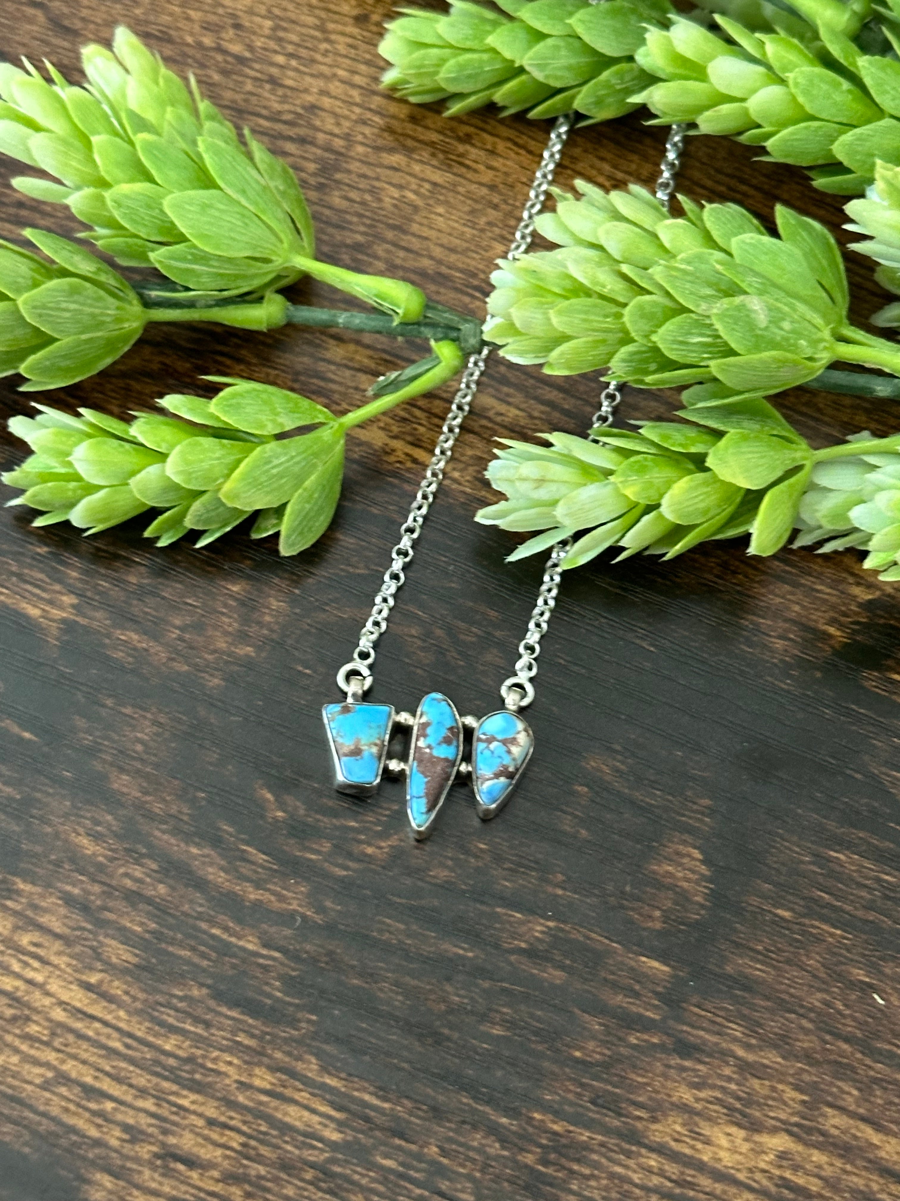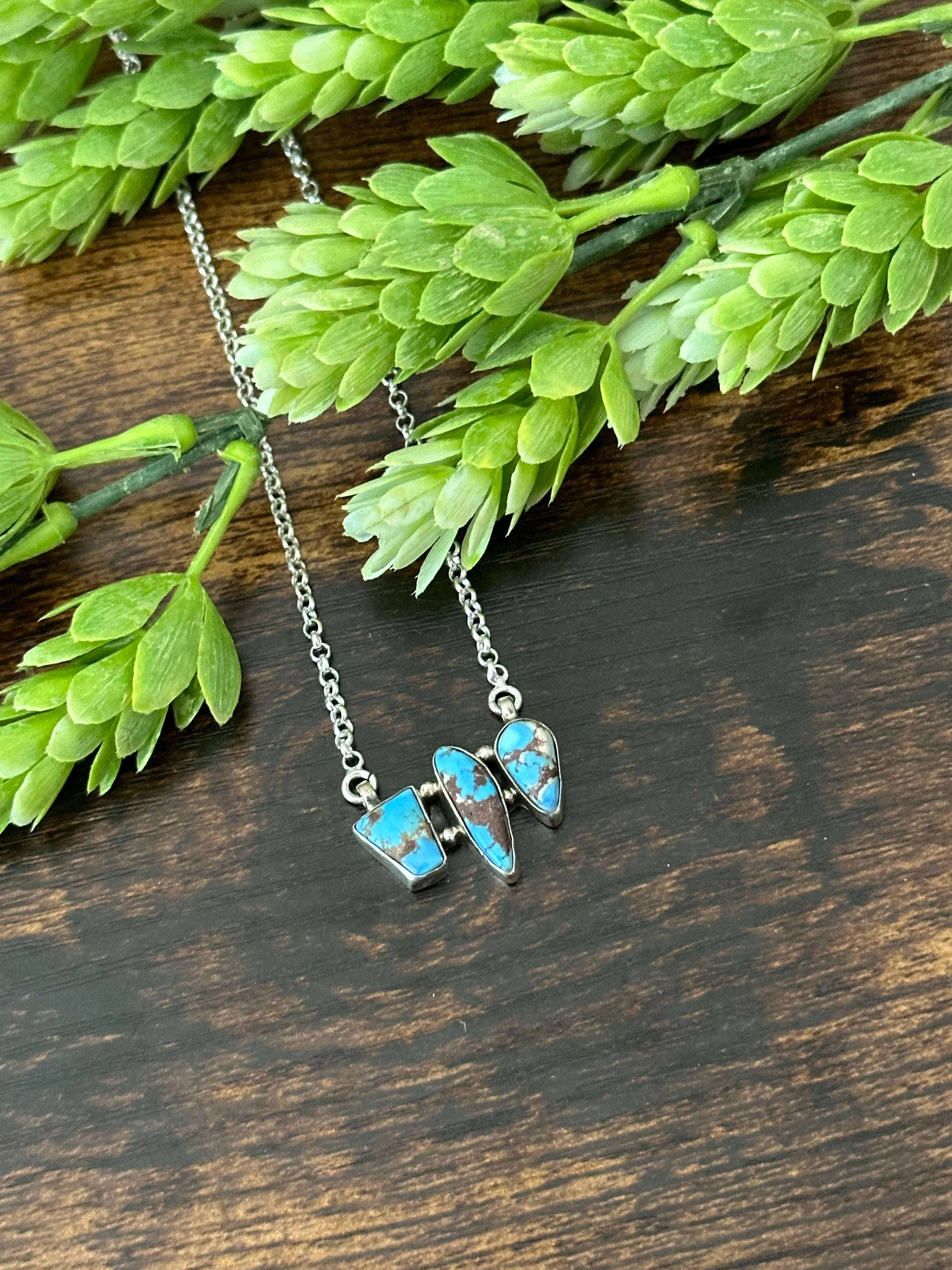 Beautiful necklace. Southwest Handmade Golden Hills Turquoise & Sterling Silver Cluster Necklace. It measures 18 inches long with hang while the chain by itself measures 17 inches long but can be adjusted down. Signed by the artist and stamped sterling silver.