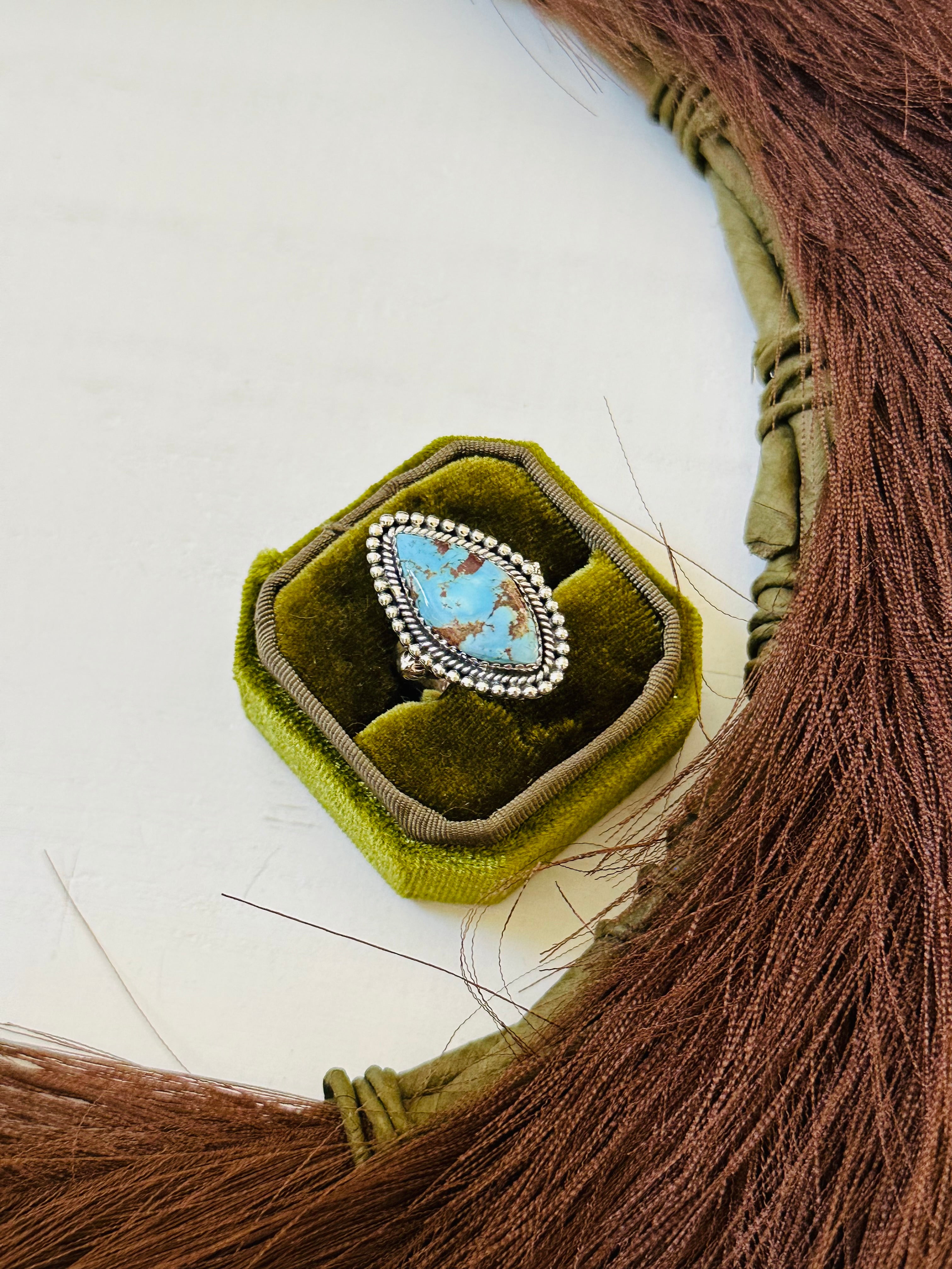 Beautiful ring. Southwest Handmade Golden Hills Turquoise & Sterling Silver Ring Size 7.75. It measures 1 1/4 inches long and 3/4 of an inch wide. Signed by the artist and stamped sterling silver.
