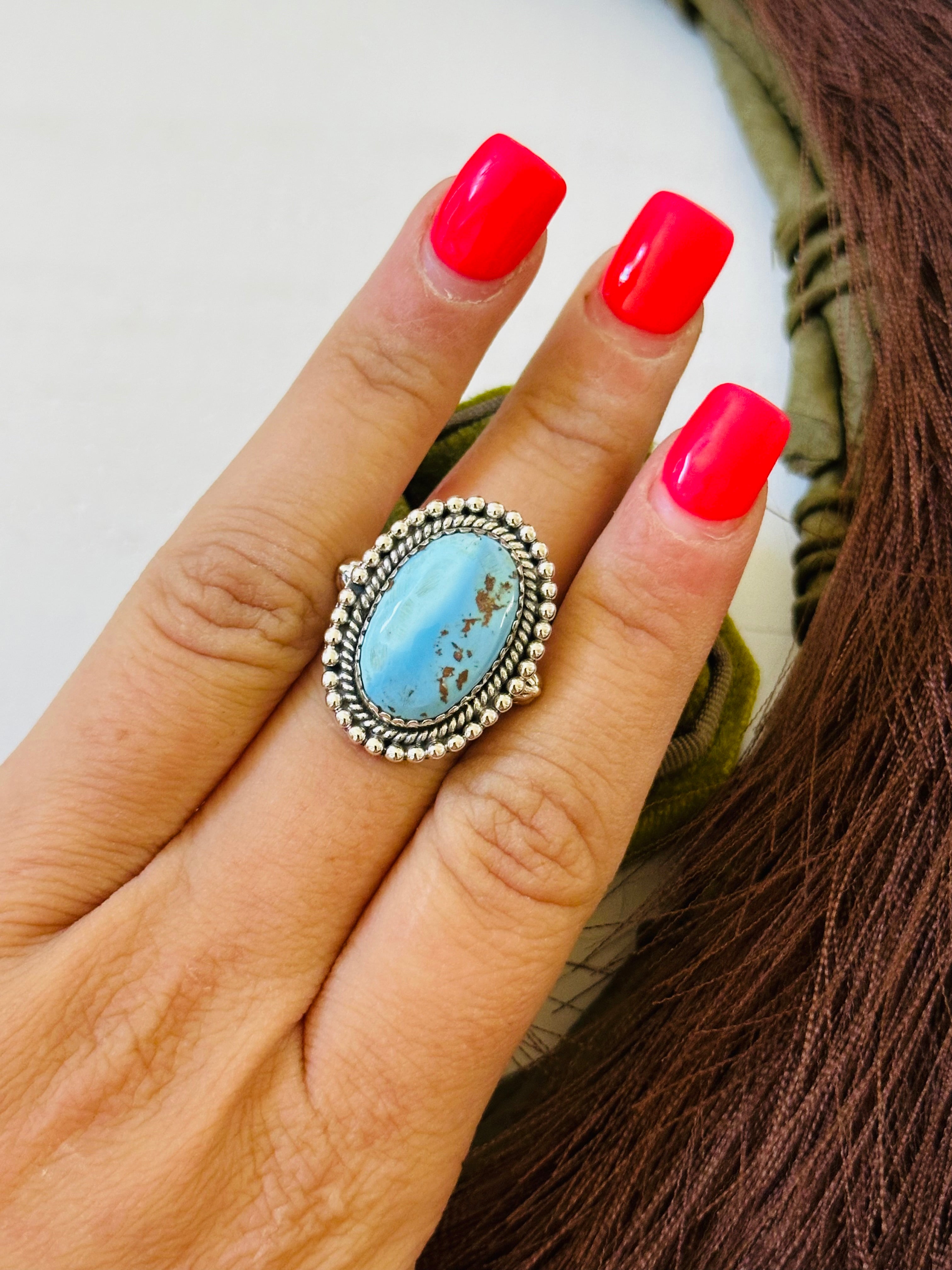 Beautiful ring. Southwest Handmade Golden Hills Turquoise & Sterling Silver Ring Size 7. It measures 1 inch long and 3/4 of an inch wide. Signed by the artist and stamped sterling silver.