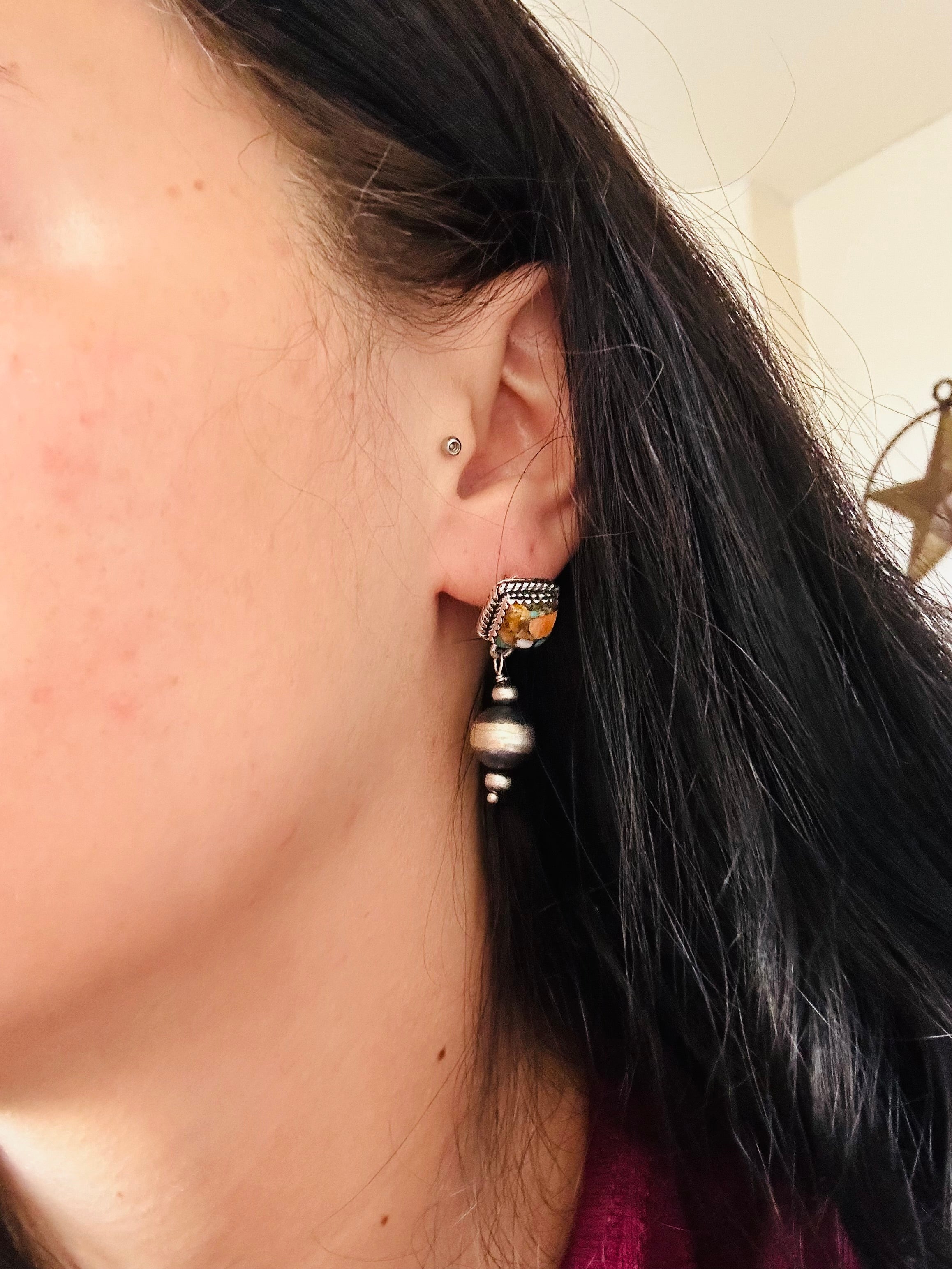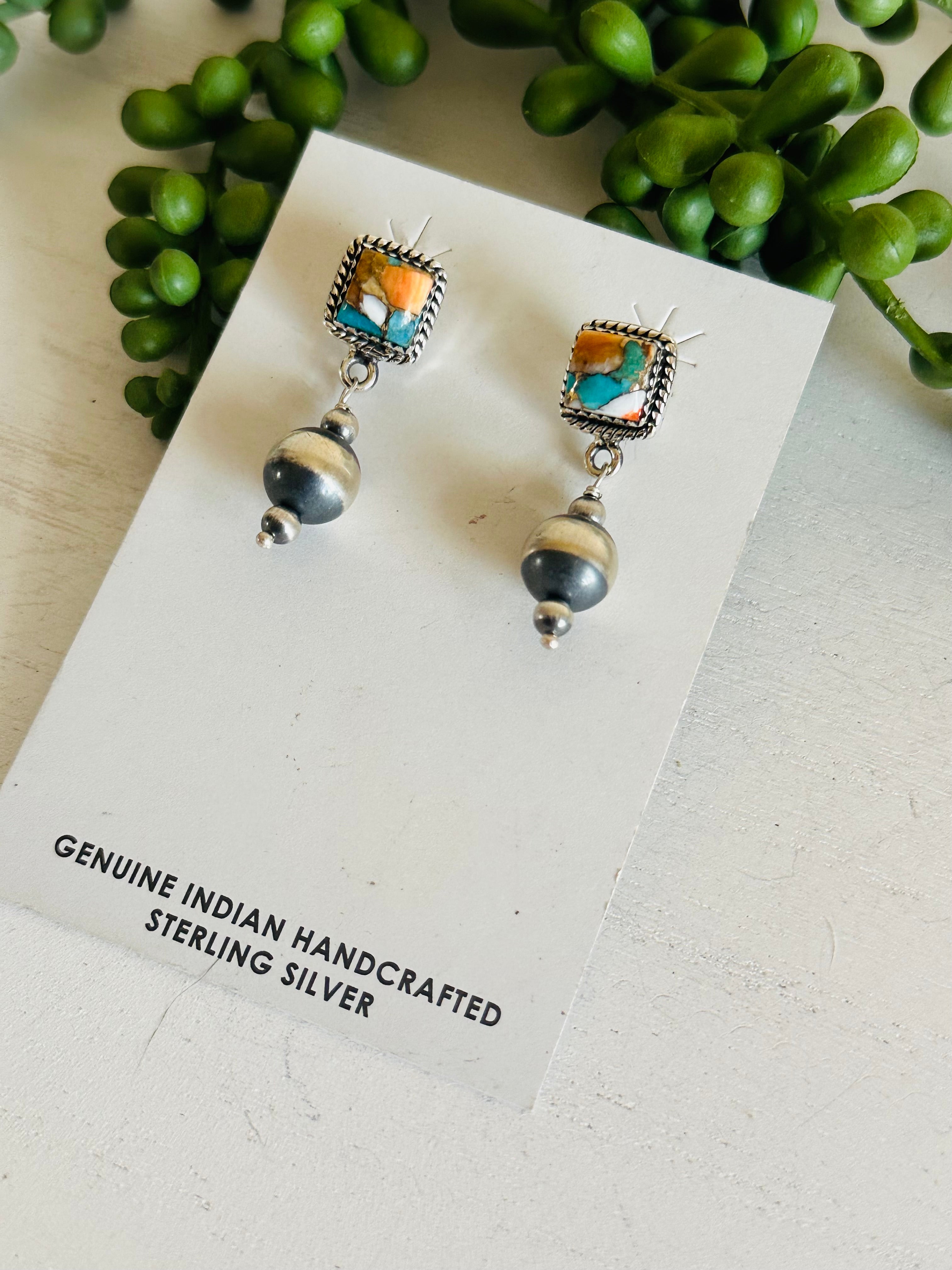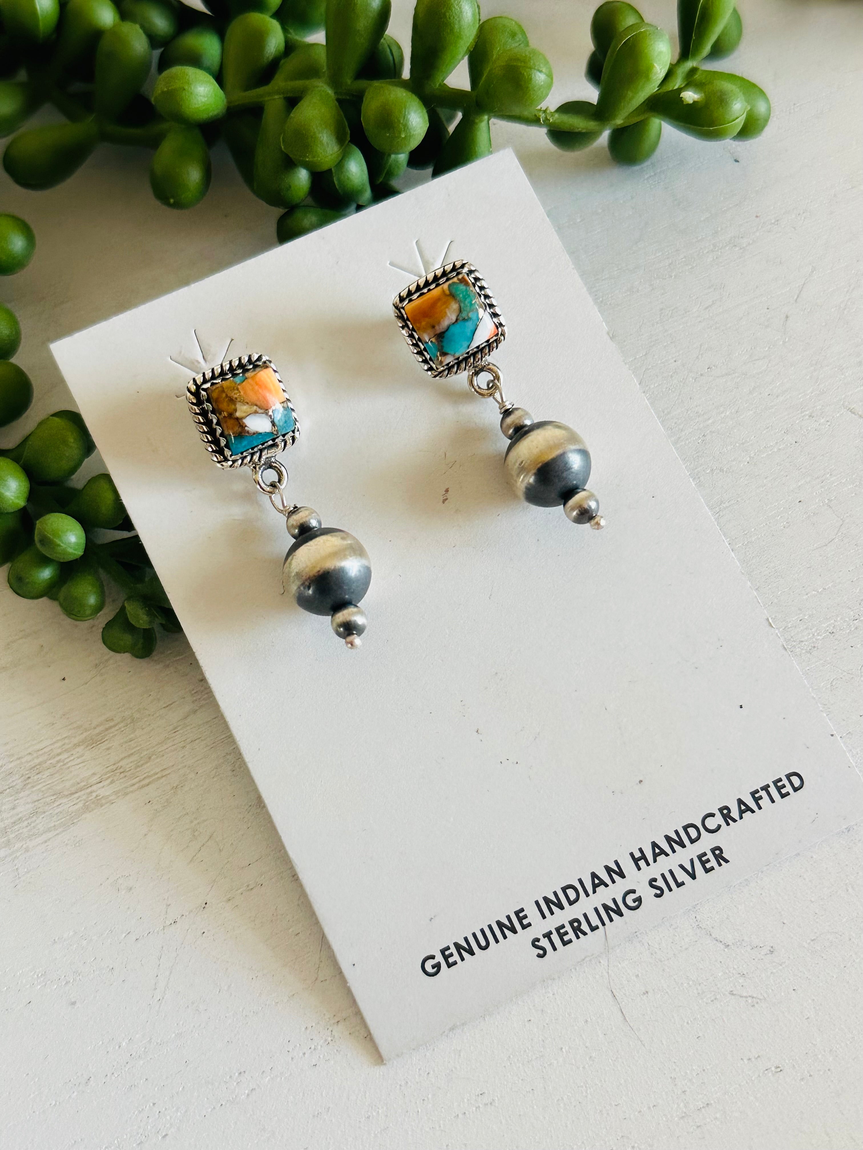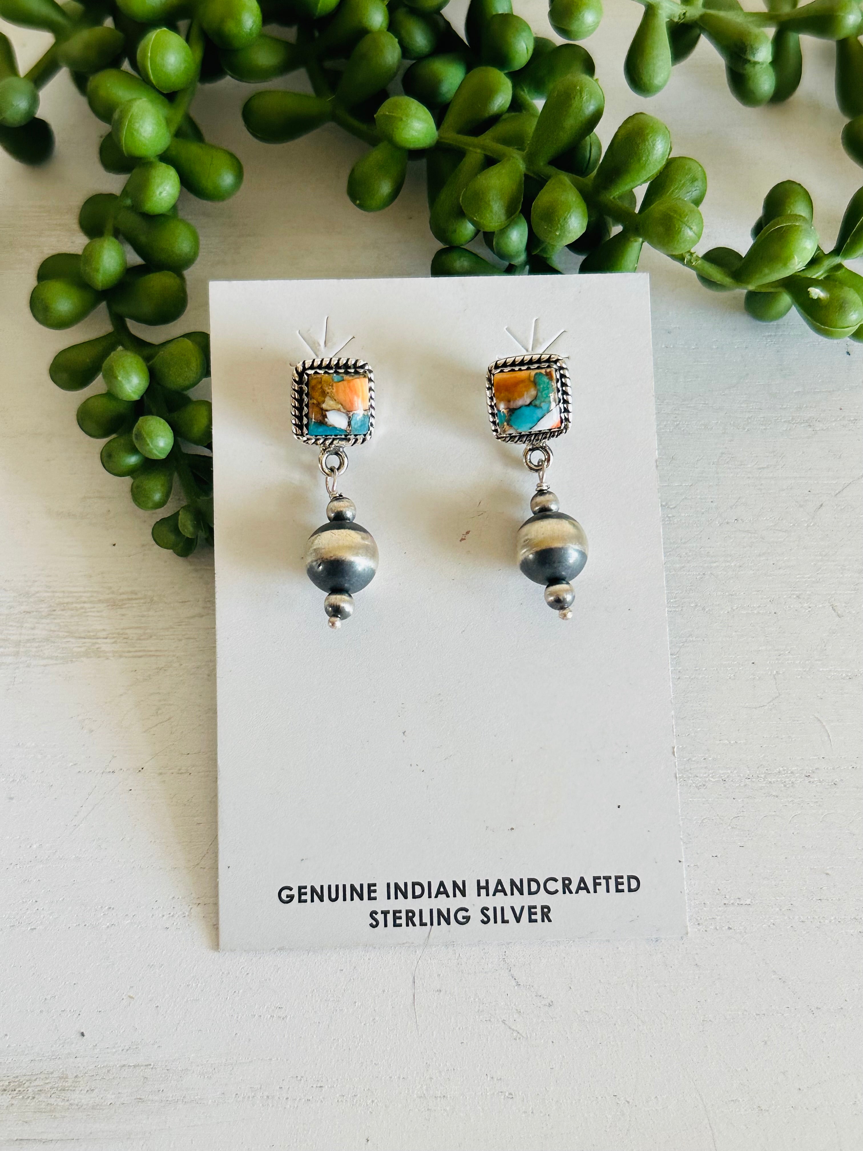 Beautiful post cluster earrings. Southwest Handmade Mohave Turquoise & Sterling Silver Post Dangle Earrings. It measures 1 1/2 inches long and 1/2 of an inch wide. Signed by the artist and stamped sterling silver. Stones will vary due to natural stones.