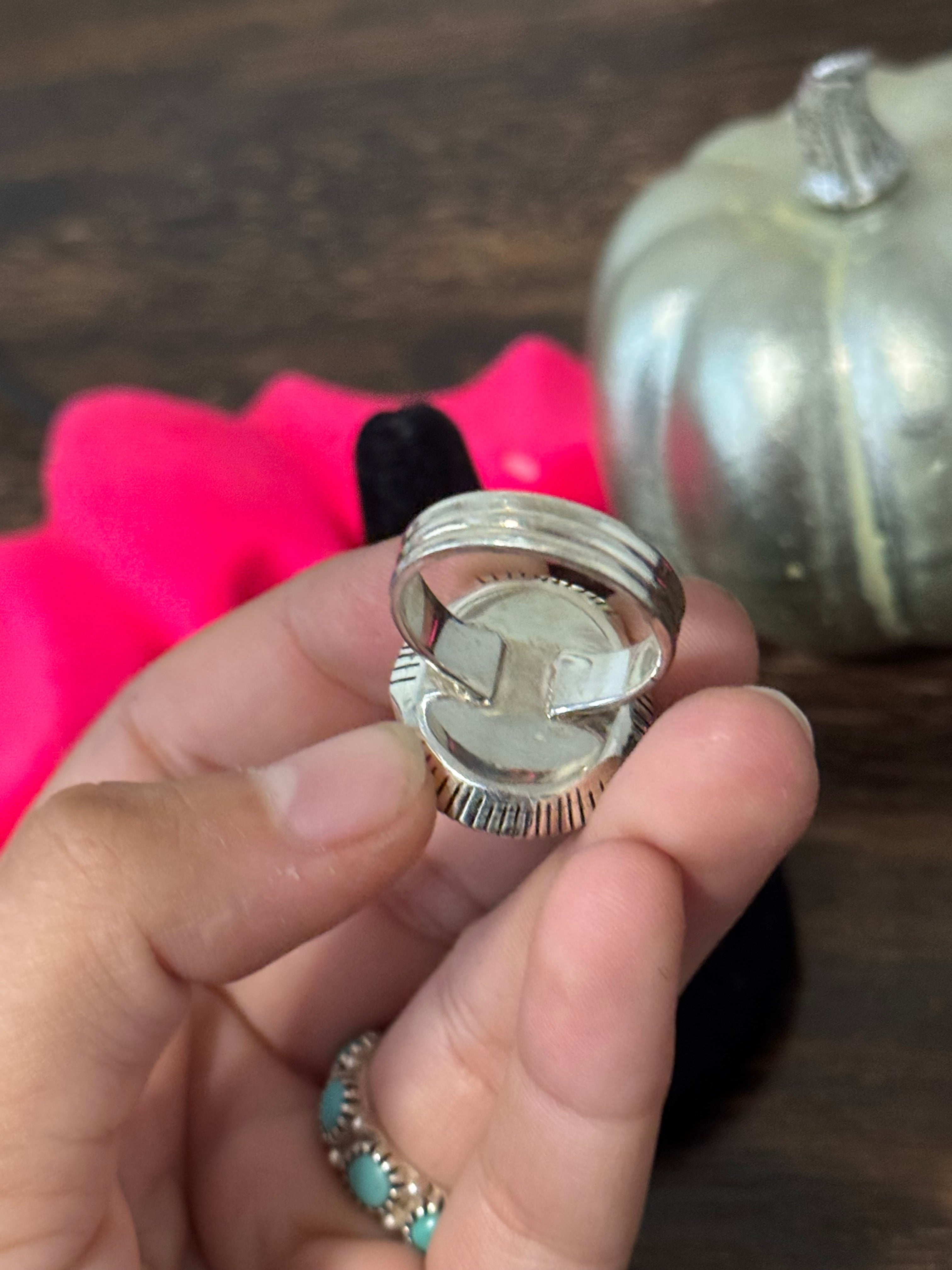 Beautiful ring. Southwest Handmade Pixie Turquoise & Sterling Silver Ring Size 8.75. It measures 1 inch long and just under 3/4 of an inch wide. Size 6.5 . Signed by the artist and stamped sterling silver.