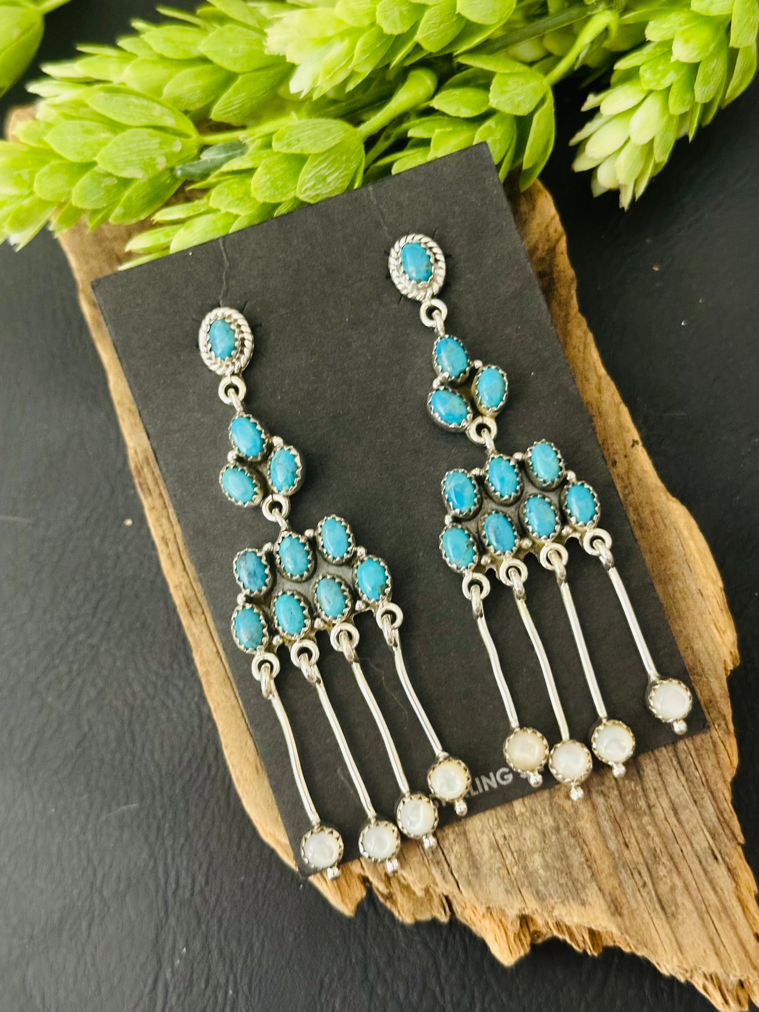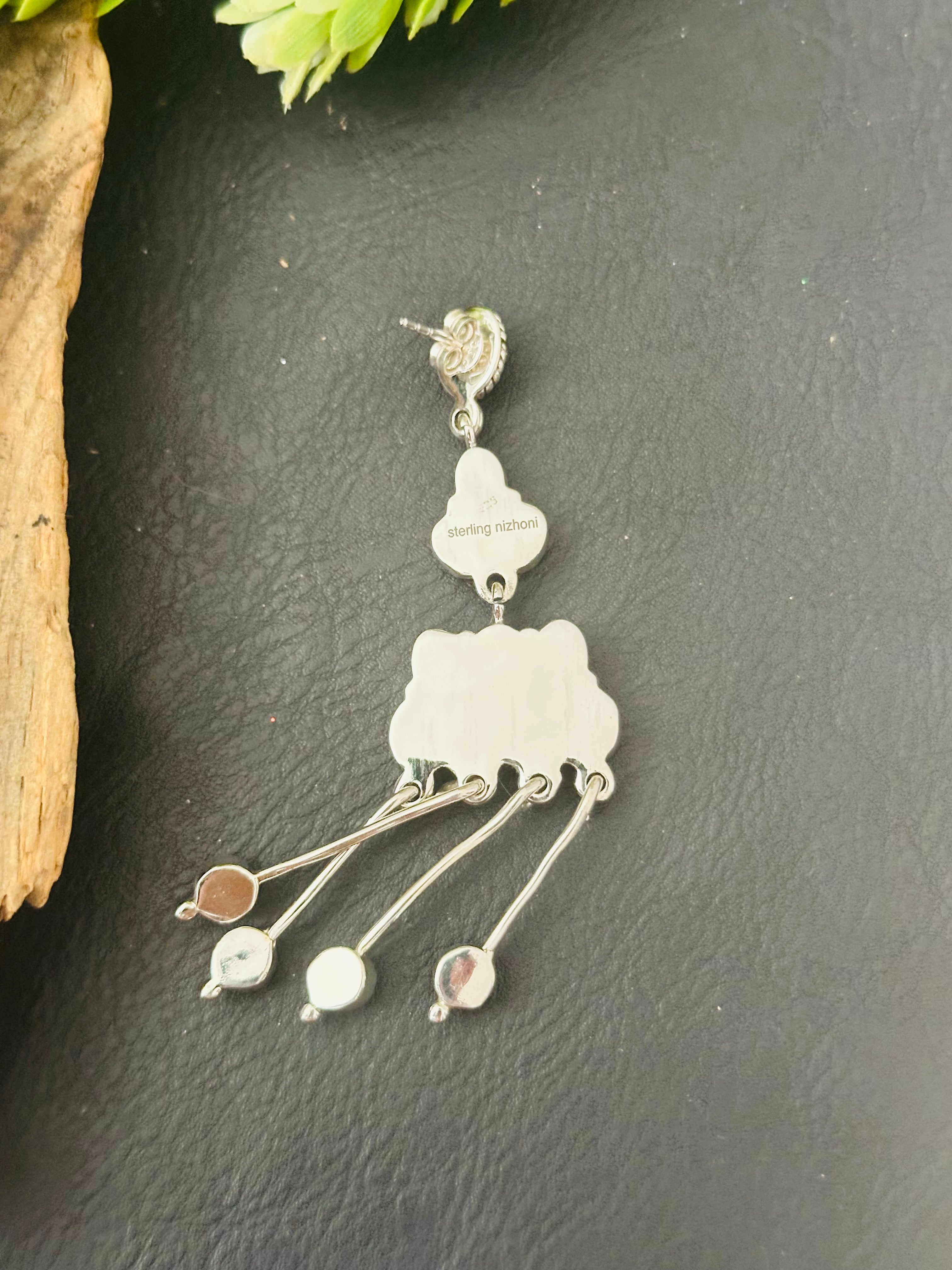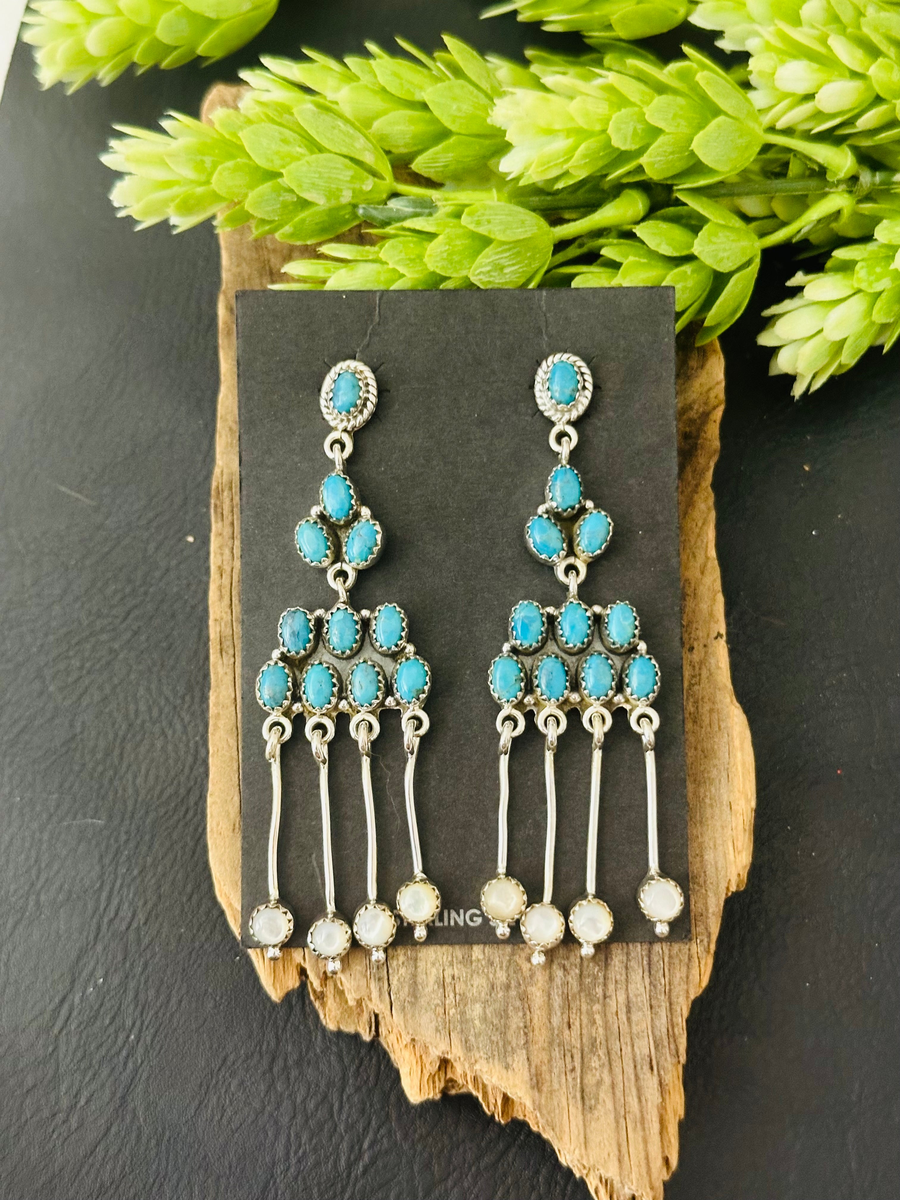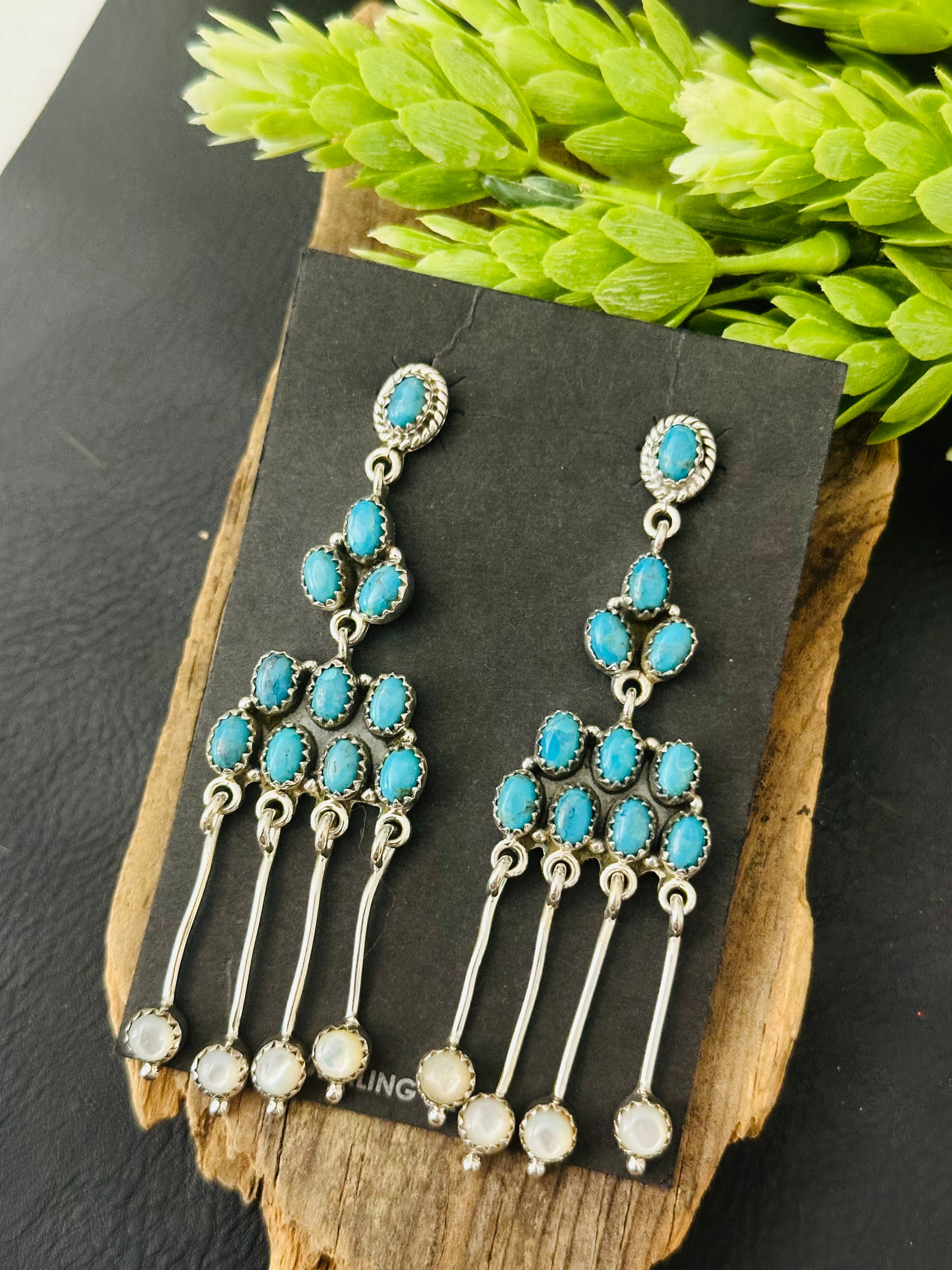 Breathtaking earrings. Southwest Handmade Kingman Turquoise & Mother Of Pearl Sterling Silver Post Dangle Earrings. It measures 3 inches long and 7/8 of an inch wide. Signed by the artist and stamped sterling silver.