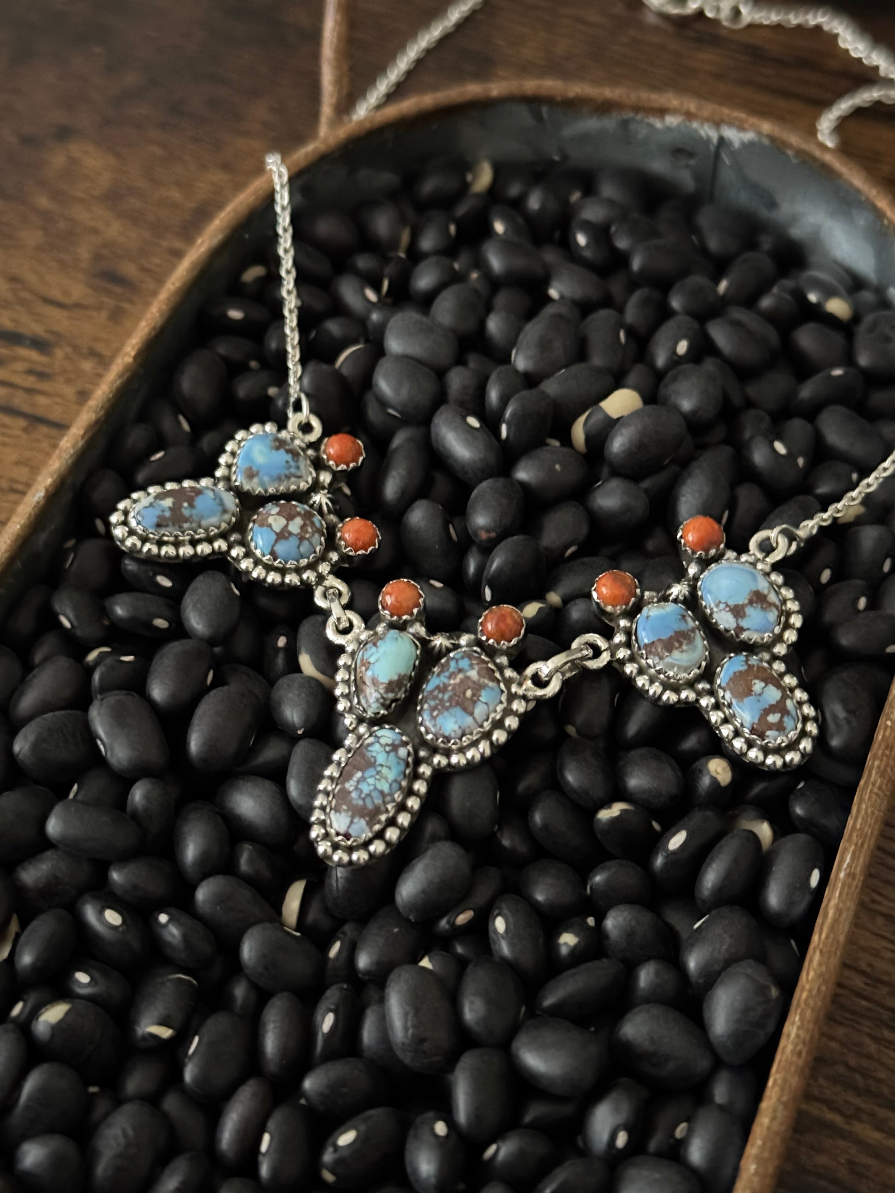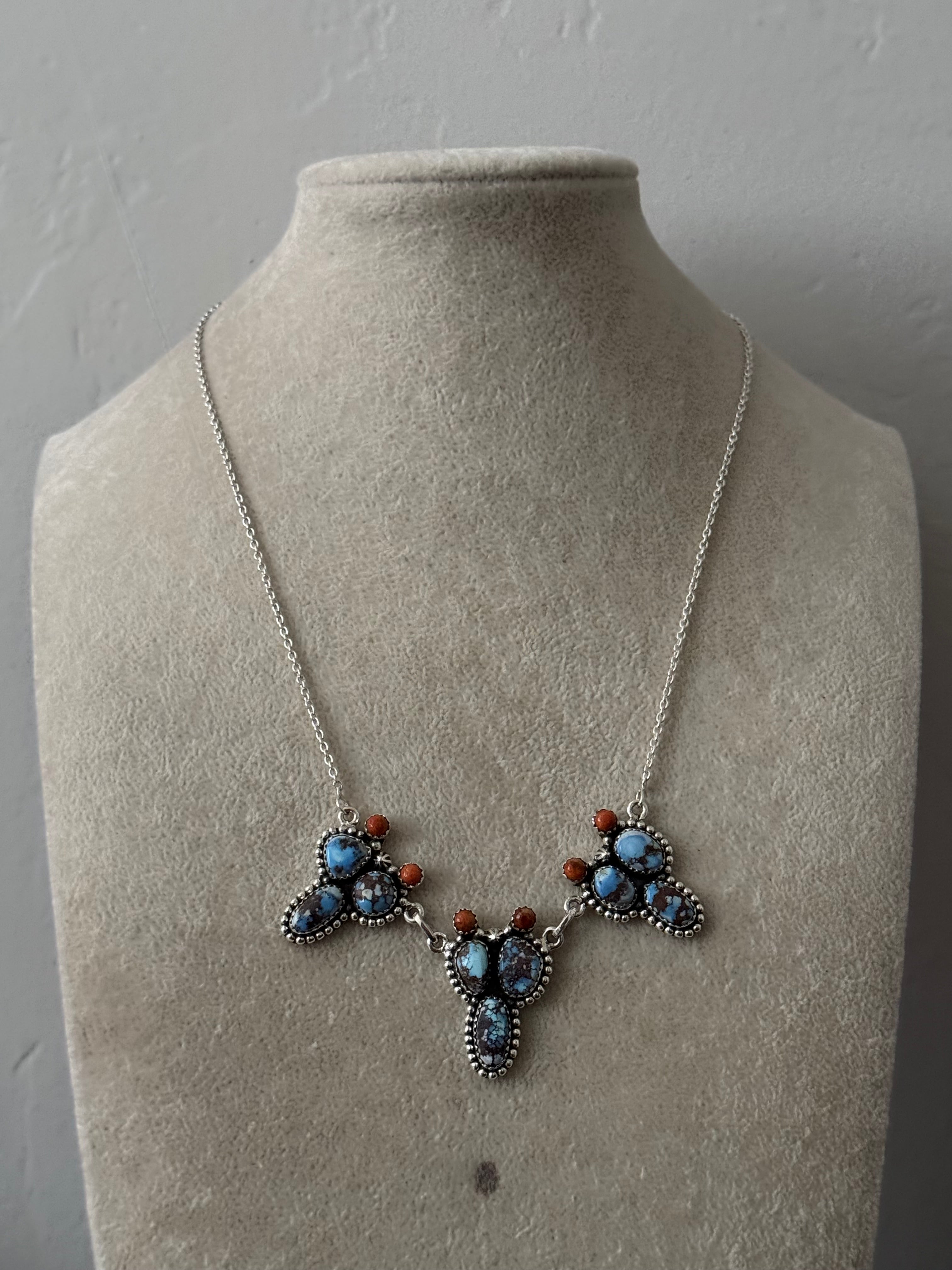Beautiful necklace. Southwest Handmade Golden Hills Turquoise & Coral & Sterling Silver Prickly Pear Necklace. Beautiful mix of Sonoran Mountain & Apple Coral. It measures 22 inches long with hang while the chain by itself measures 18 inches long but can be adjusted down. Signed by the artist and stamped sterling silver. Stones will differ due to natural stones: