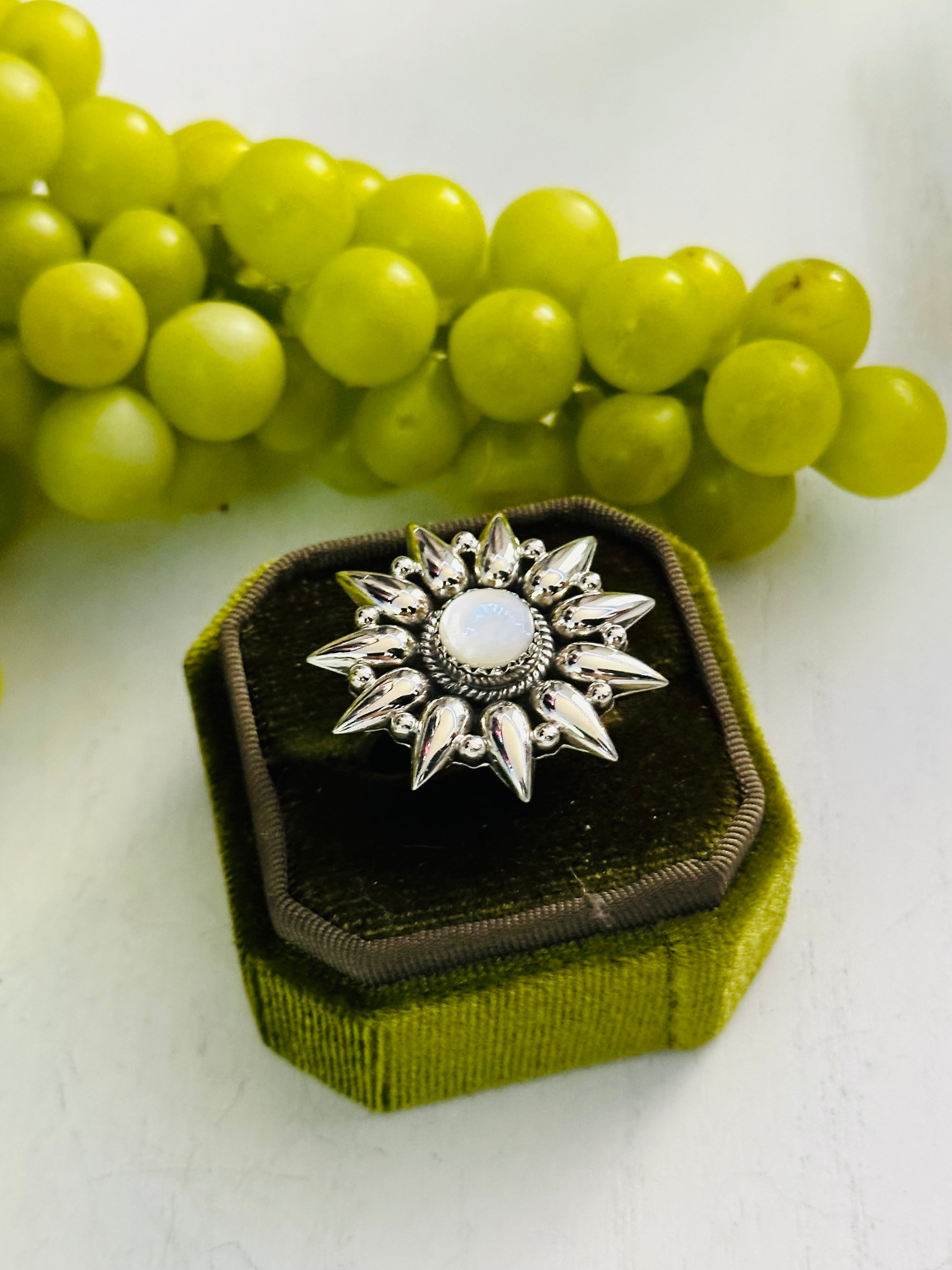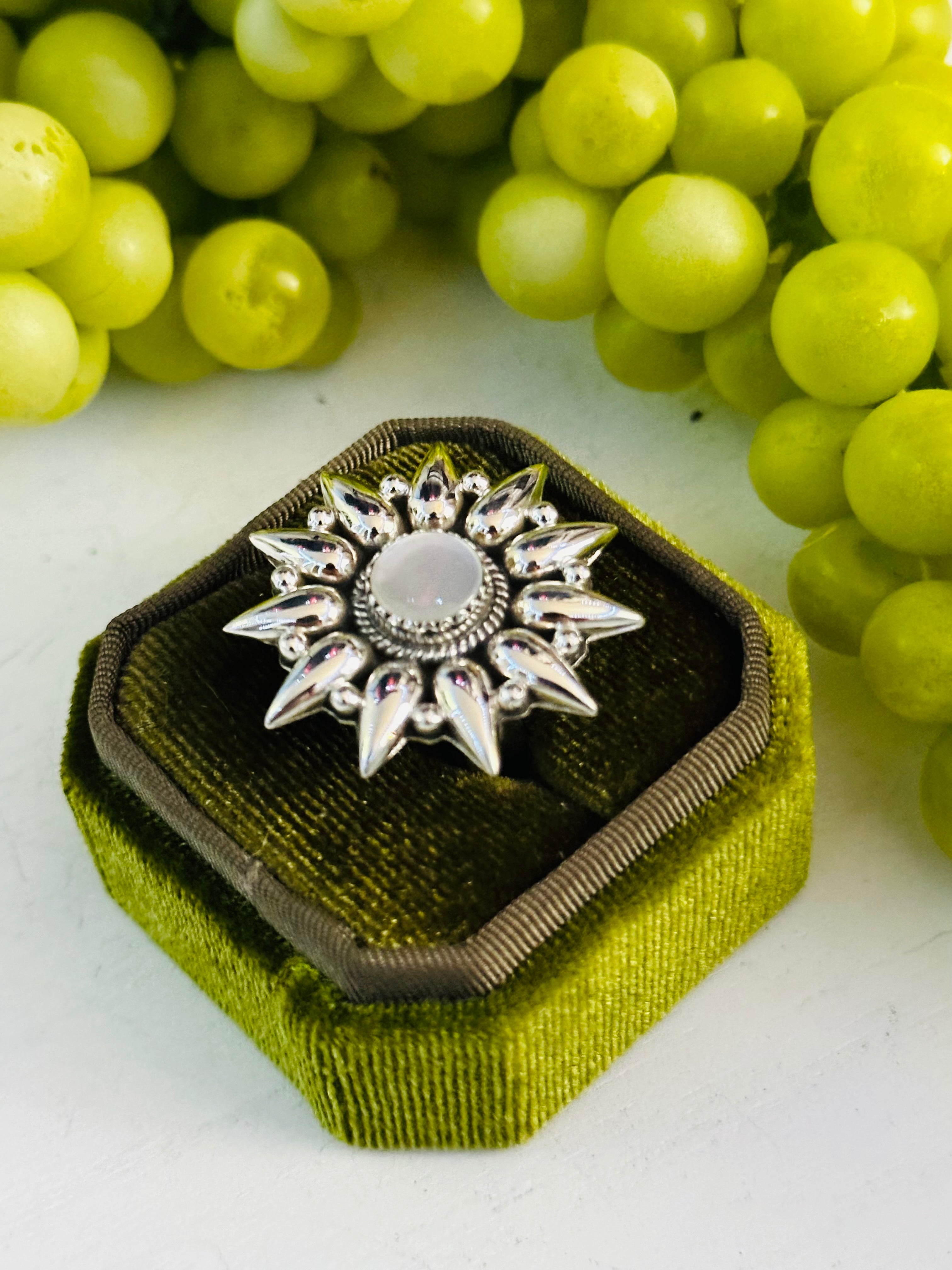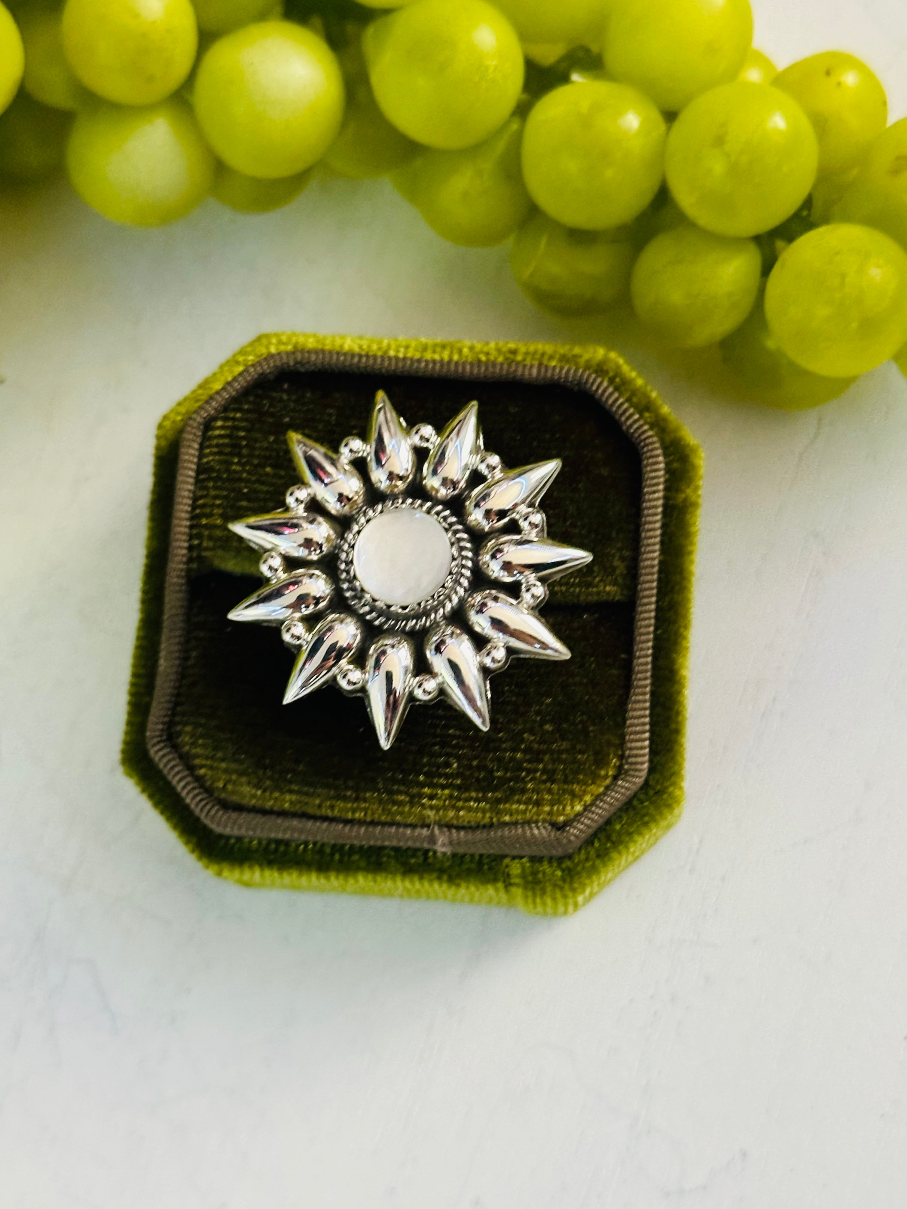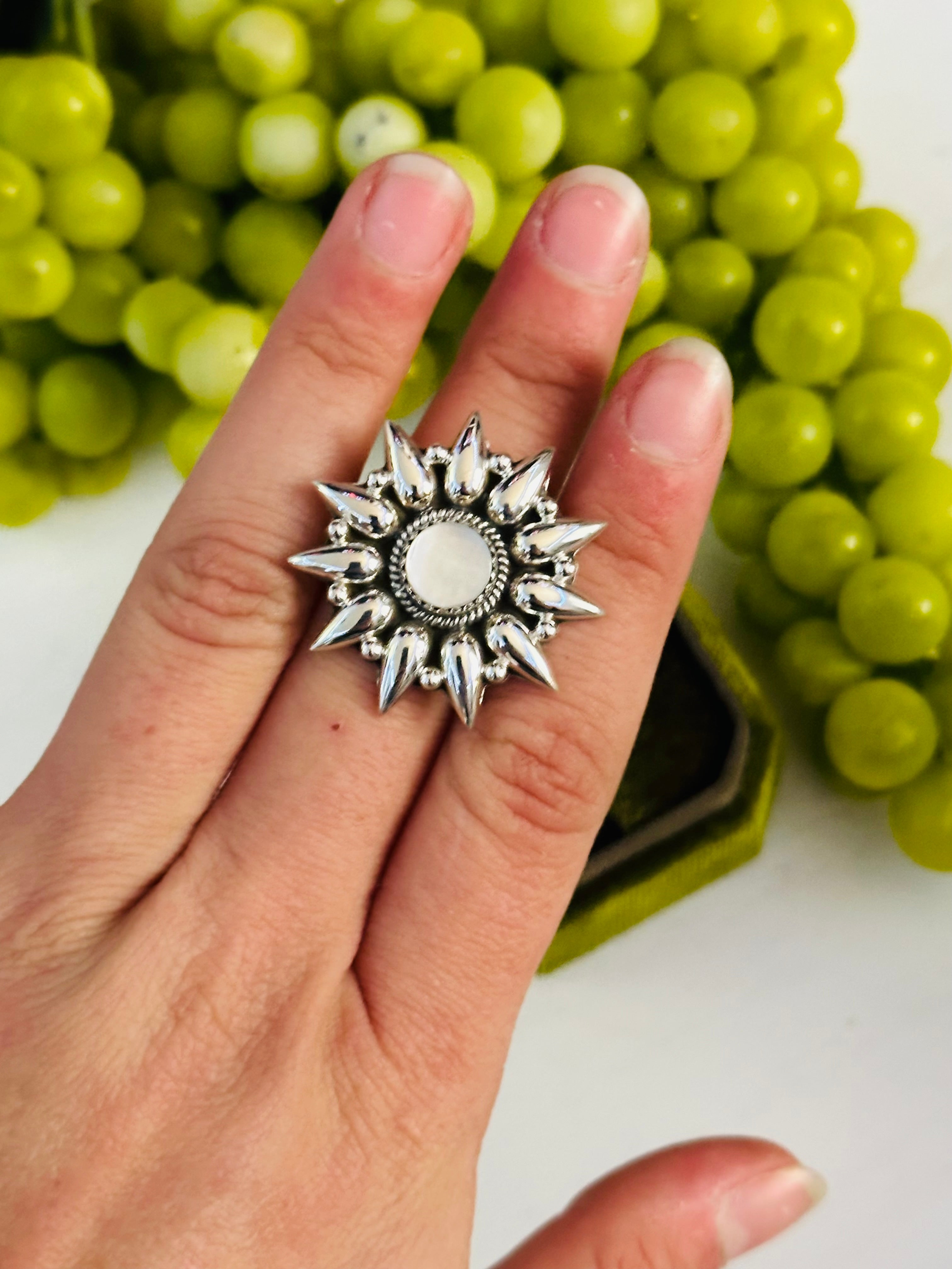 Beautiful ring. Southwest Handmade Mother of Pearl & Sterling Silver Adjustable Ring. It measures 1 1/4 inches round. Signed by the artist and stamped sterling silver. Stones will differ due to natural stones.