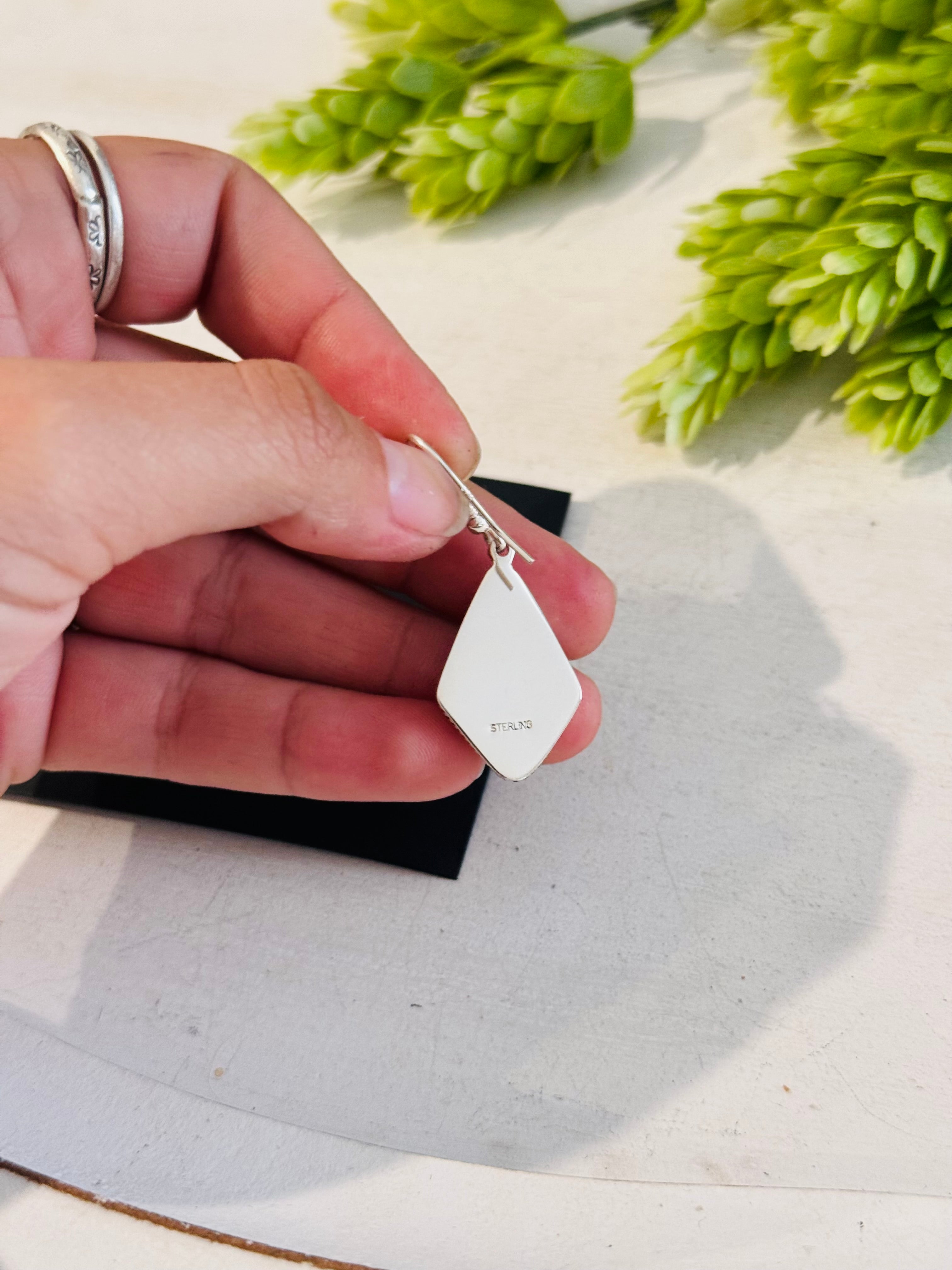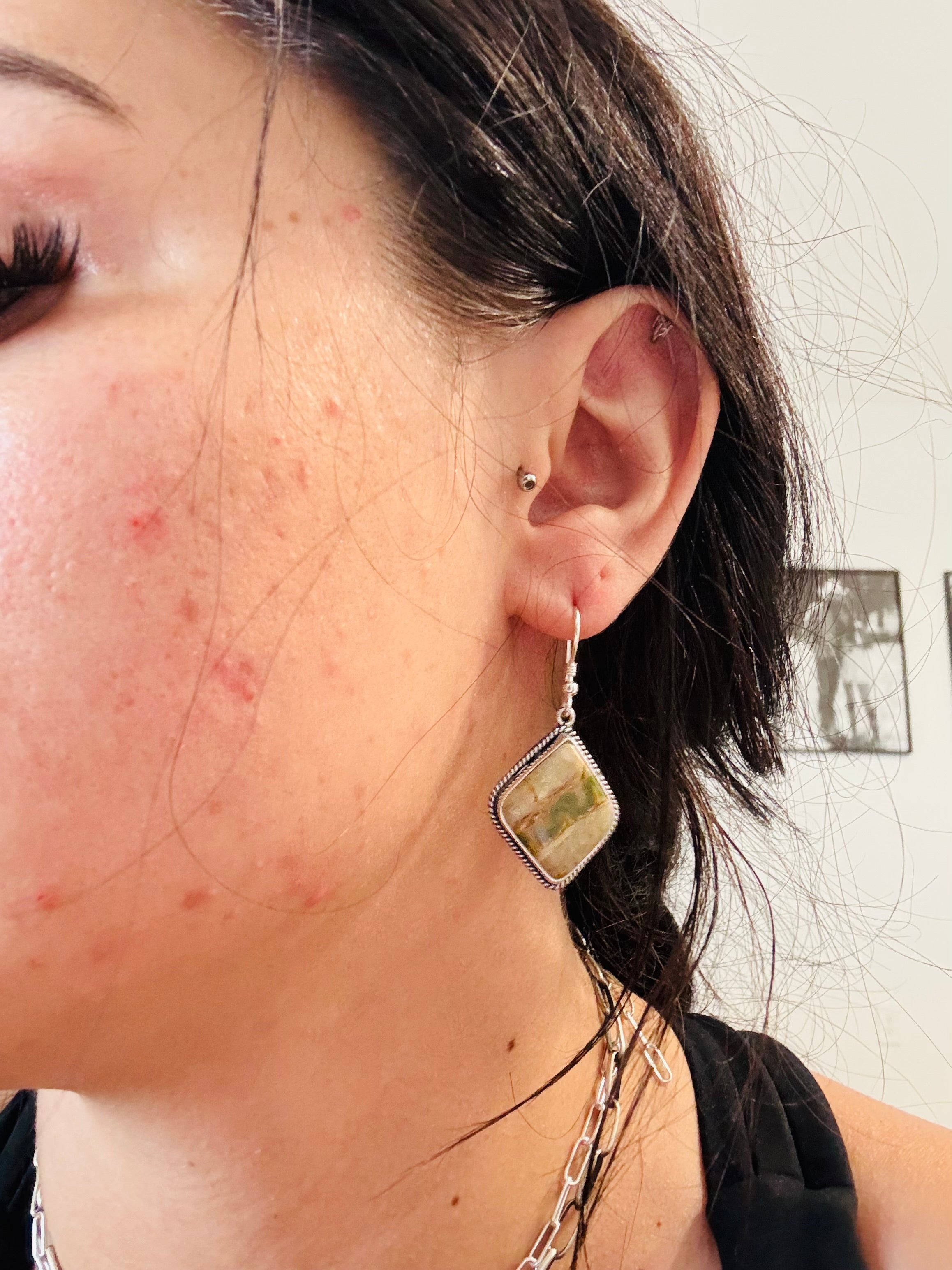 Southwest Handmade Ribbon Royston Turquoise & Sterling Silver Dangle Earrings . They measure 1 3/4 inches long and 3/4 of an inch wide.