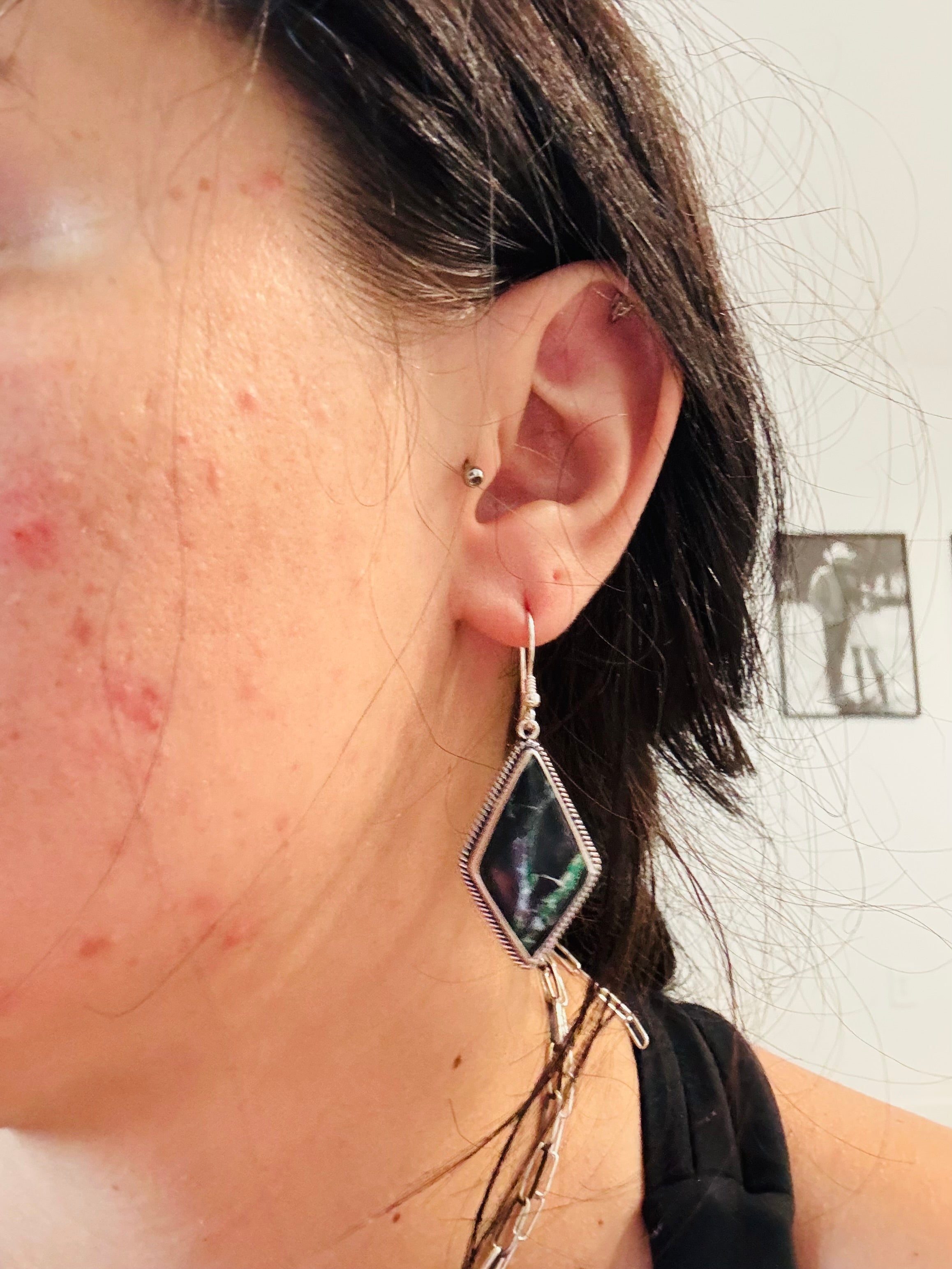 Southwest Handmade Black Jack Turquoise & Sterling Silver Dangle Earrings. They measure 2 inches long and 3/4 of an inch wide.