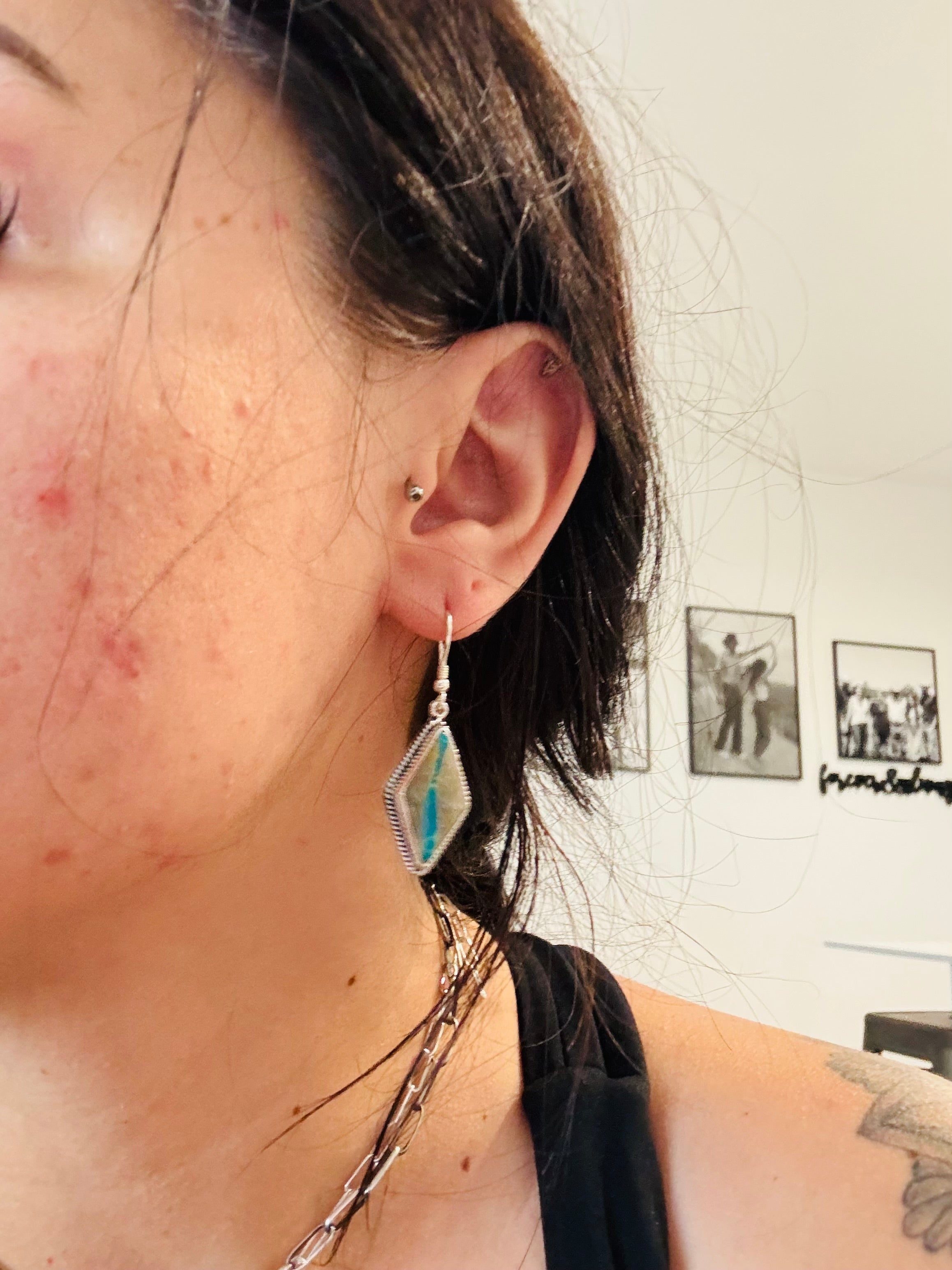 Southwest Handmade Ribbon Royston Turquoise & Sterling Silver Dangle Earrings . They measure 1 3/4 inches long and 5/8 of an inch wide.