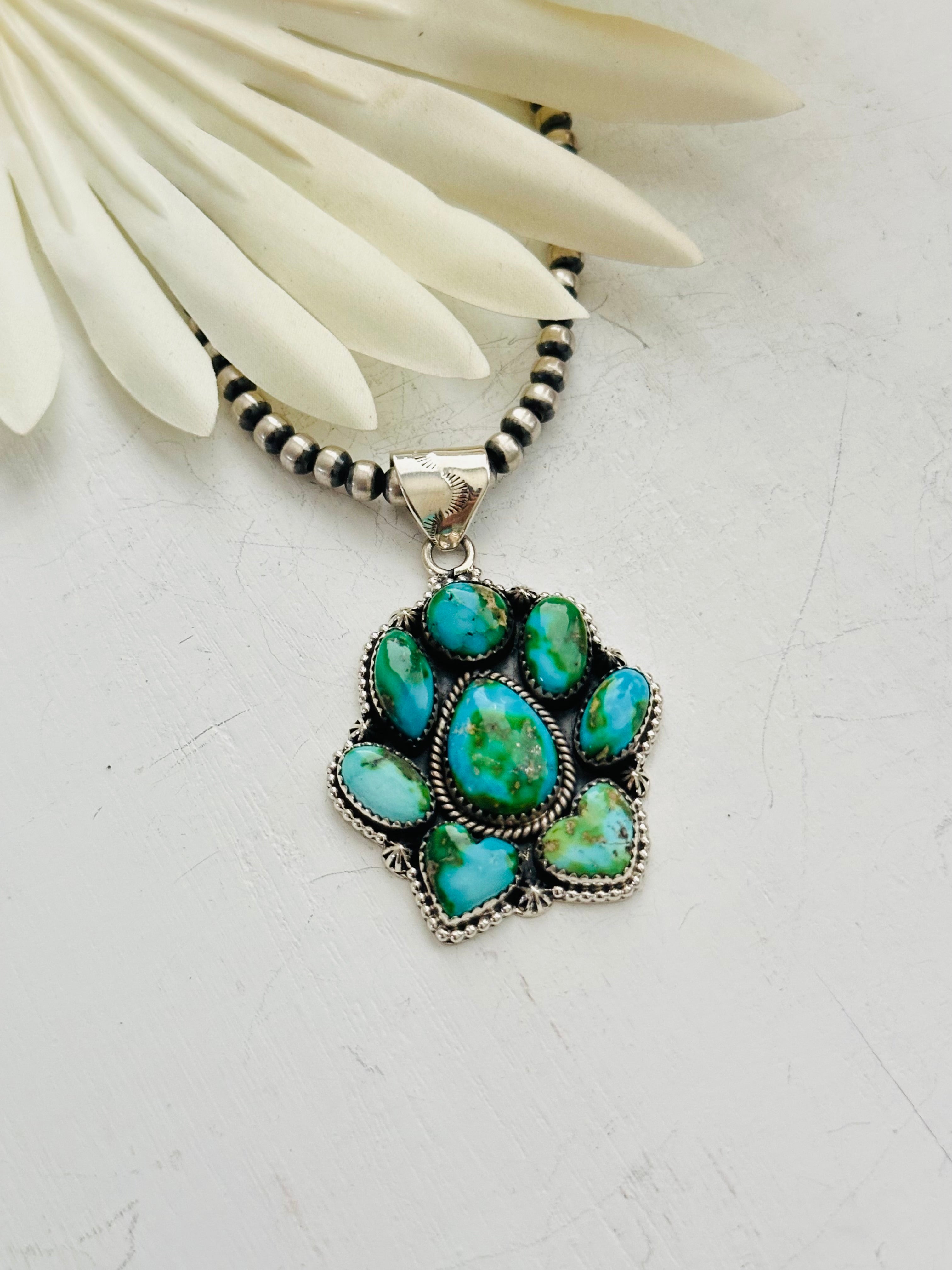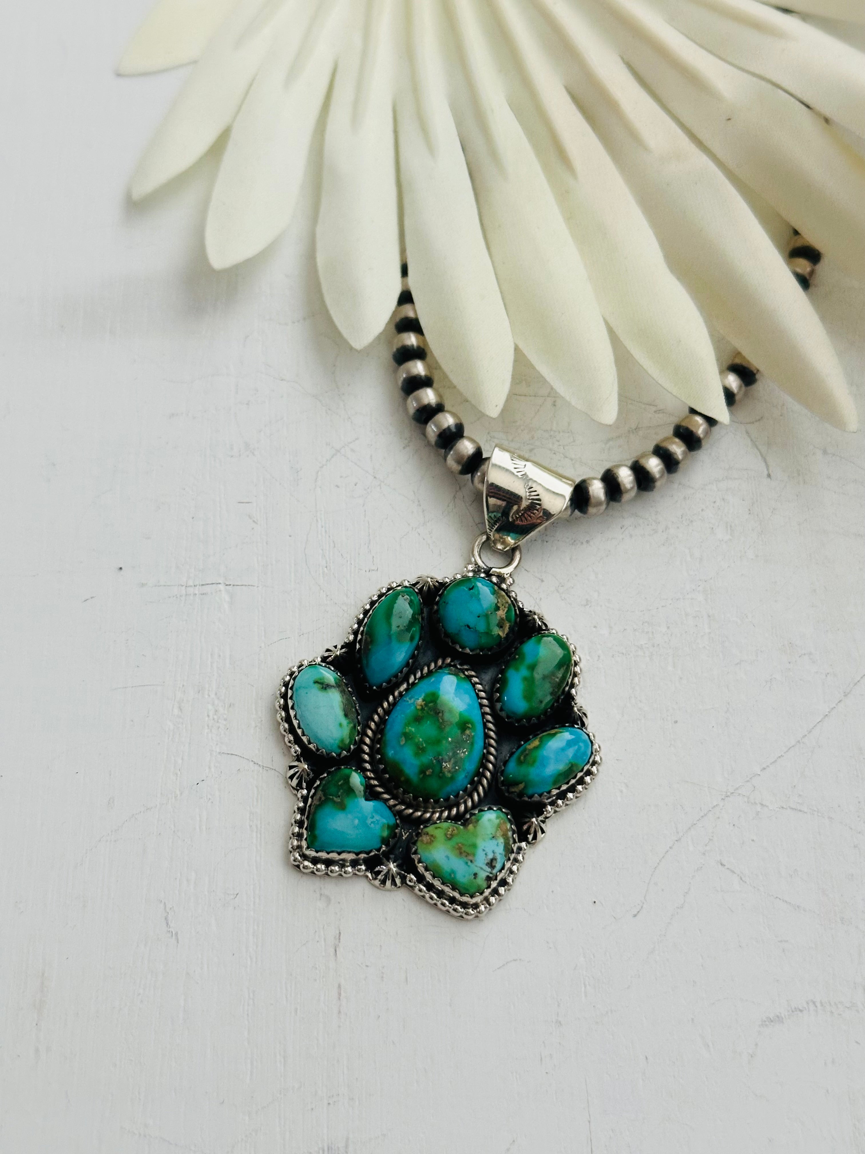 Beautiful craftsmanship. Southwest Handmade Sonoran Mountain Turquoise & Sterling Silver Cluster Pendant. It measures 2 3/8 inches long and 1 5/8 inches wide. Pendant Only. Signed by the artist and stamped sterling silver.