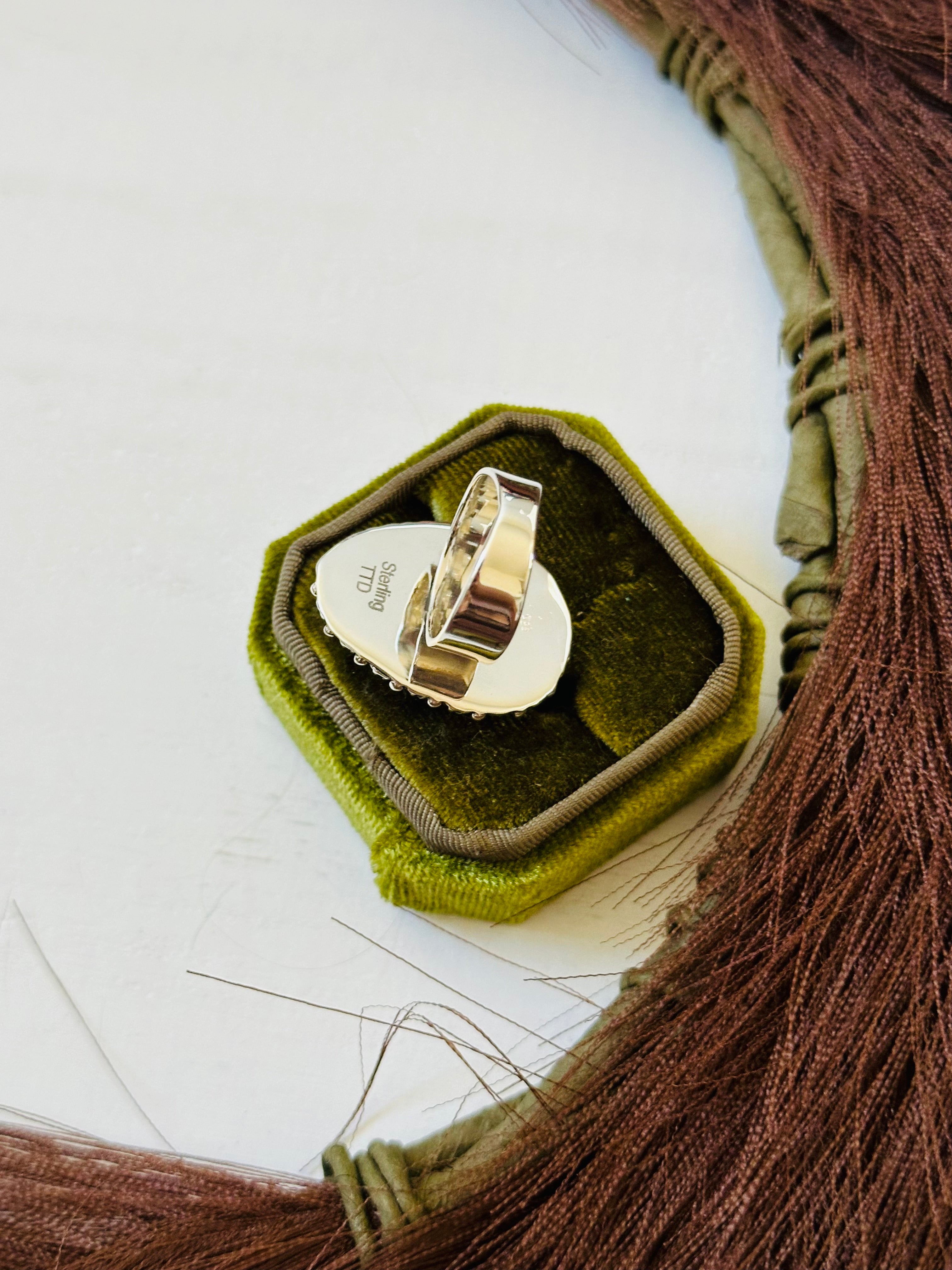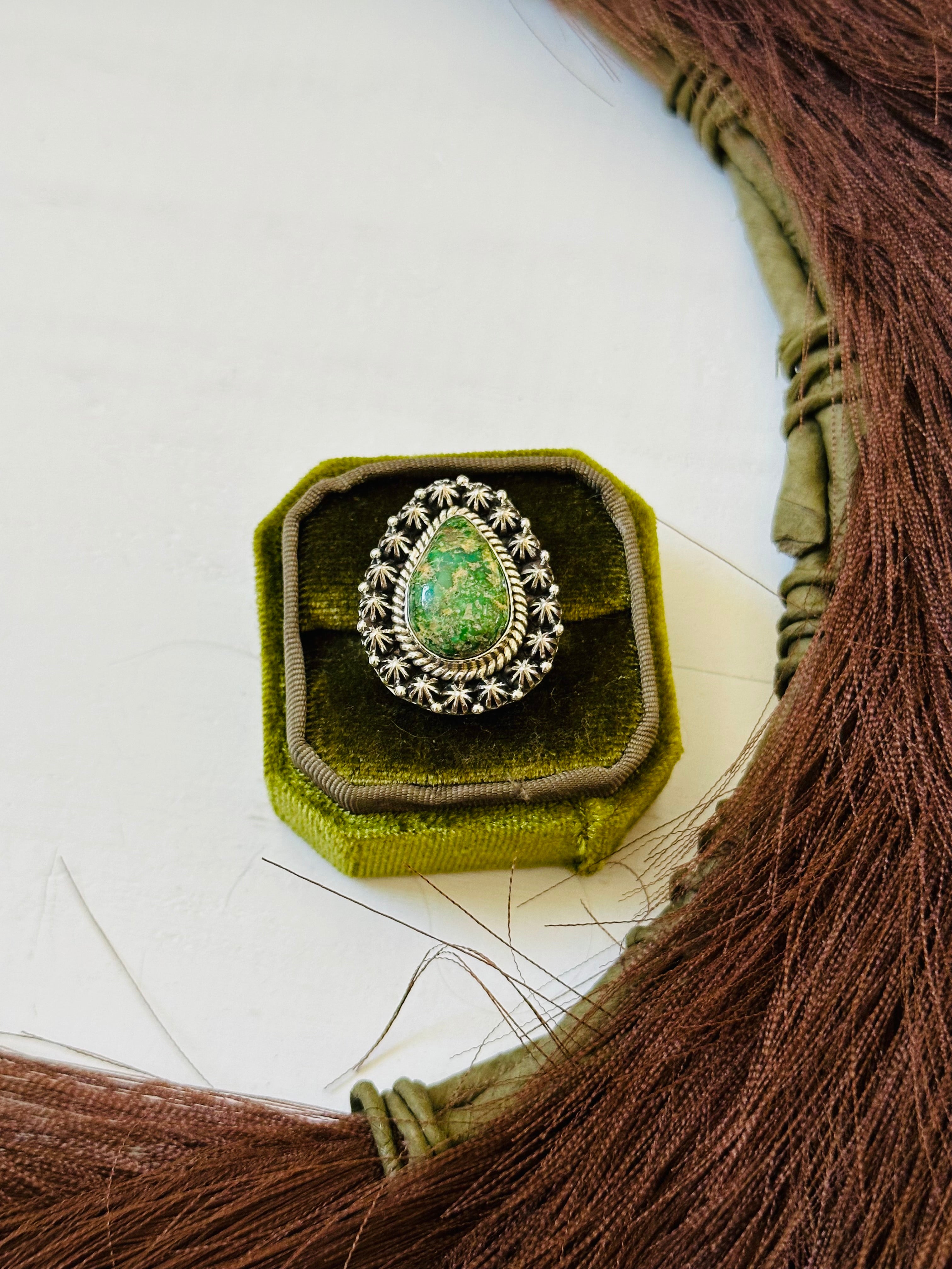 Beautiful ring. Southwest Handmade Sonoran Mountain Turquoise & Sterling Silver Ring Size 7. It measures 1 1/4 inches long and 7/8 of an inch wide. Signed by the artist and stamped sterling silver.
