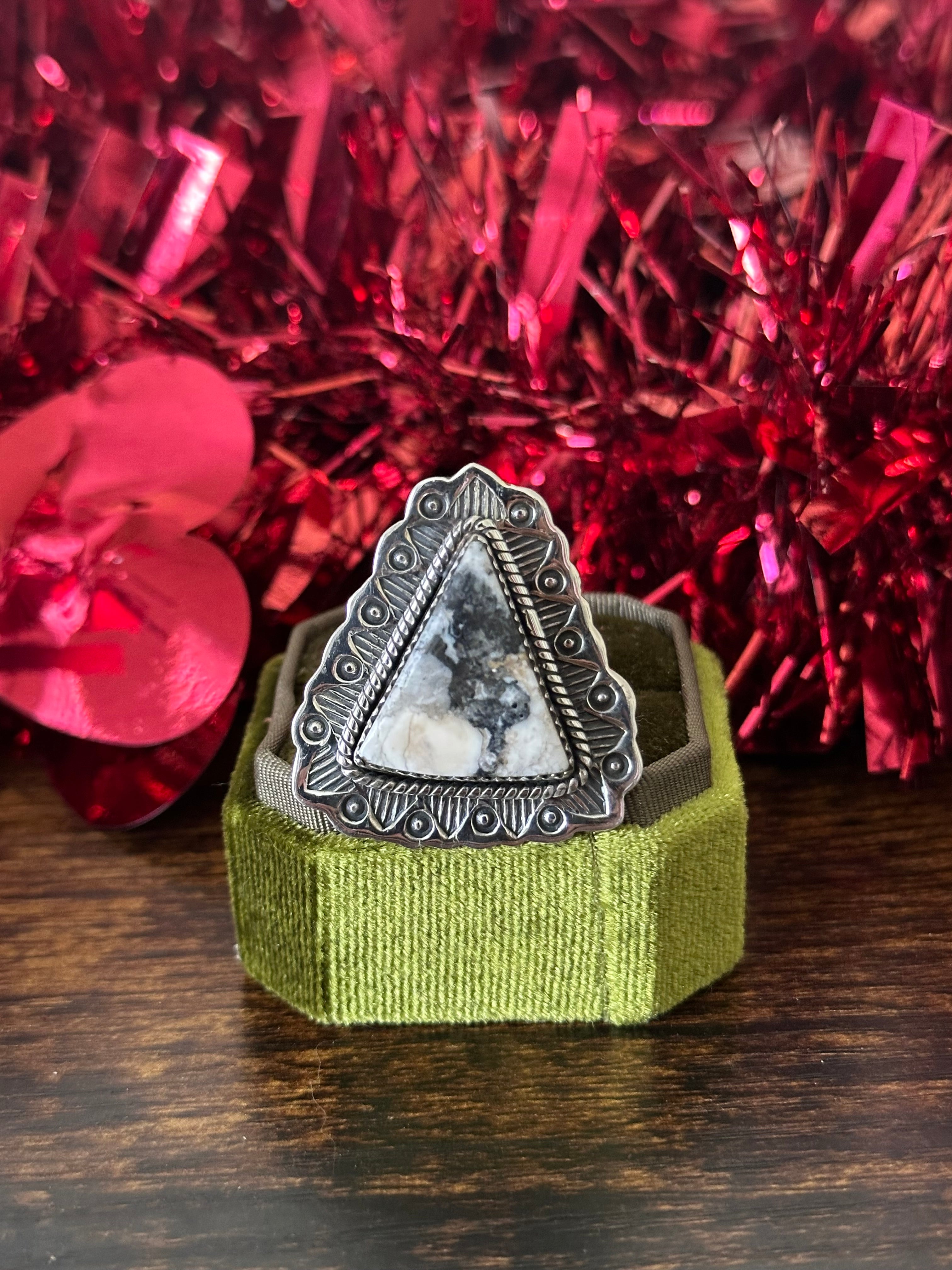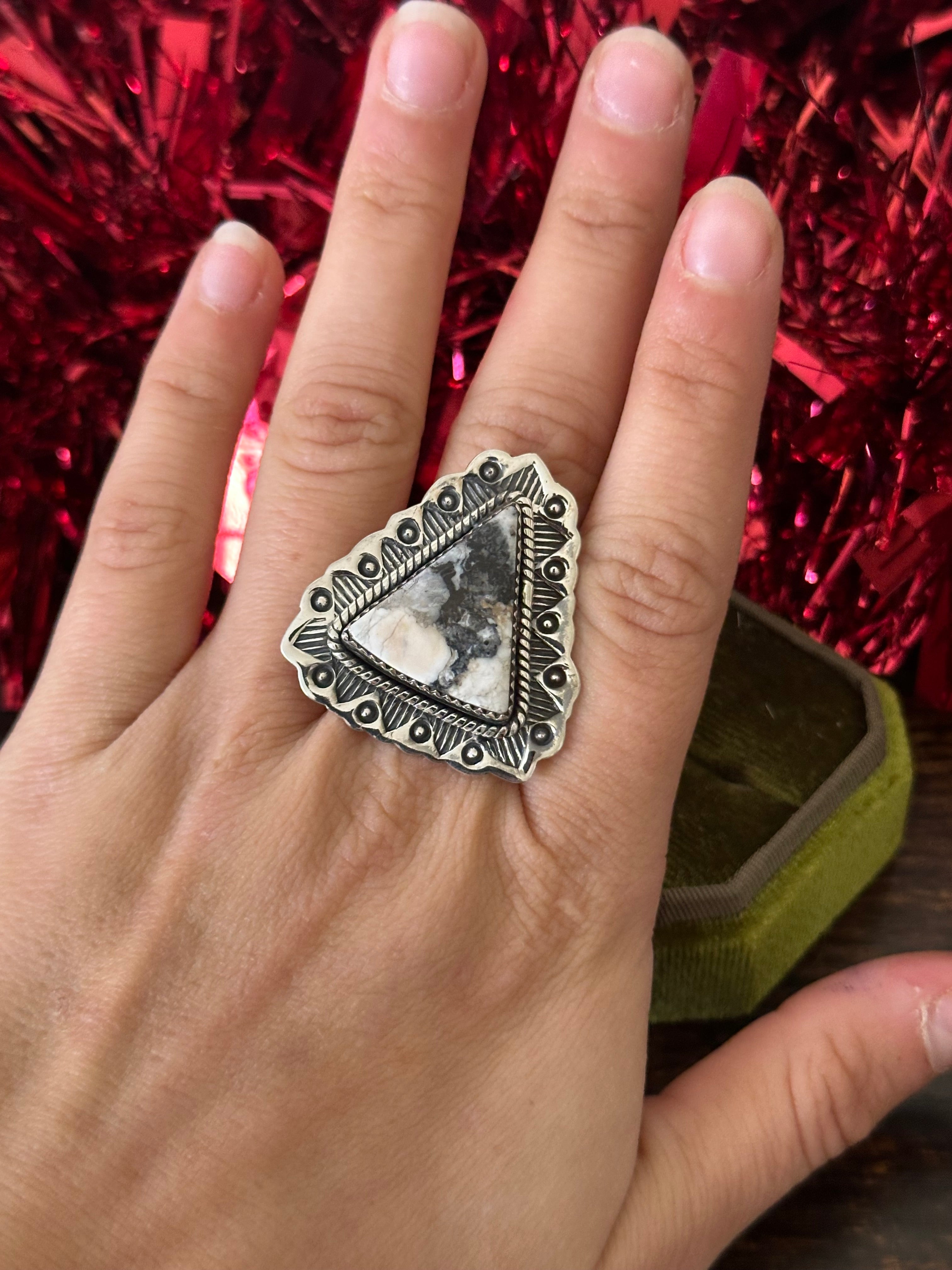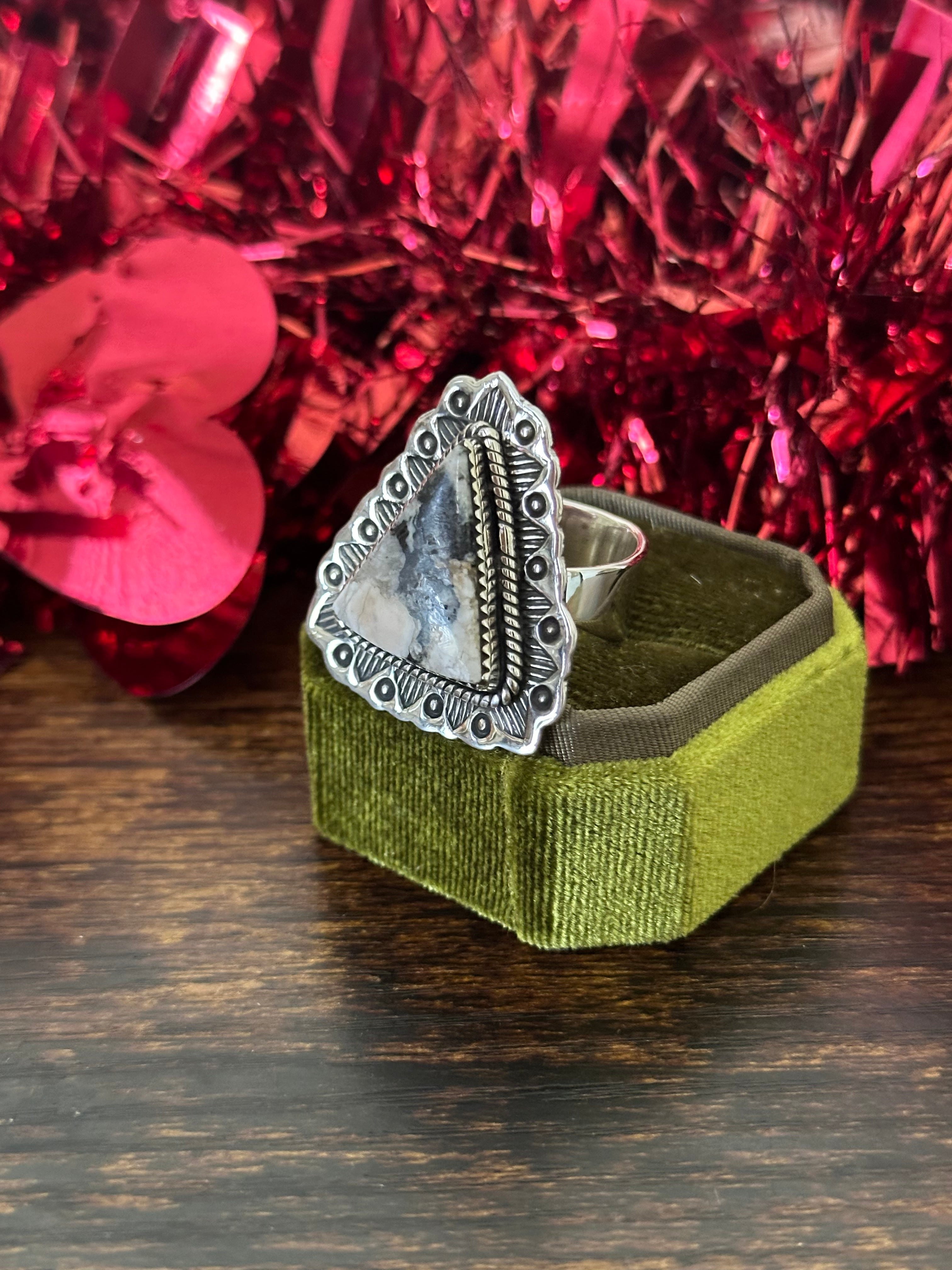 Beautiful ring. Southwest Handmade White Buffalo & Sterling Silver Adjustable Ring. It measures 1 3/8 inches long and 1 1/4 inches wide. Signed by the artist and stamped sterling silver.
