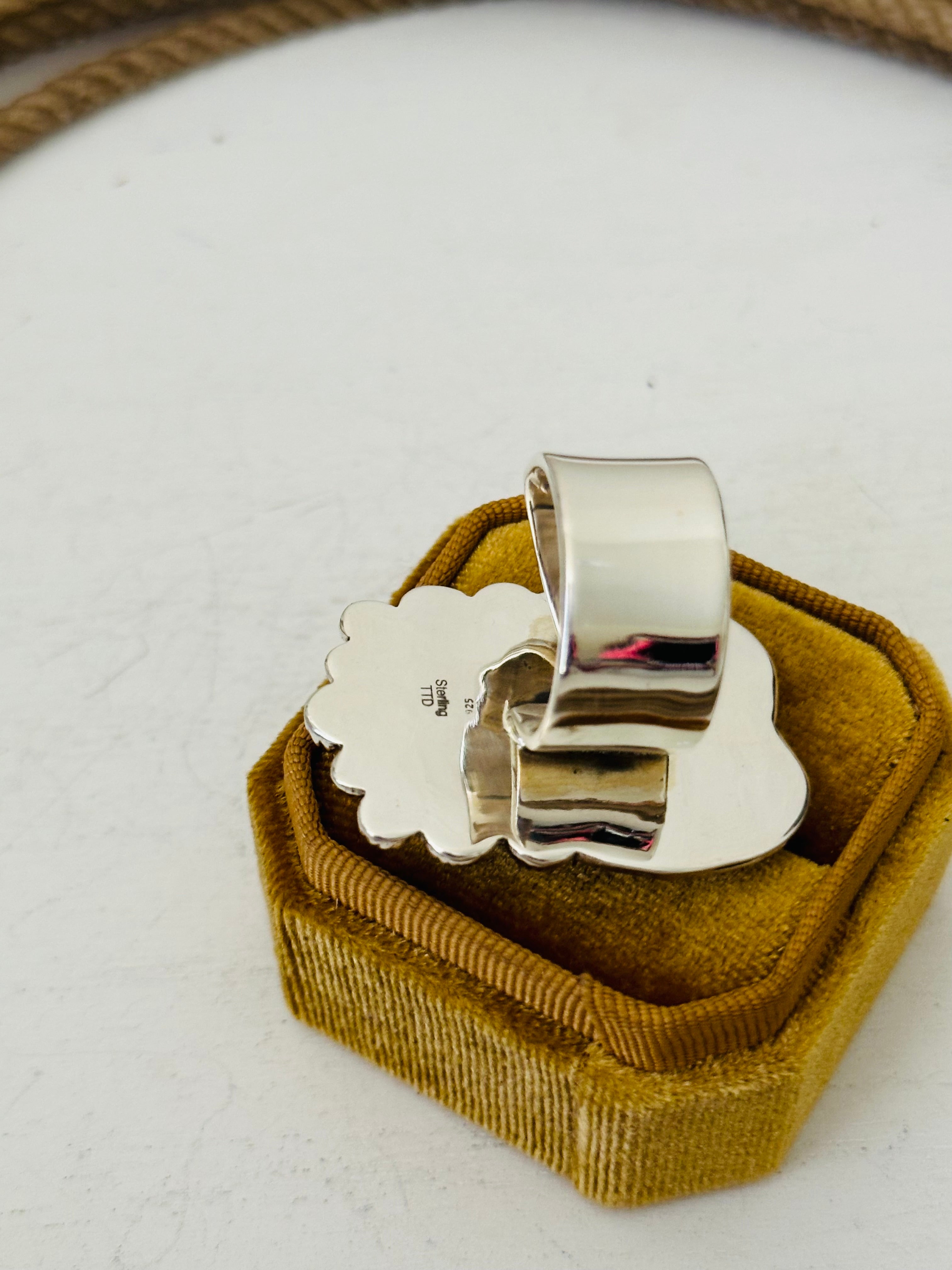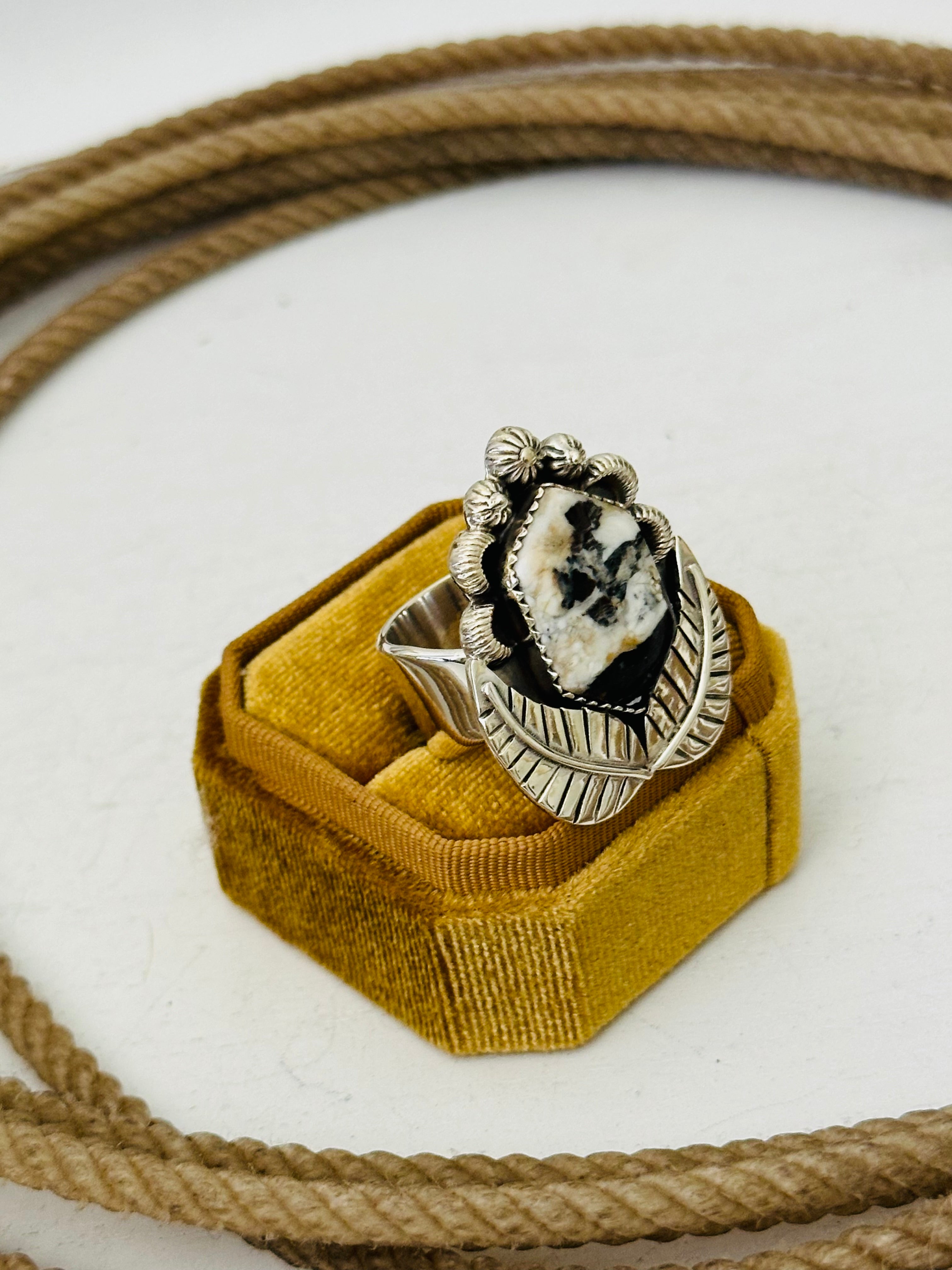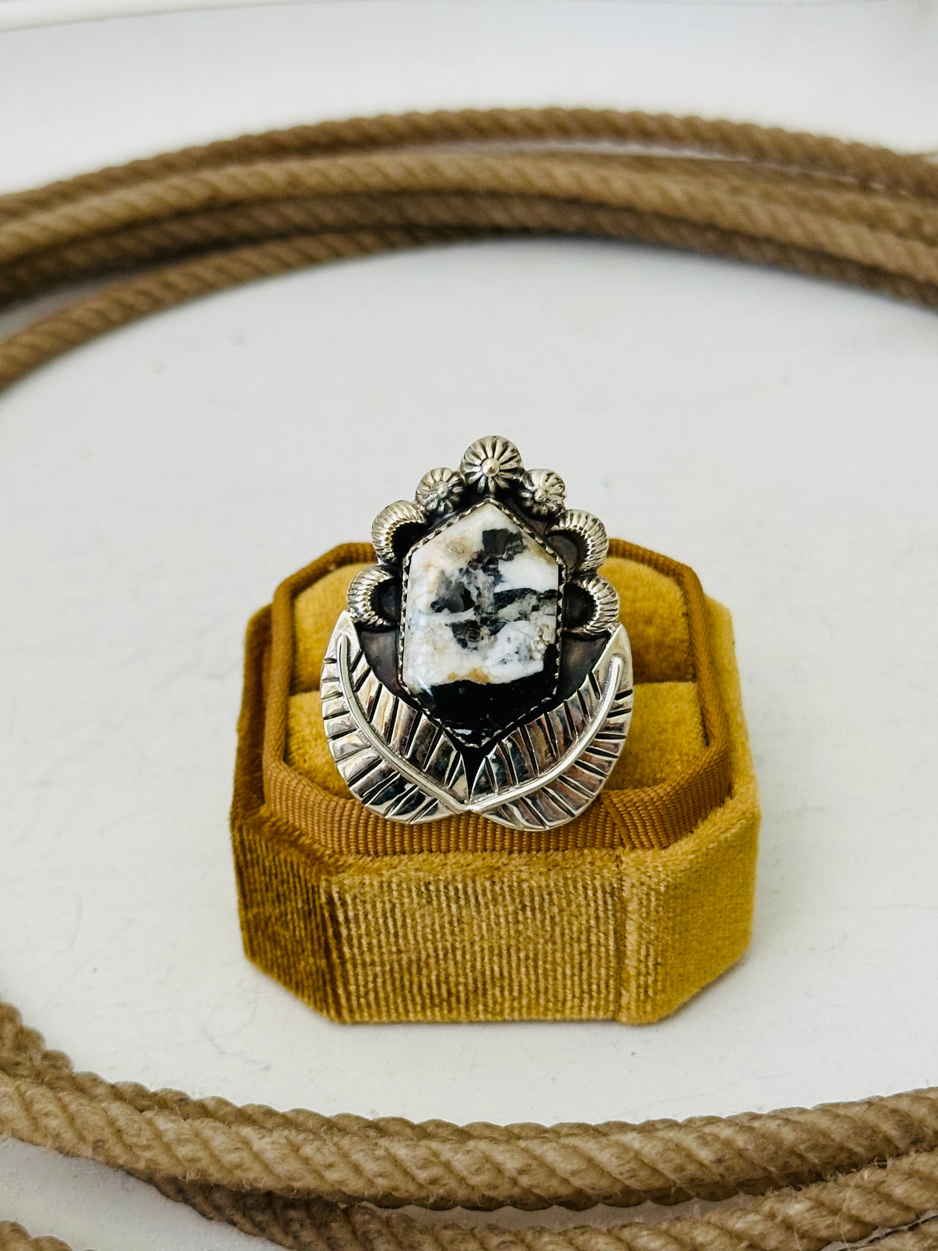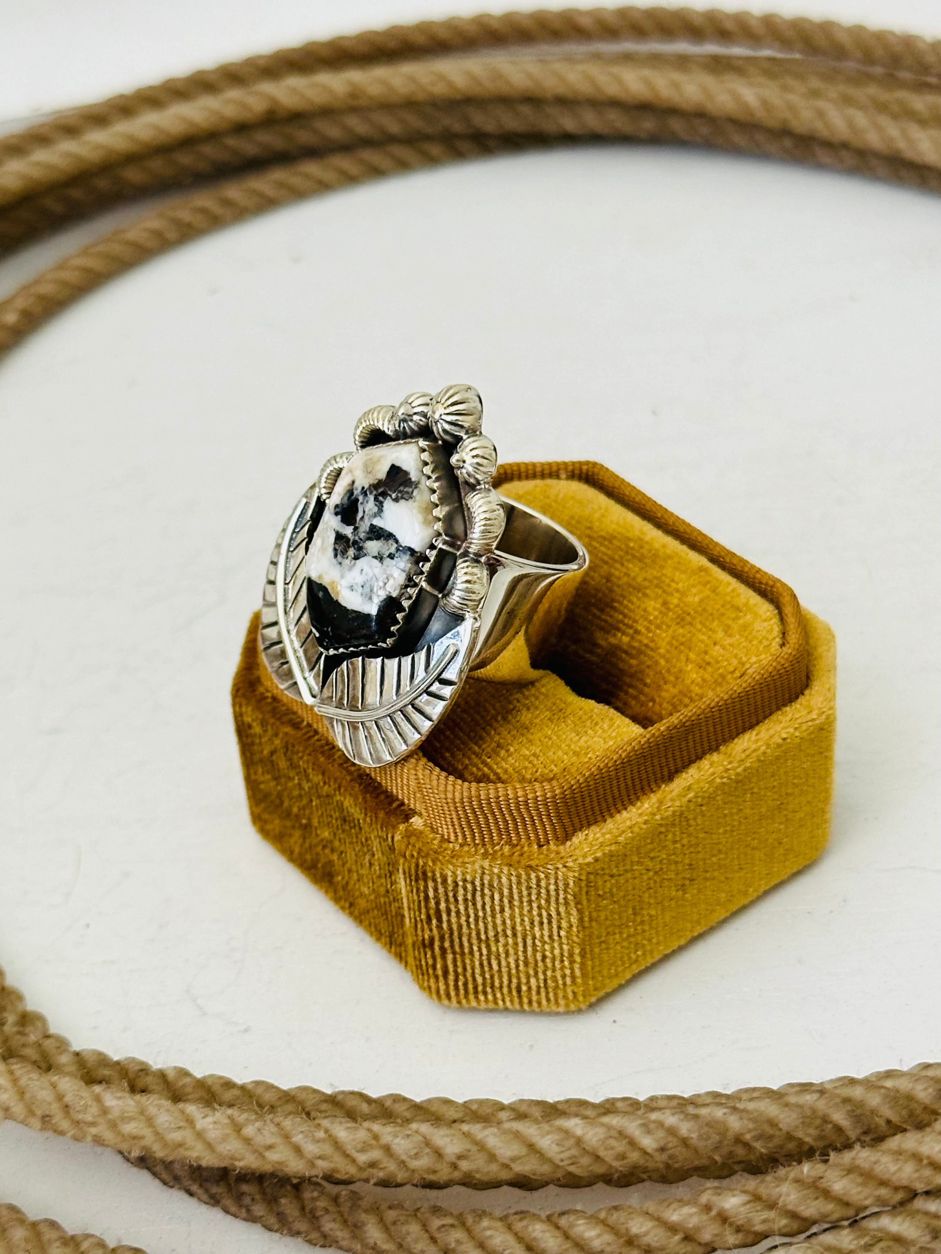 Beautiful ring. Southwest Handmade White Buffalo & Sterling Silver Adjustable Ring. It measures 1 1/2 inches long and 1 1/8 inches wide. Signed by the artist and stamped sterling silver.
