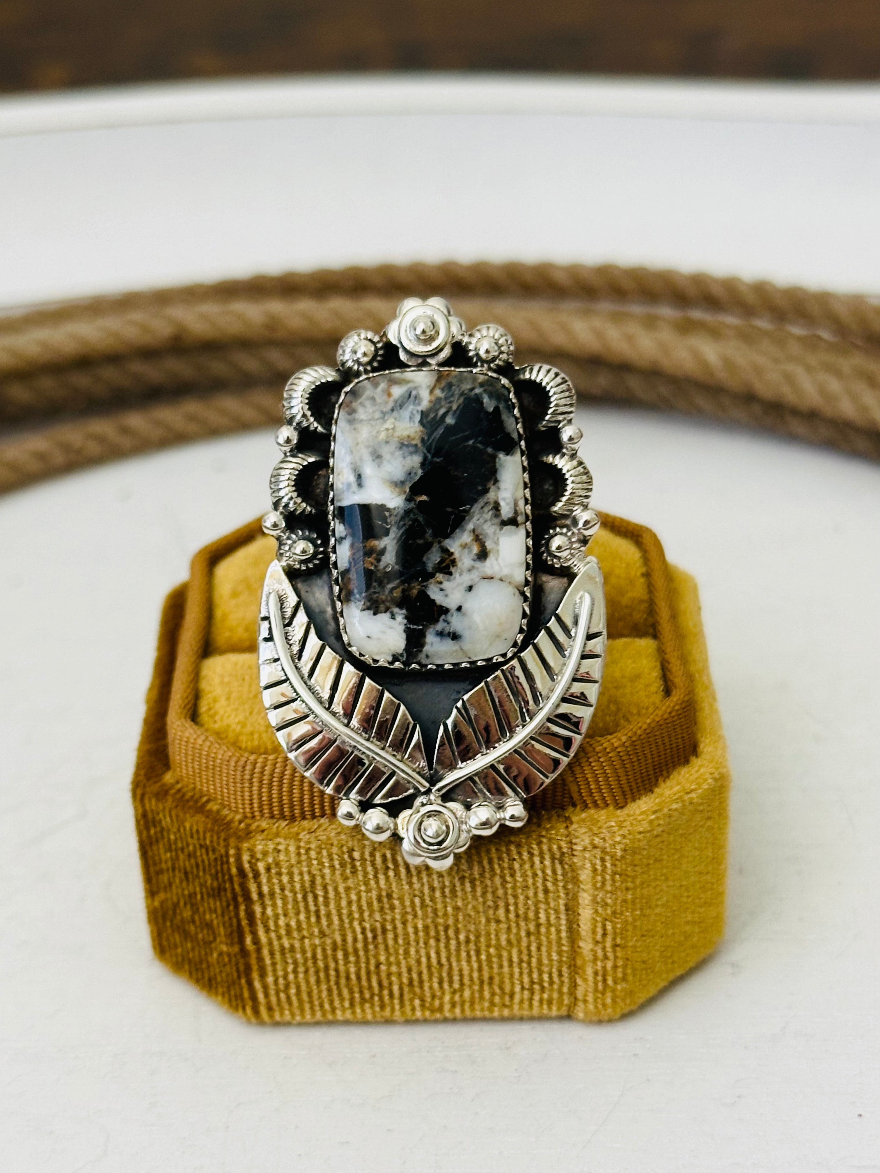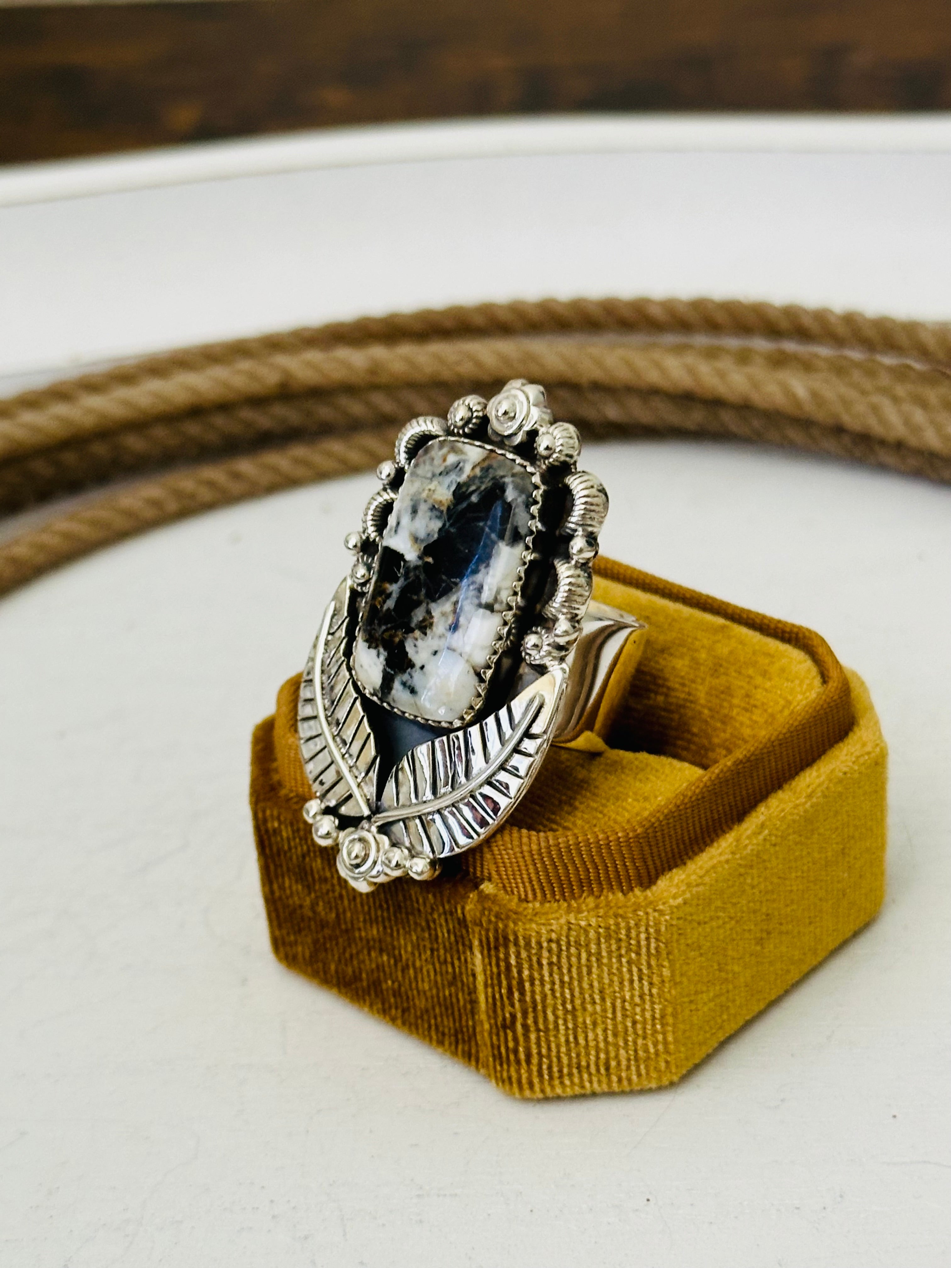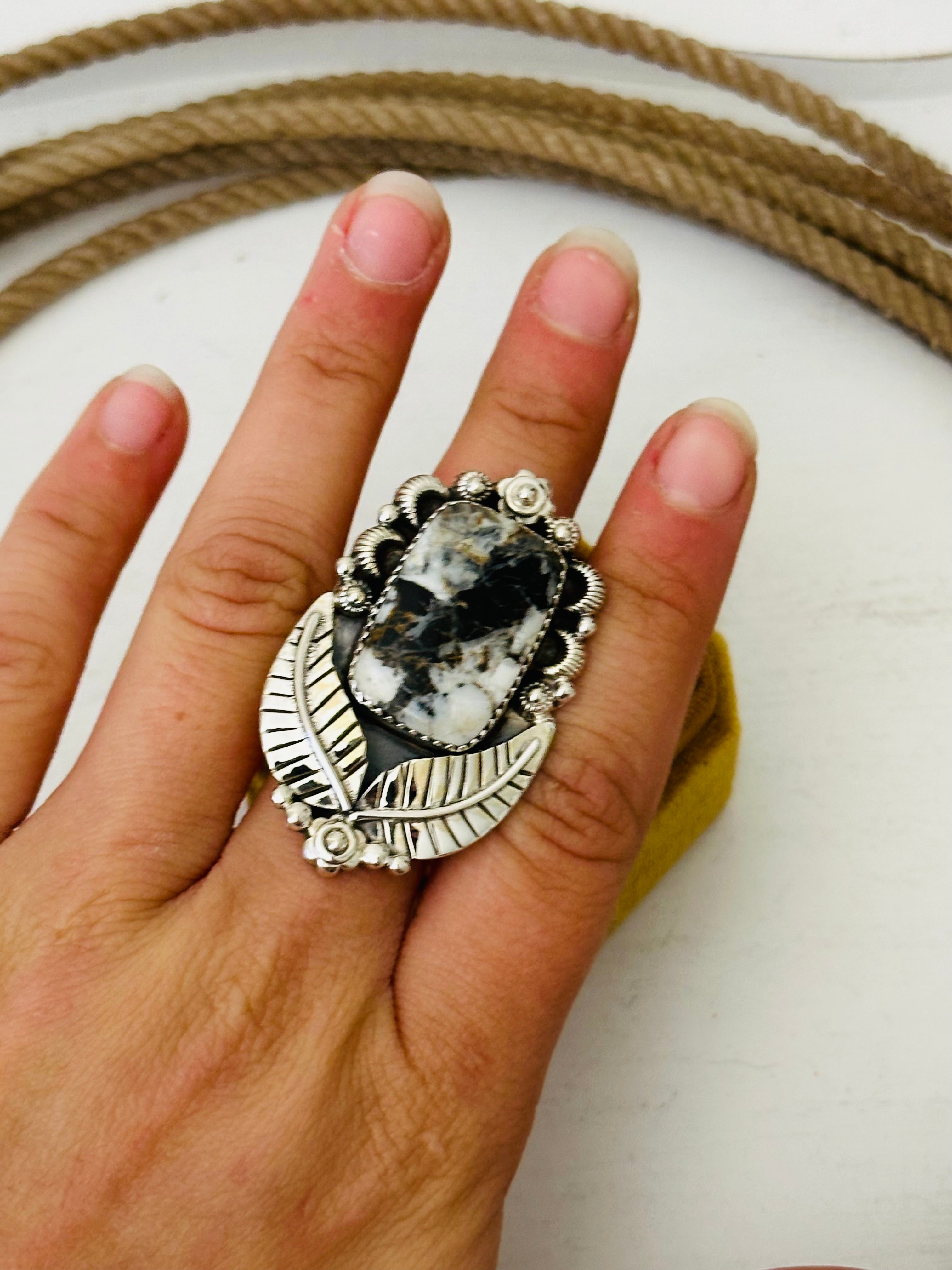 Beautiful ring. Southwest Handmade White Buffalo & Sterling Silver Adjustable Ring. It measures 1 7/8 inches long and 1 inch wide. Signed by the artist and stamped sterling silver.