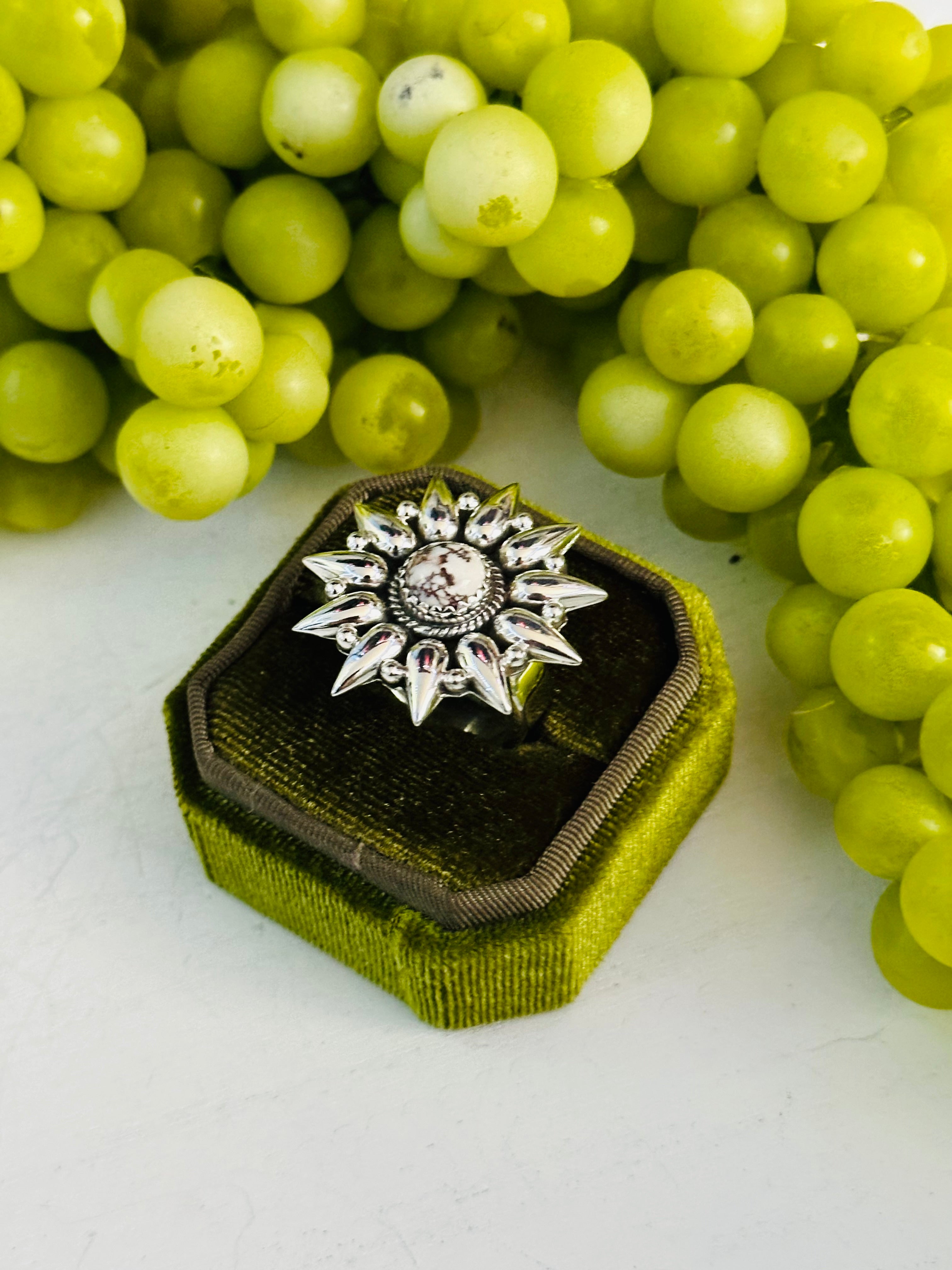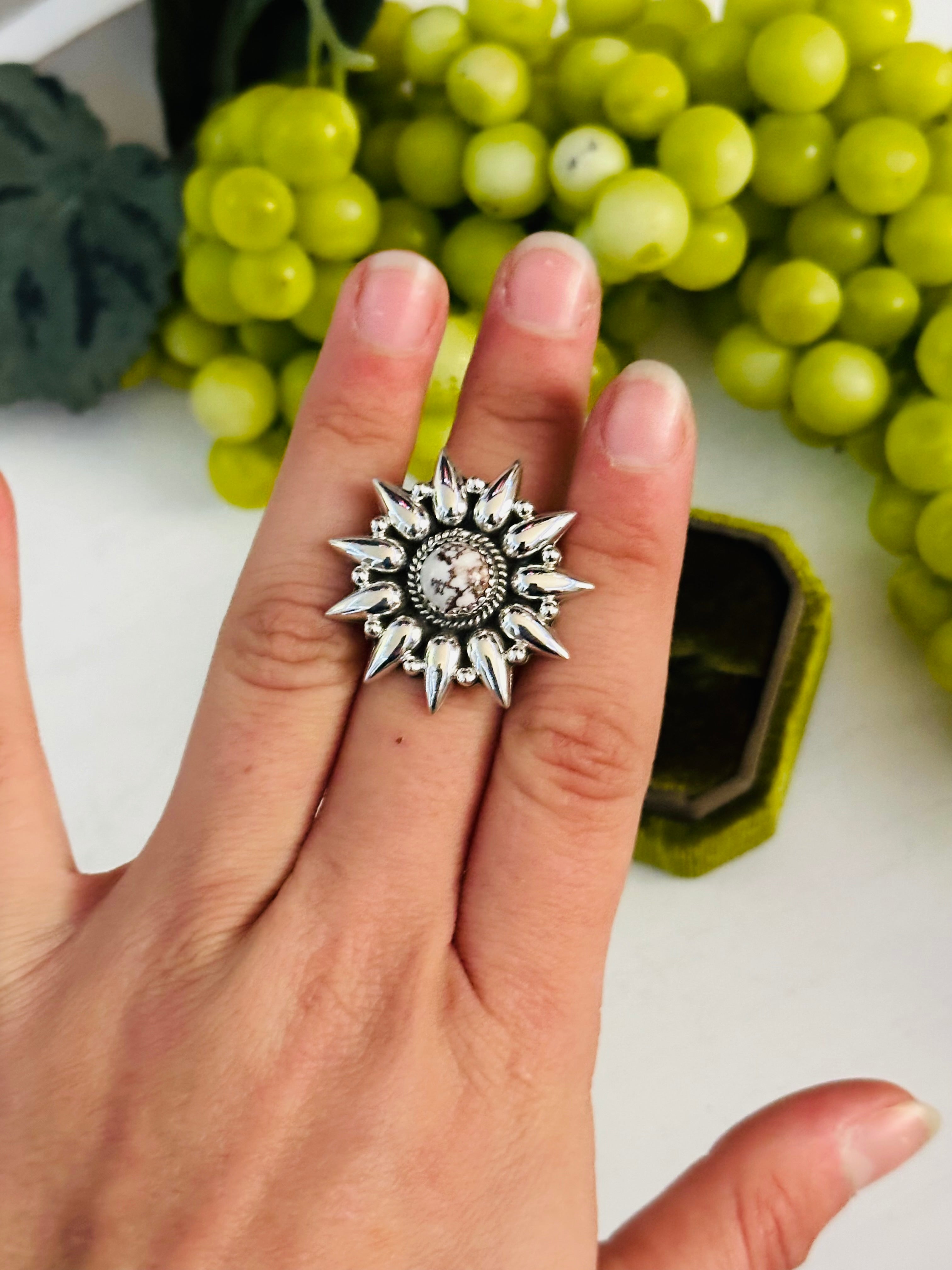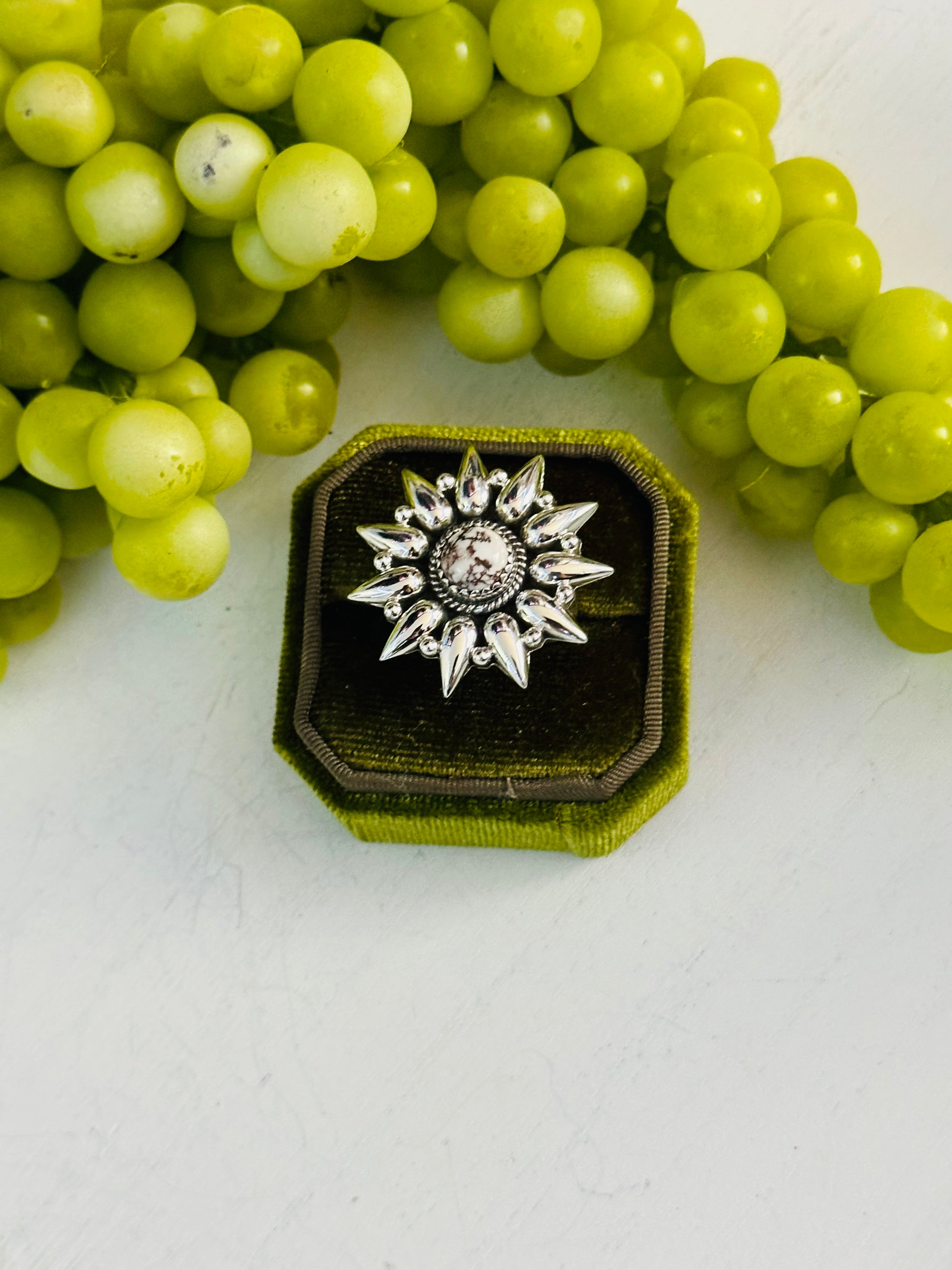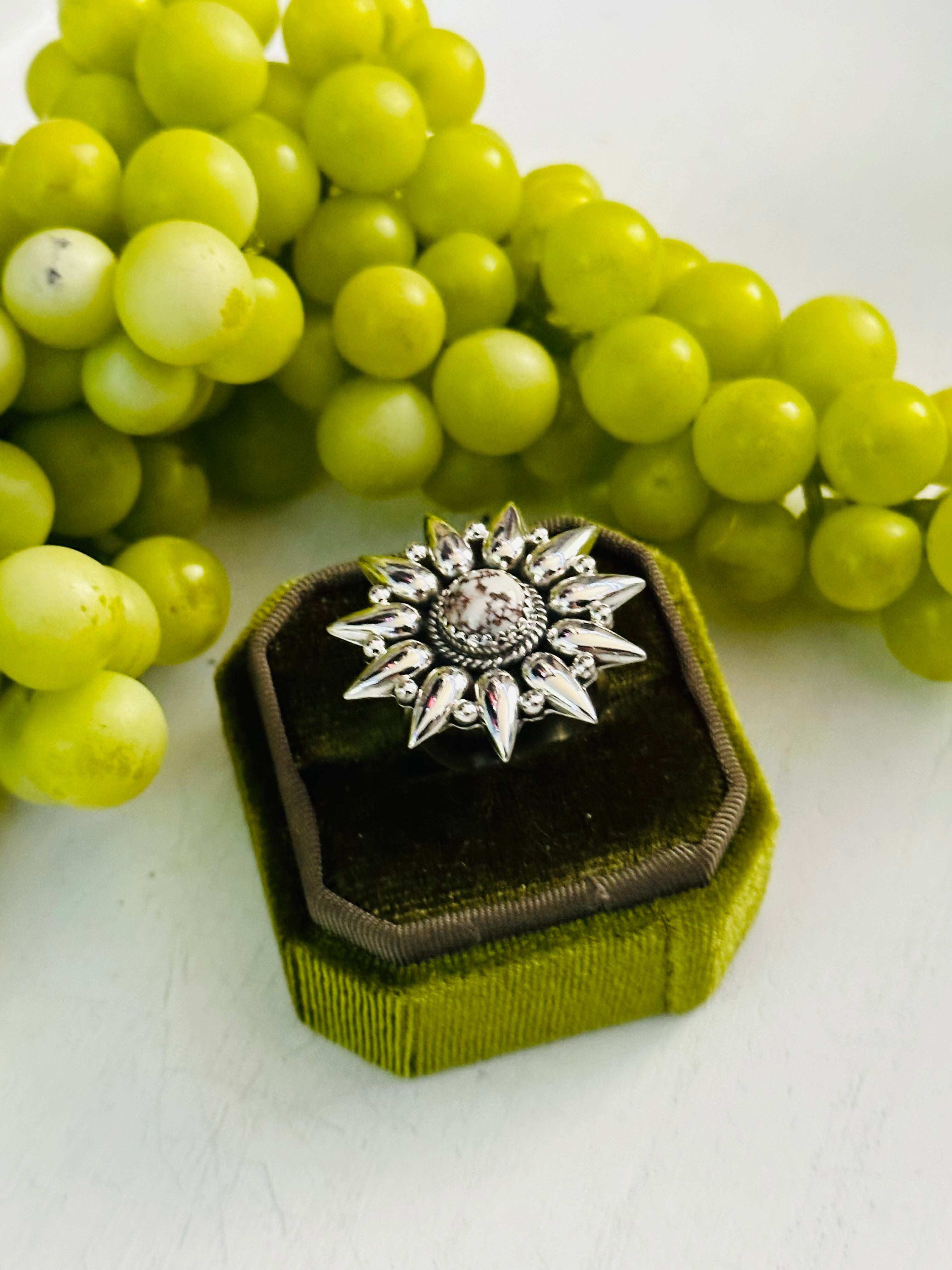 Beautiful ring. Southwest Handmade Wild Horse & Sterling Silver Adjustable Ring. It measures 1 1/4 inches round. Signed by the artist and stamped sterling silver.