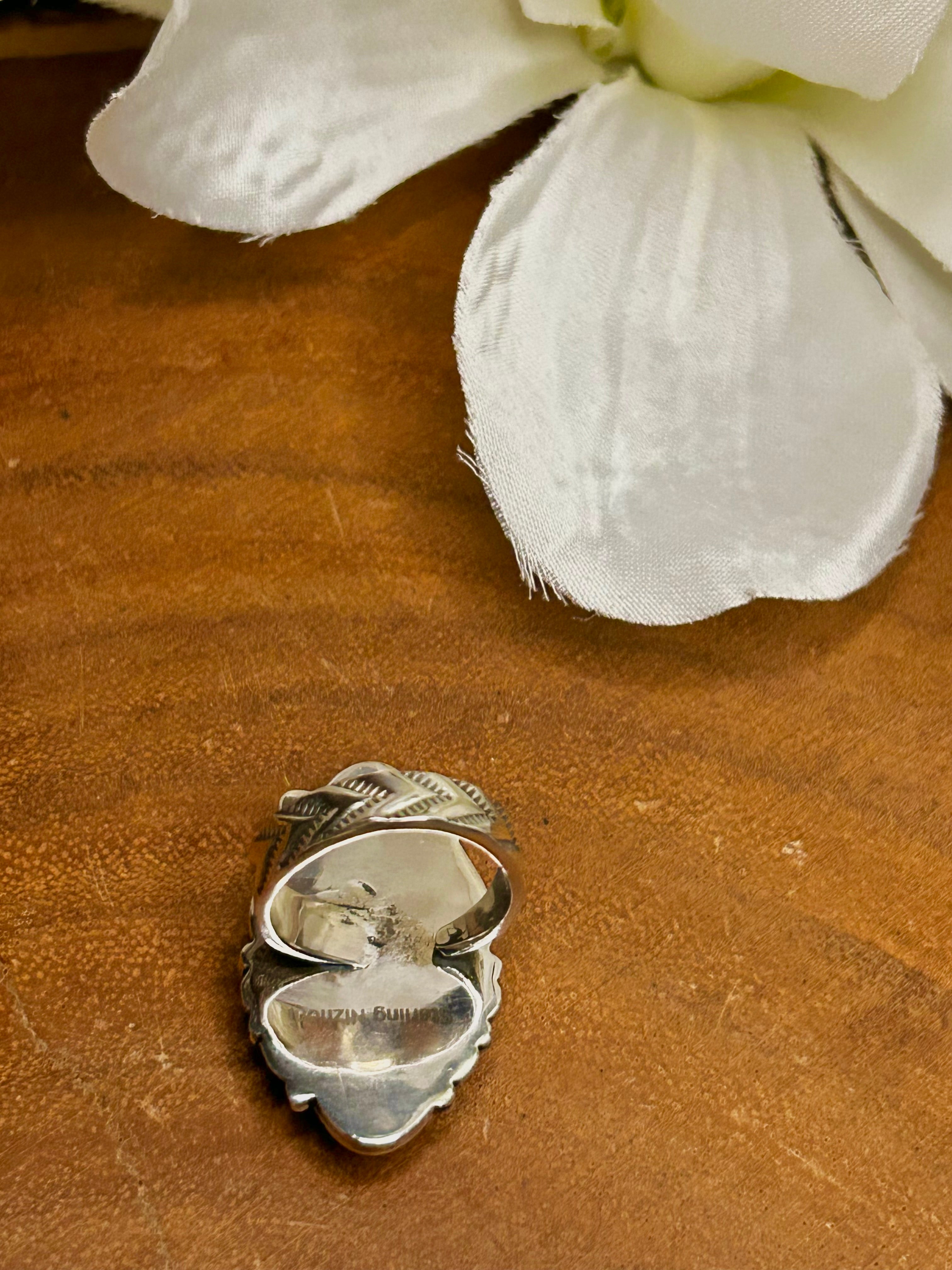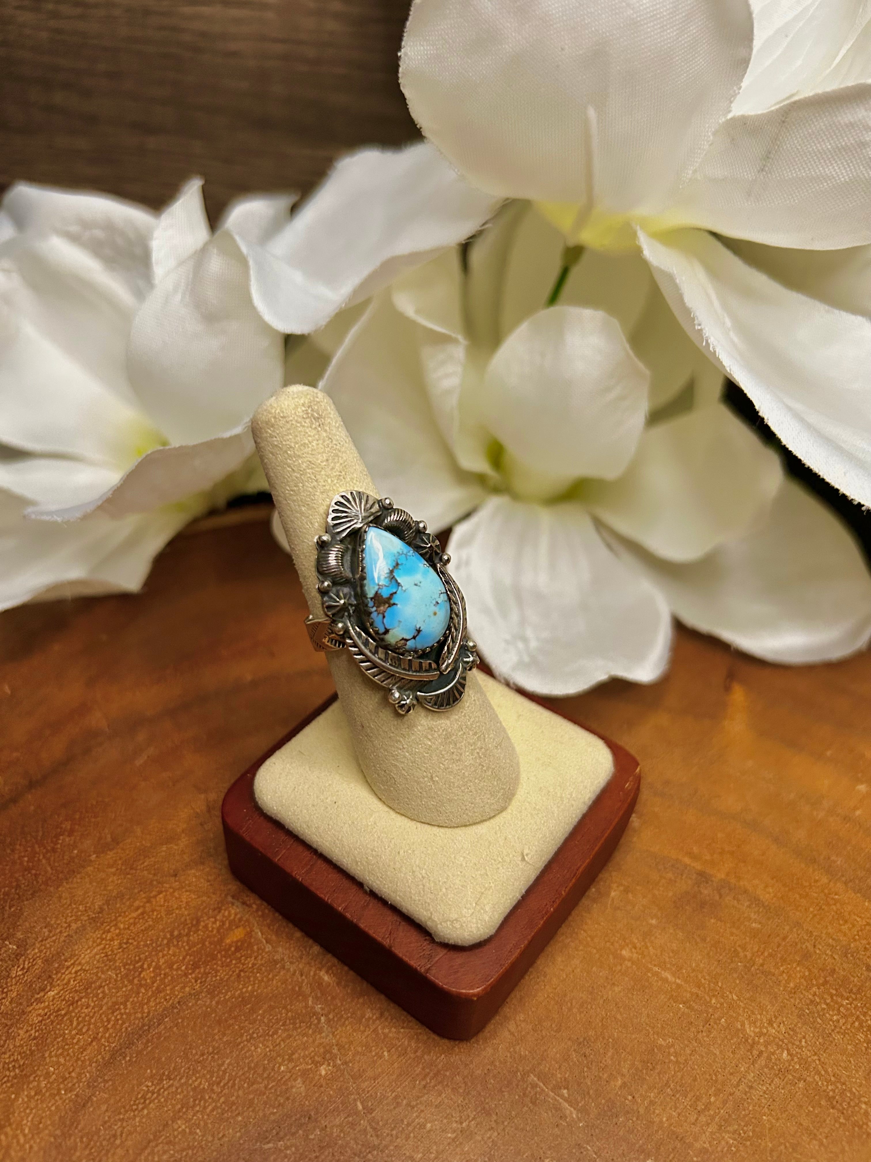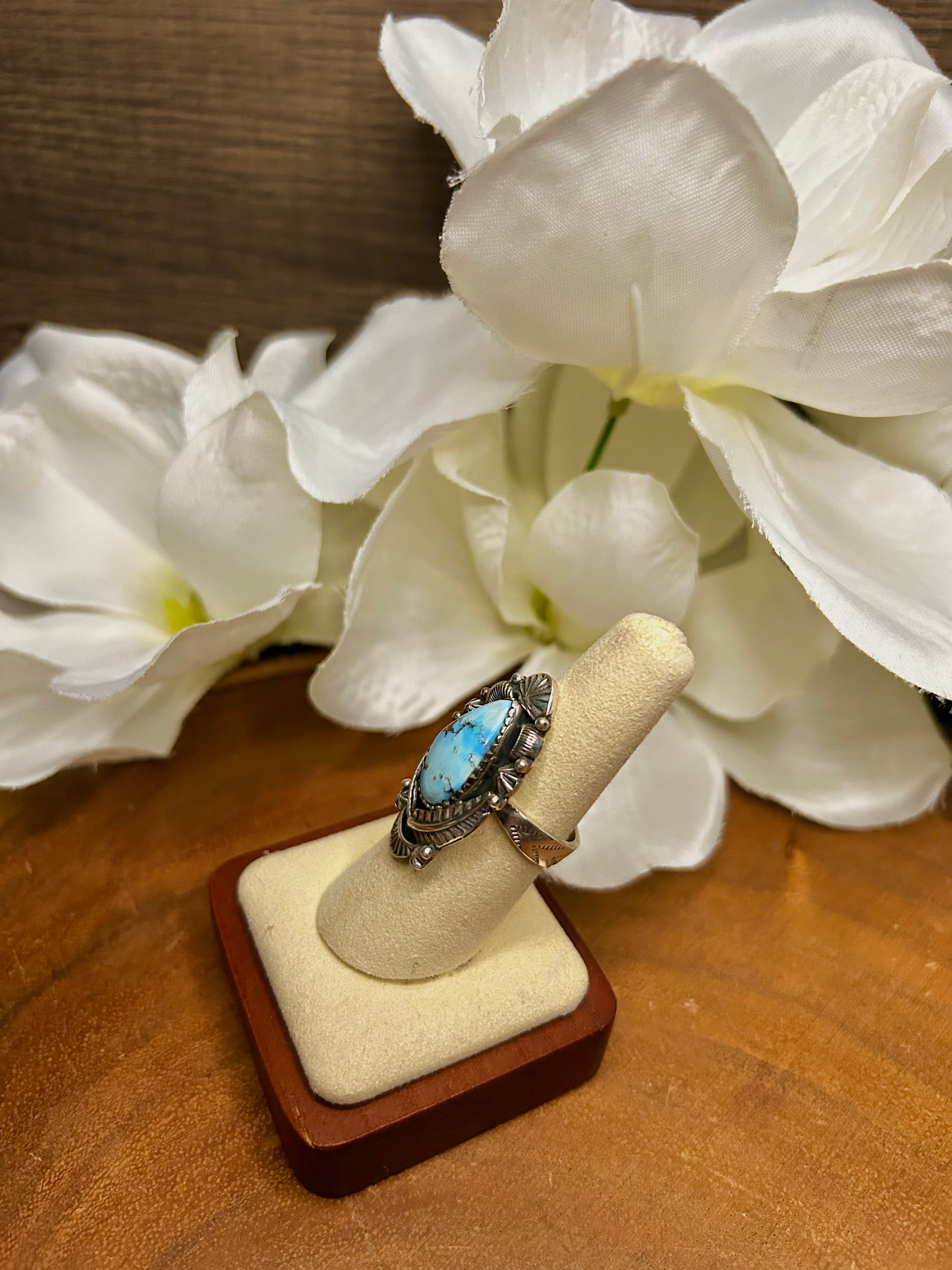Southwest Made Golden Hill’s Turquoise & Sterling Sliver Cluster Adjustable Ring. It measures 1 3/8 inches long and 7/8 of an inch wide. Signed by the artist and stamped sterling silver.