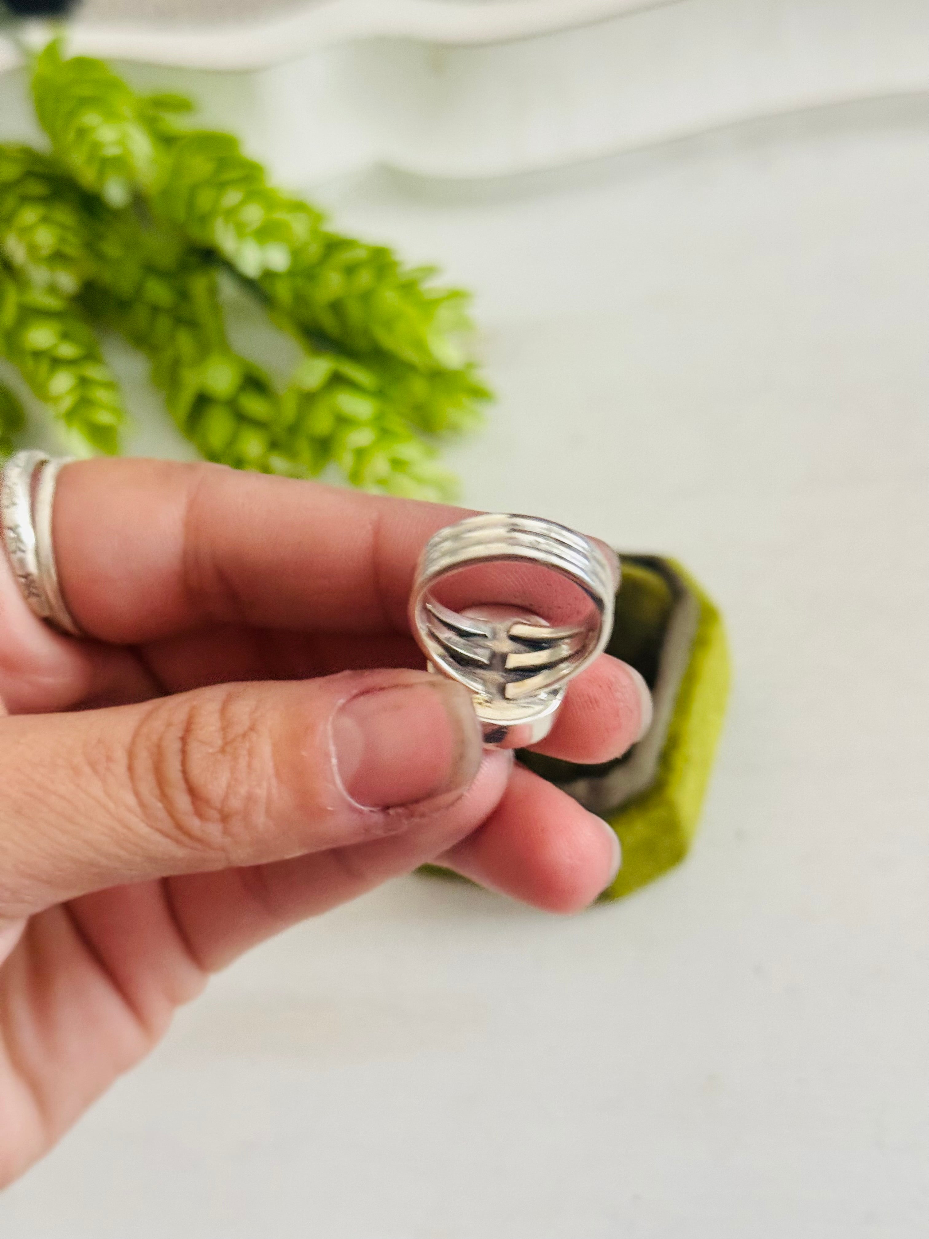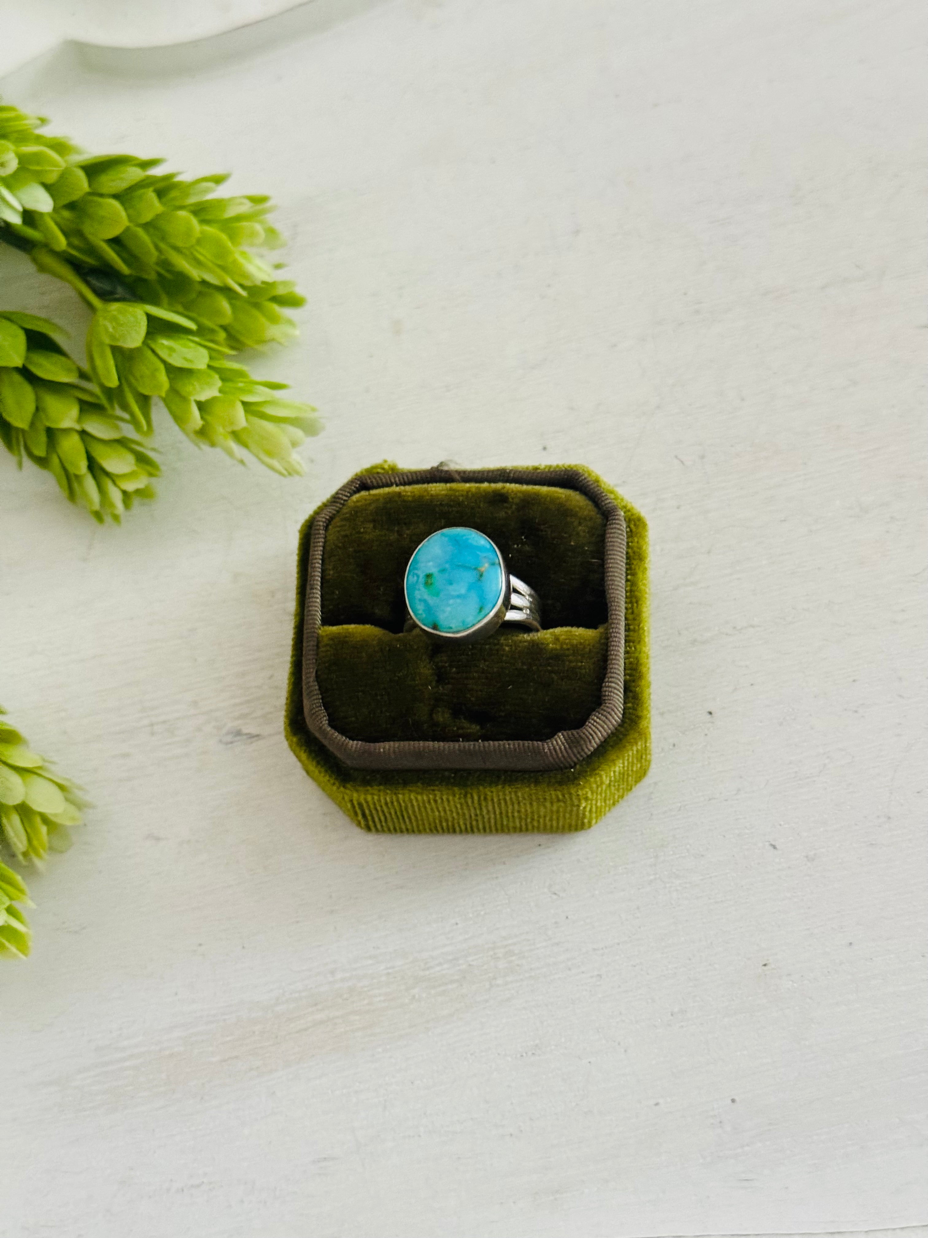 Southwest Made Kingman Turquoise & Sterling Sliver Ring Size 5.75. It measures 5/8 of an inch long and just over 1/2 of an inch wide.