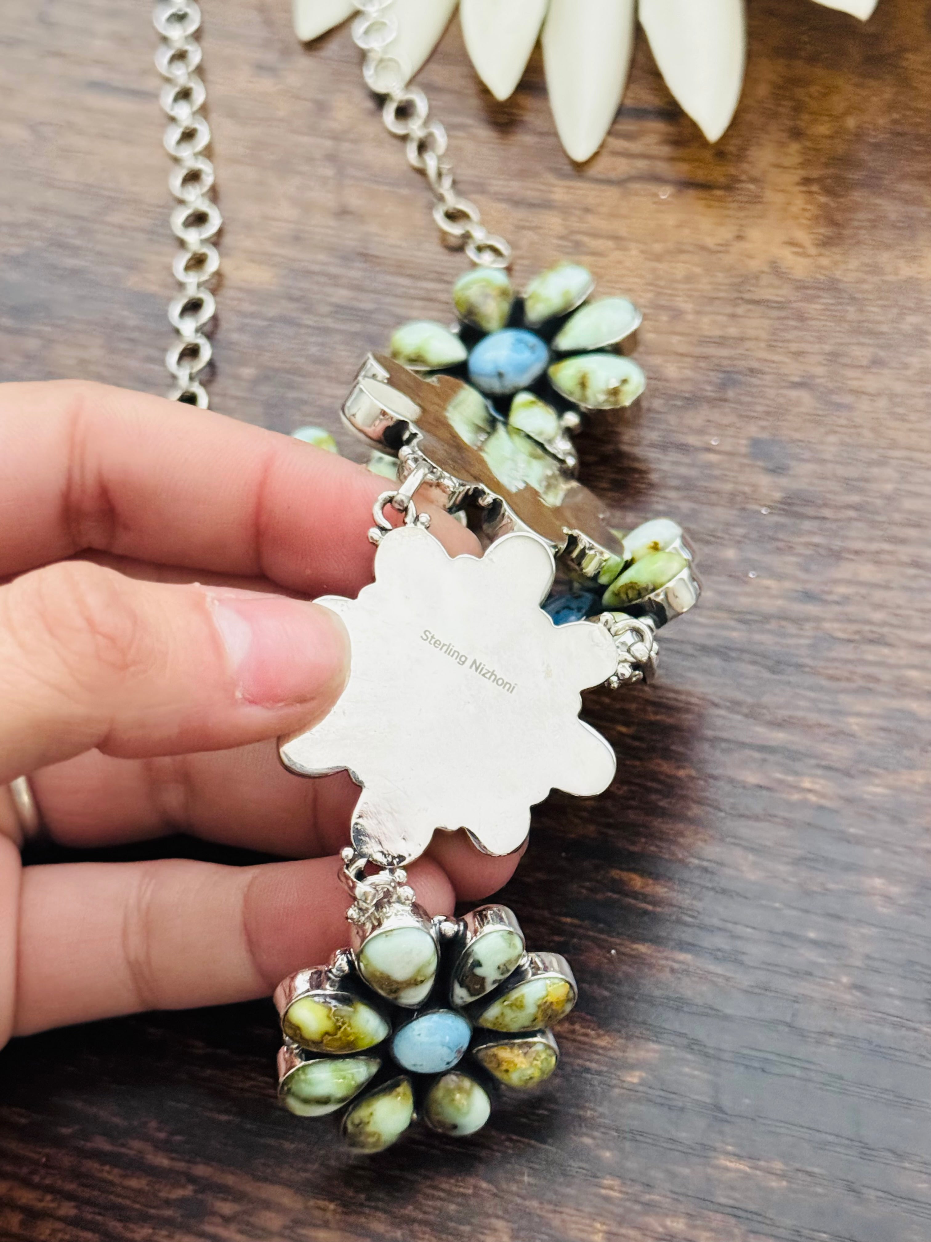 Beautiful necklace set. Southwest Made Multi Stone & Sterling Silver Necklace. It measures 24 inches long with hang while the chain by itself measures 18 inches long. Signed by the artist and stamped sterling silver.