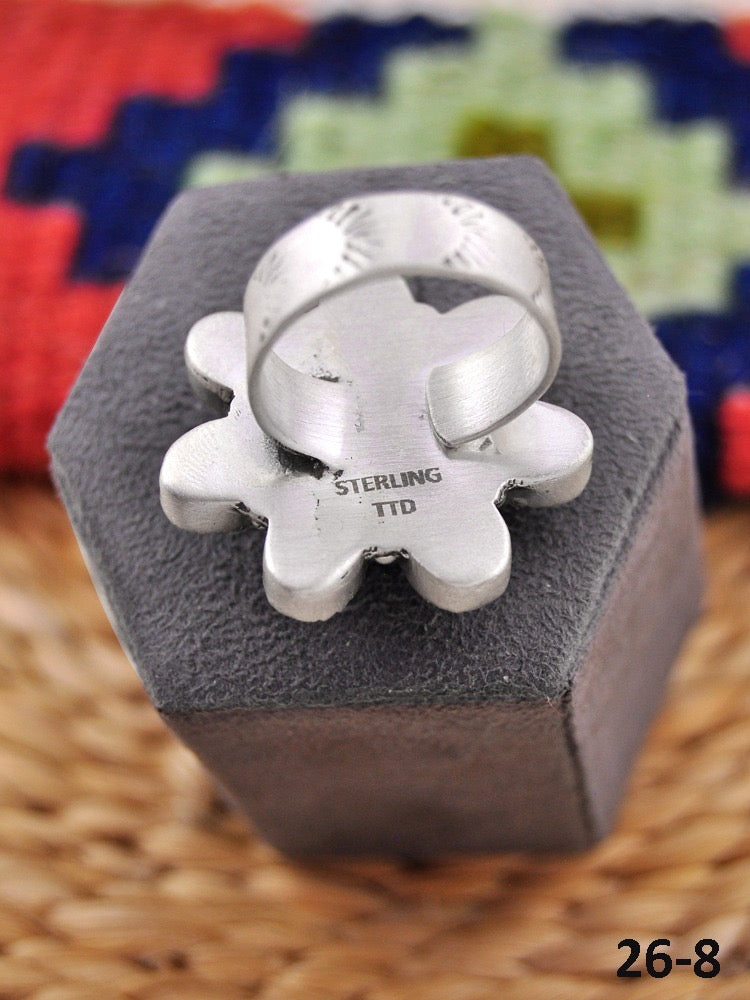 Southwest Made White Buffalo & Sterling Sliver Cluster Adjustable Ring. It measures 1 1/4 inches long and 1 1/4 inches wide. Signed by the artist and stamped sterling silver.