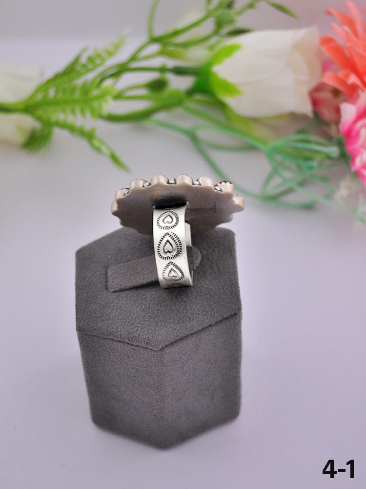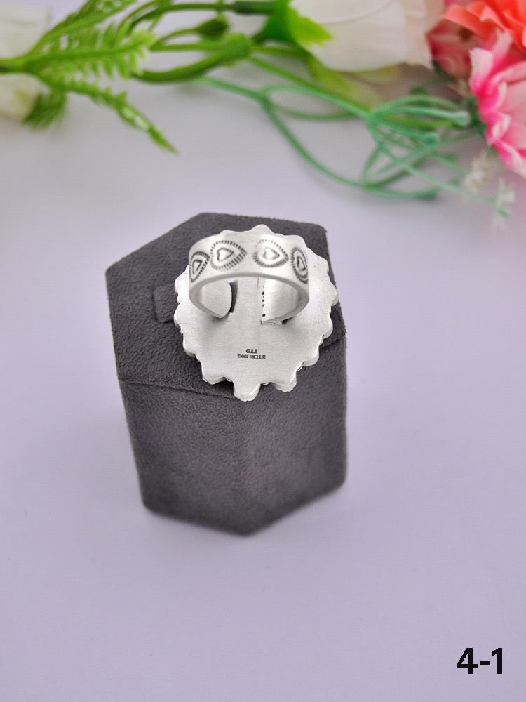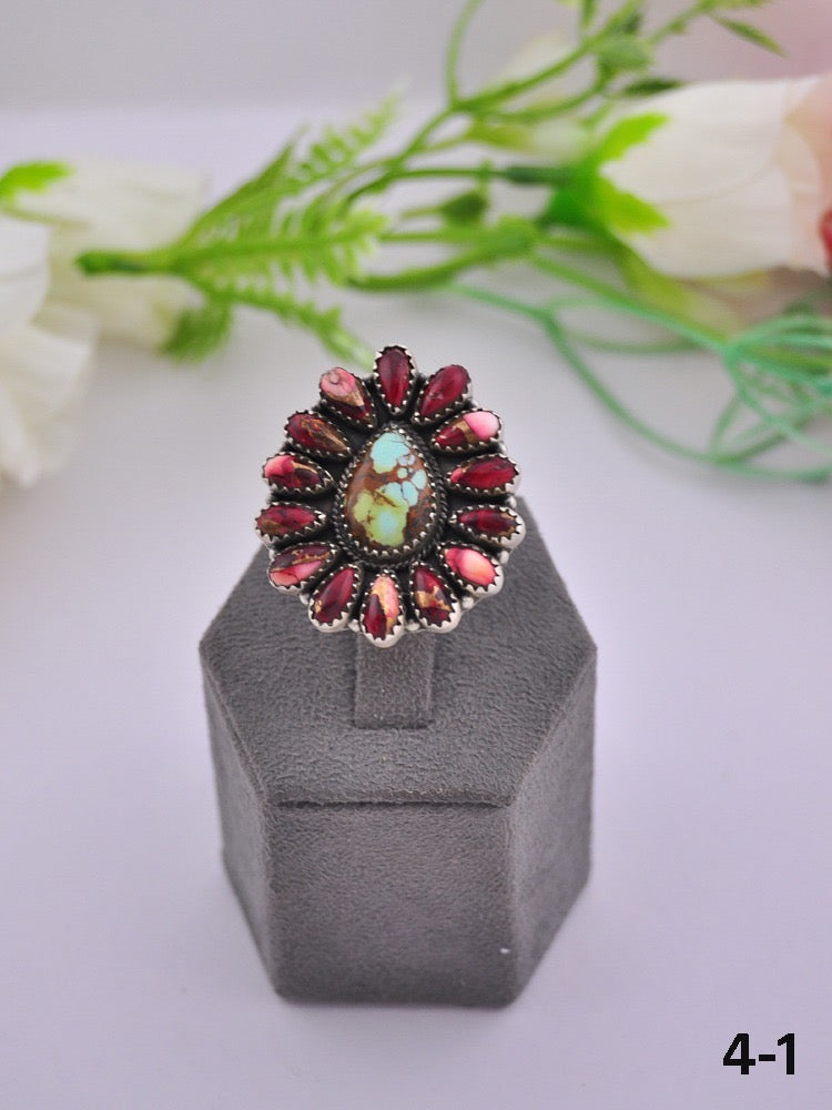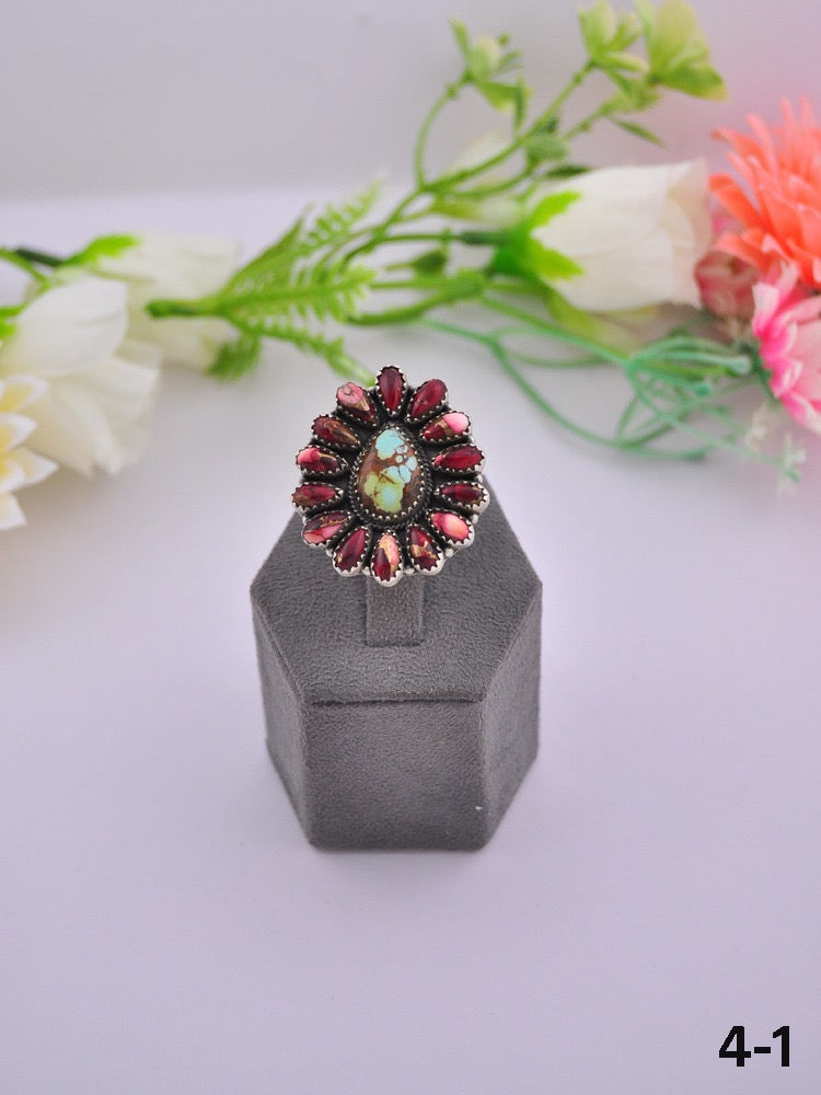 Southwest Made Multi Stone & Sterling Sliver Cluster Adjustable Ring. It measures 1 1/2 inches long and 1 1/4 inches wide. Signed by the artist and stamped sterling silver. Stones may differ due to natural stones.