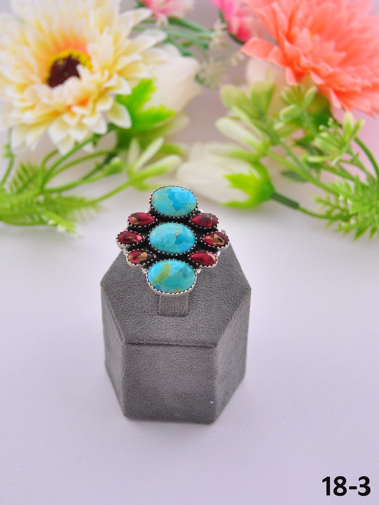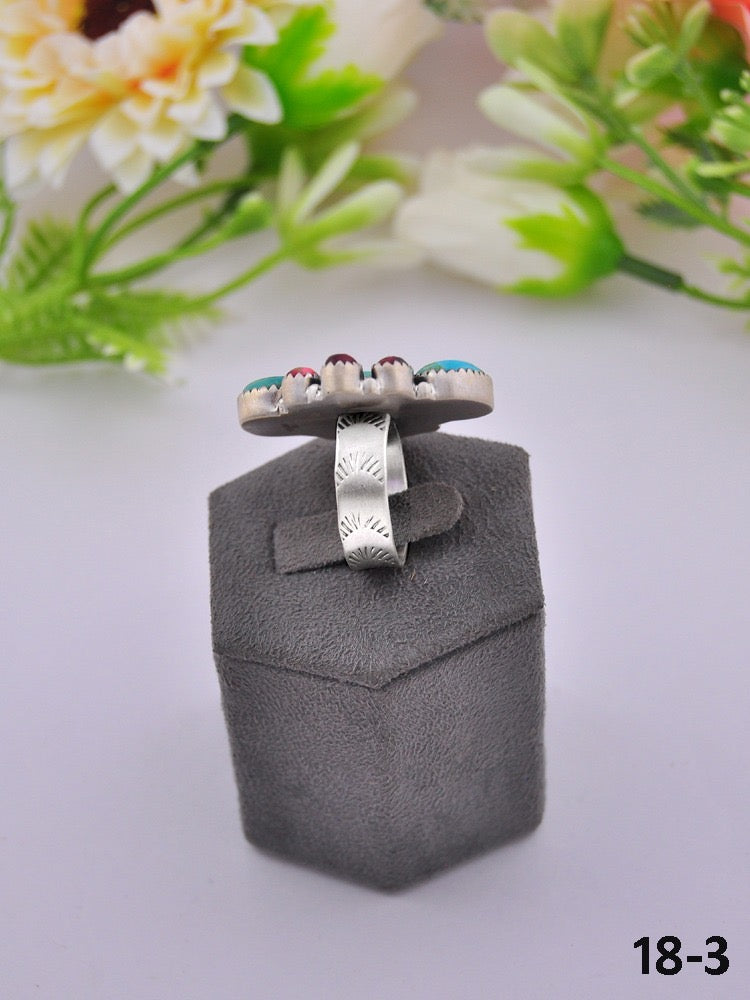 Southwest Made Multi Stone & Sterling Sliver Cluster Adjustable Ring. It measures 1 3/8 inches long and 1 3/8 inches wide. Signed by the artist and stamped sterling silver. Stones may differ due to natural stones.