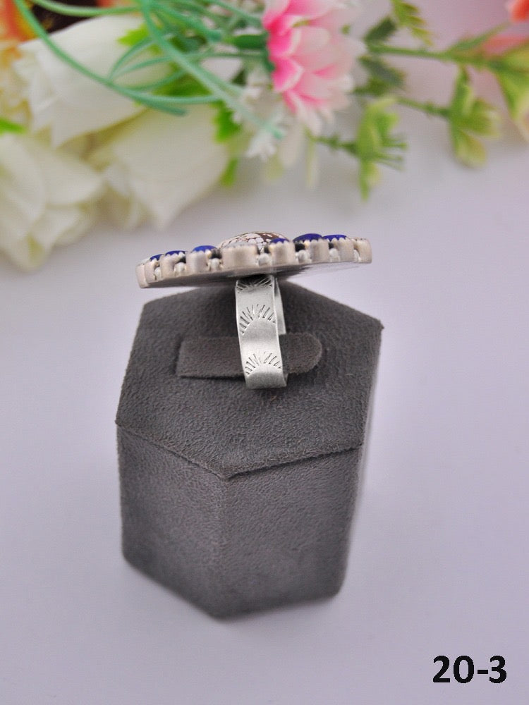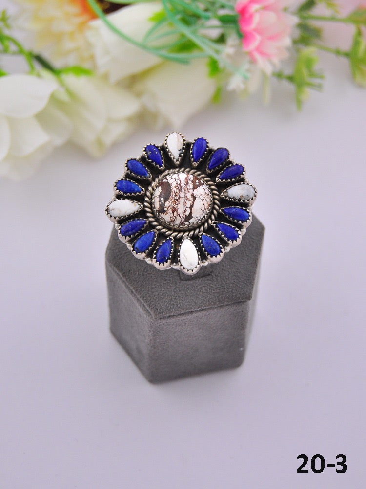 Southwest Made Multi Stone & Sterling Sliver Cluster Adjustable Ring. It measures 1 5/8 inches long and 1 5/8 inches wide. Signed by the artist and stamped sterling silver. Stones may differ due to natural stones.