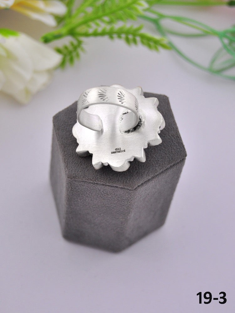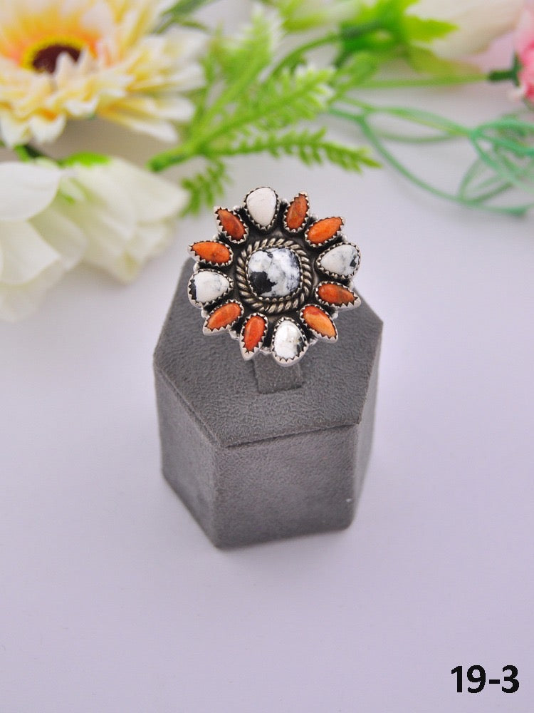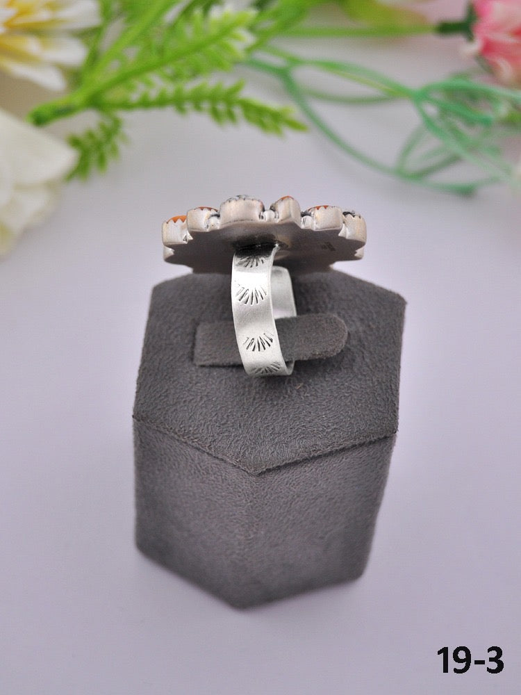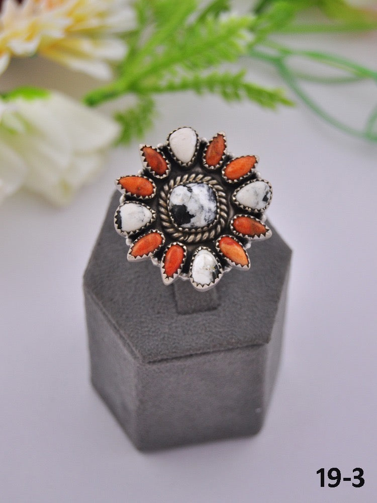 Southwest Made Multi Stone & Sterling Sliver Cluster Adjustable Ring. It measures 1 1/4 inches long and 1 1/4 inches wide. Signed by the artist and stamped sterling silver. Stones may differ due to natural stones.