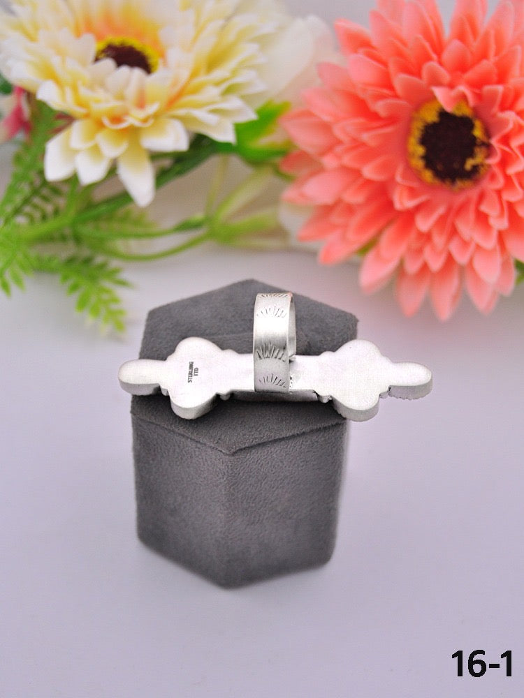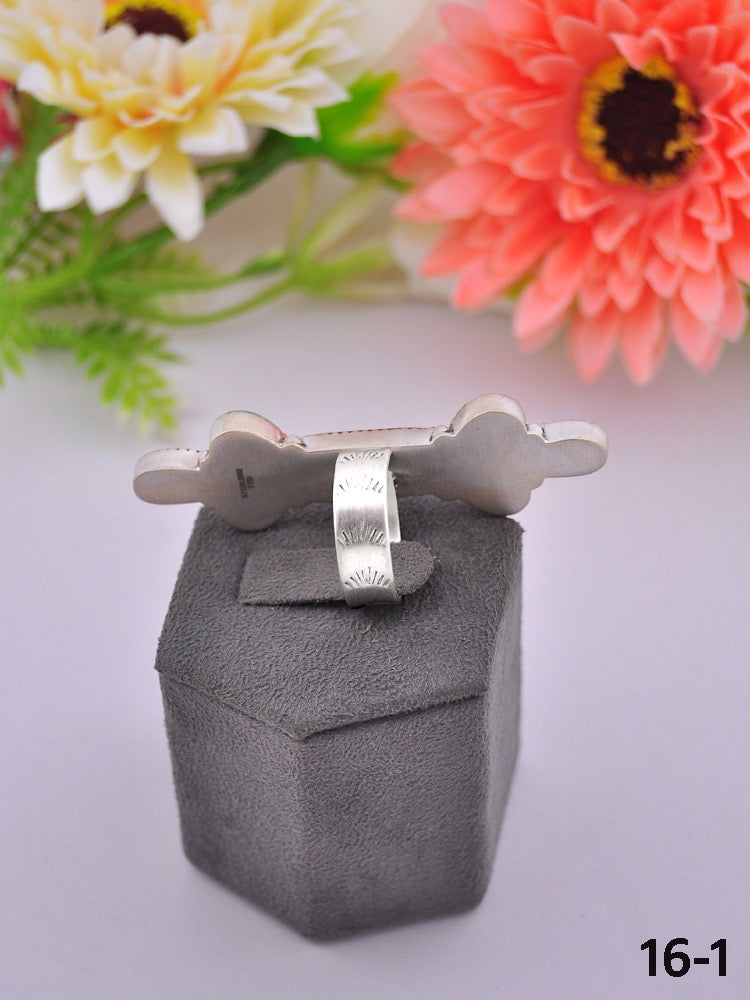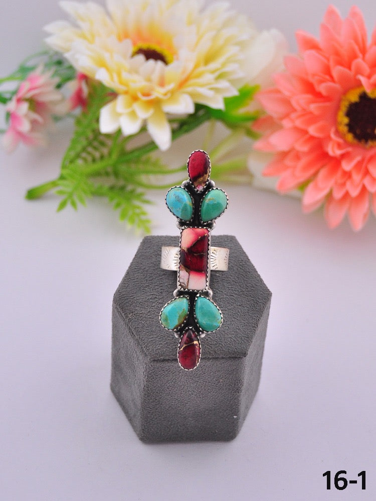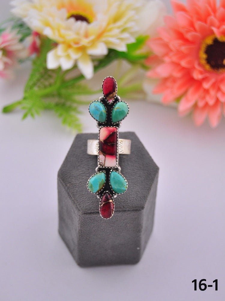 Southwest Made Multi Stone & Sterling Sliver Cluster Adjustable Ring. It measures 2 1/2 inches long and 3/4 of an inch wide. Signed by the artist and stamped sterling silver. Stones may differ due to natural stones.