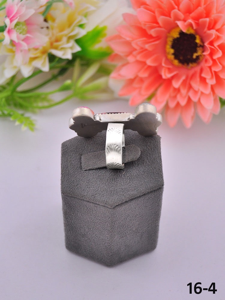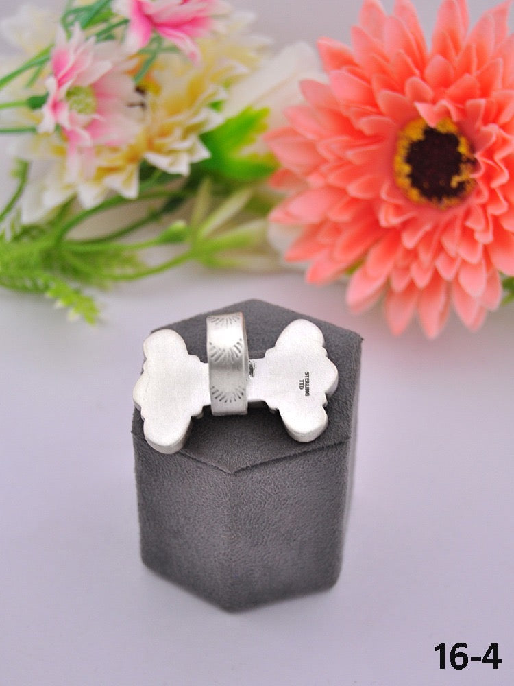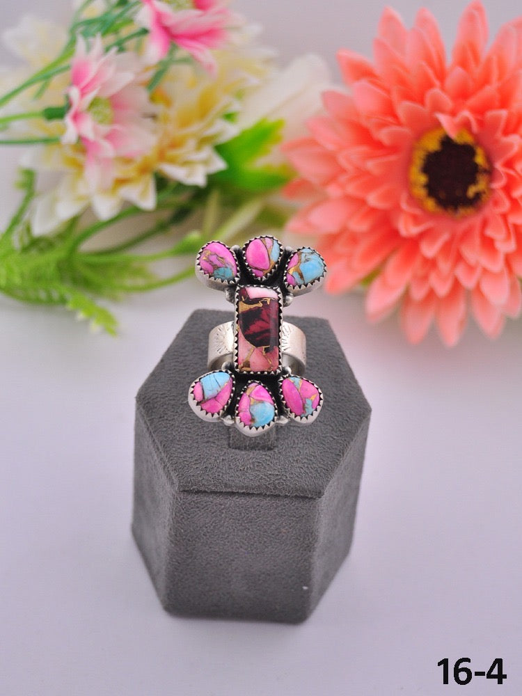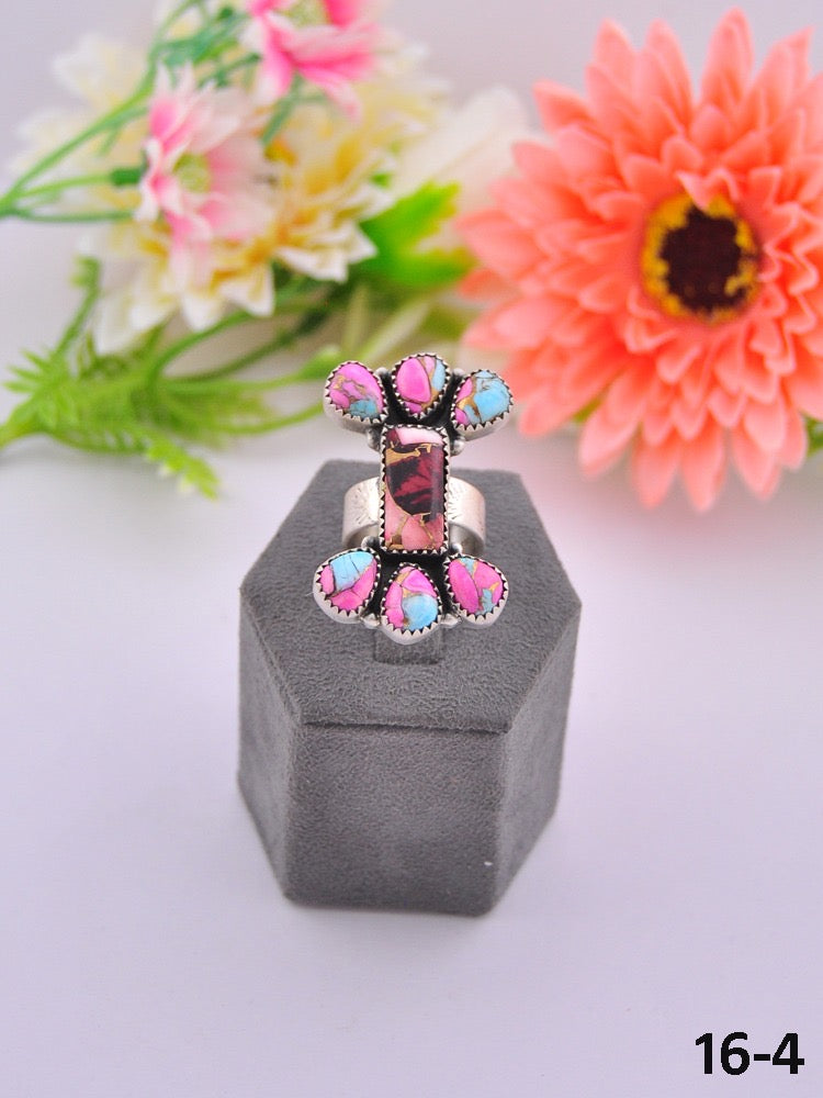 Southwest Made Multi Stone & Sterling Sliver Cluster Adjustable Ring. It measures 1 5/8 inches long and 1 inch wide. Signed by the artist and stamped sterling silver. Stones may differ due to natural stones.