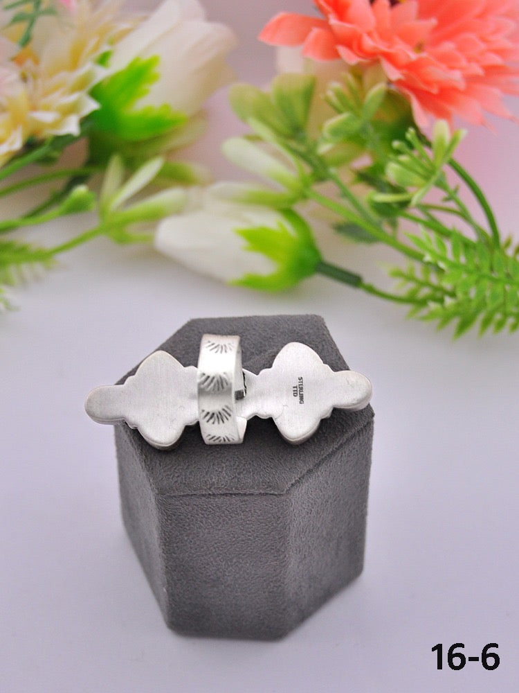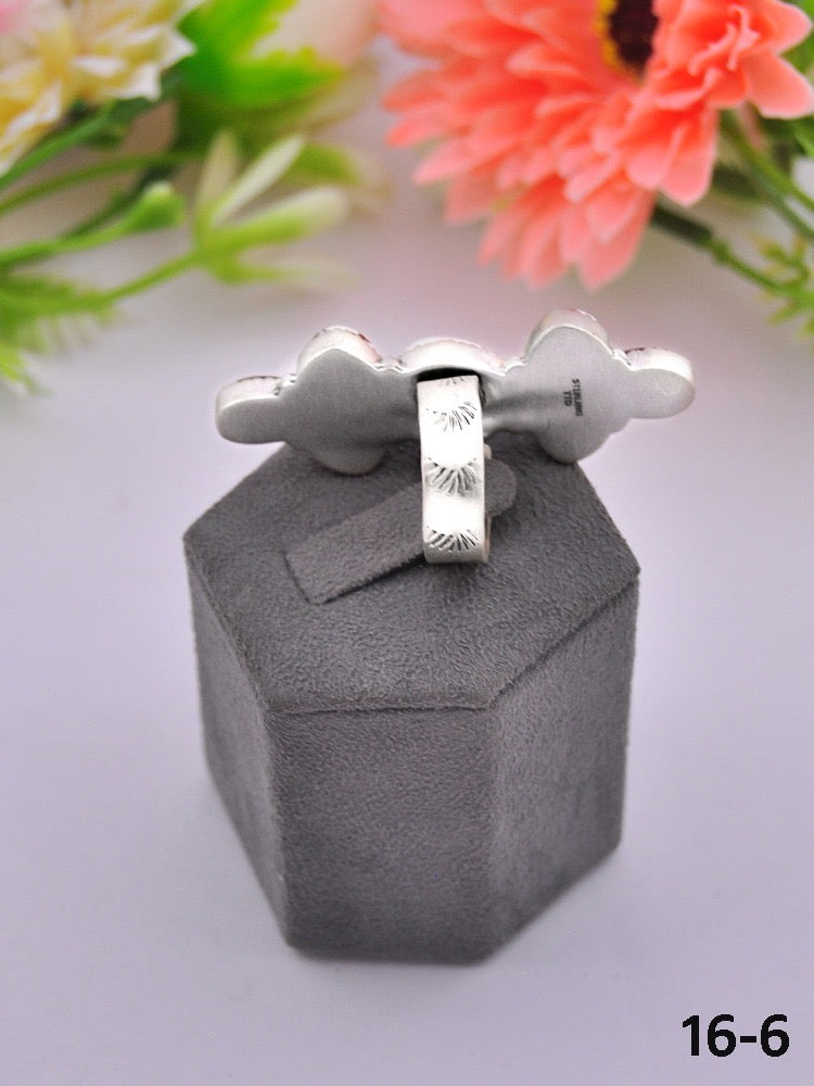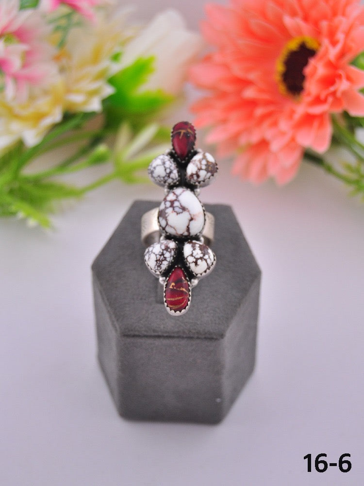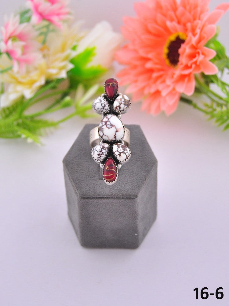 Southwest Made Multi Stone & Sterling Sliver Cluster Adjustable Ring. It measures 2 1/8 inches long and 3/4 of an inch wide. Signed by the artist and stamped sterling silver. Stones may differ due to natural stones.