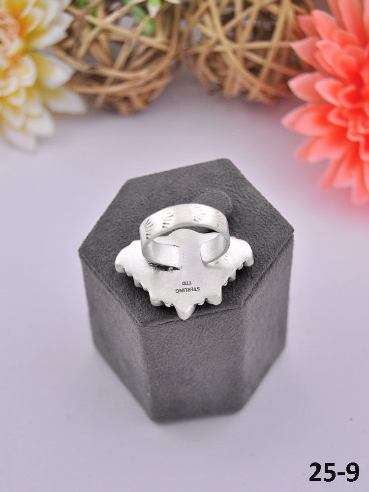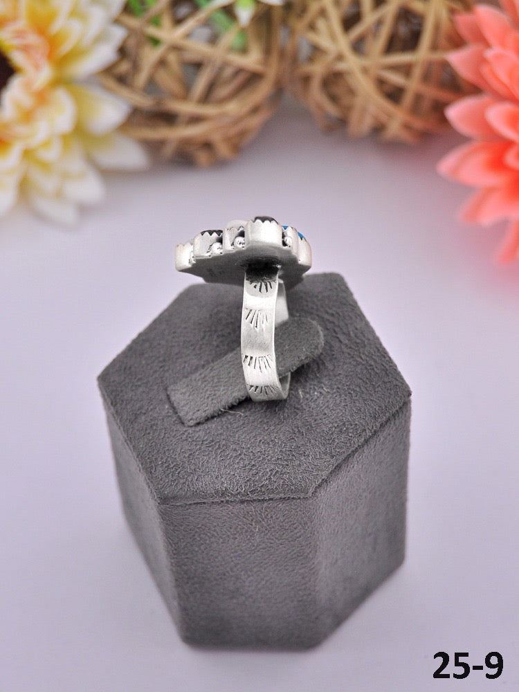 Southwest Made Multi Stone & Sterling Sliver Cluster Adjustable Ring. It measures 7/8 of an inch long and 1 1/4 inches wide. Signed by the artist and stamped sterling silver. Stones may differ due to natural stones.