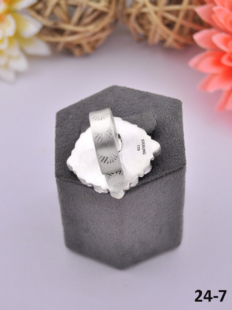 Southwest Made Multi Stone & Sterling Sliver Cluster Adjustable Ring. It measures 1 1/8 inches long and 1 1/8 inches wide. Signed by the artist and stamped sterling silver. Stones may differ due to natural stones.