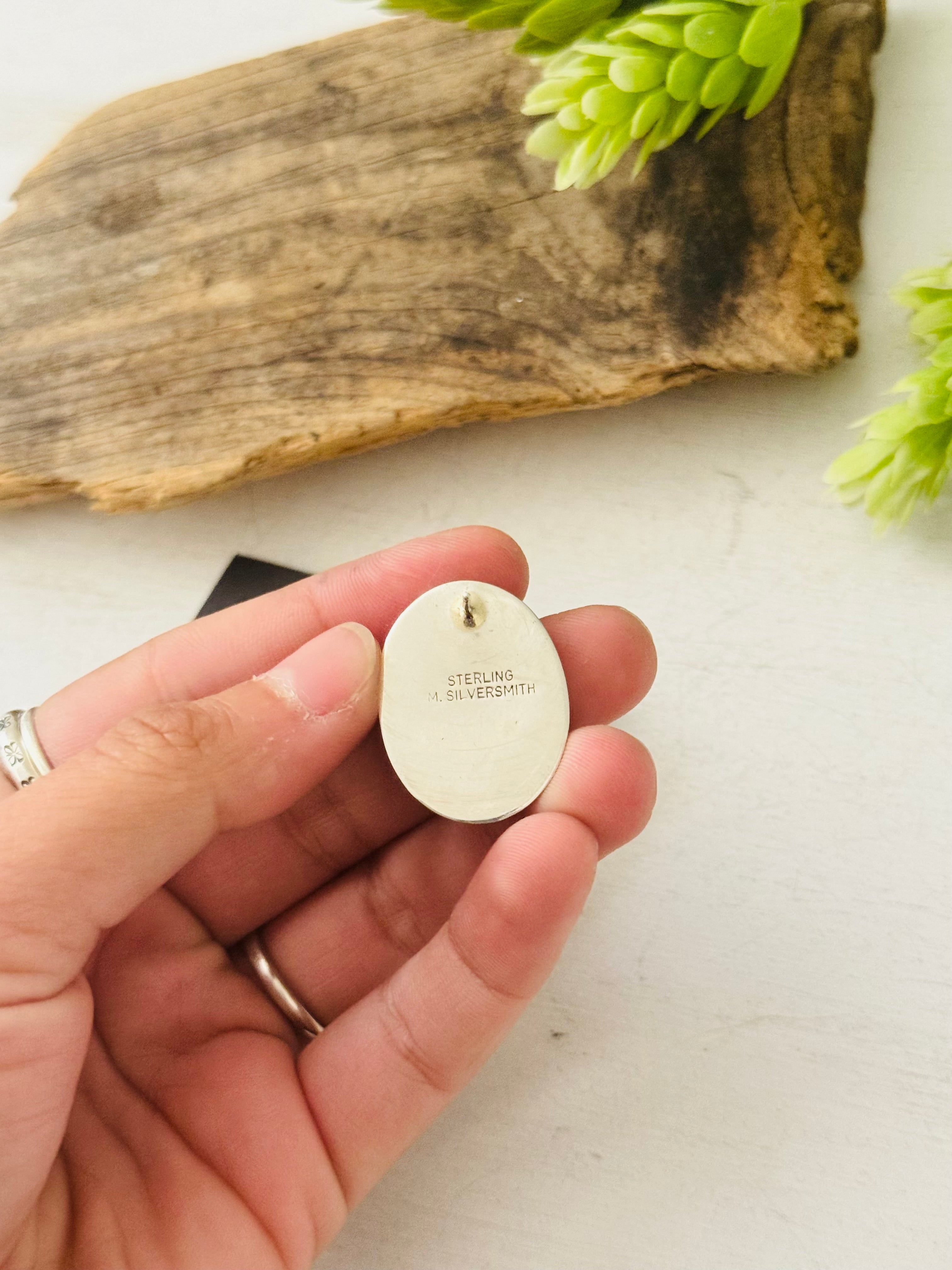 Navajo Made New Lander Variscite & Sterling Silver Post Earrings. It measures 1 1/8 inches long and 7/8 of an inch wide. Signed by the artist and stamped sterling silver.