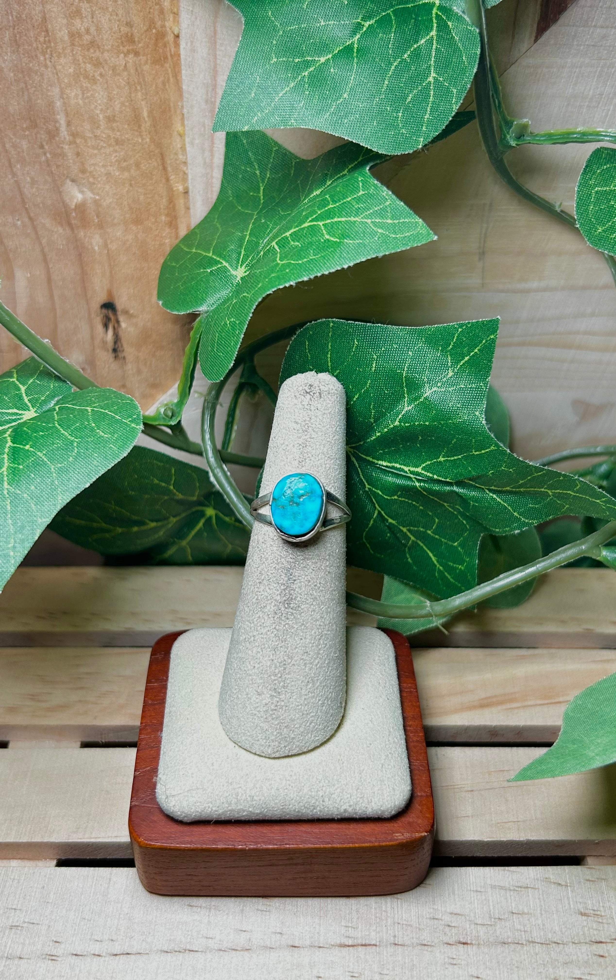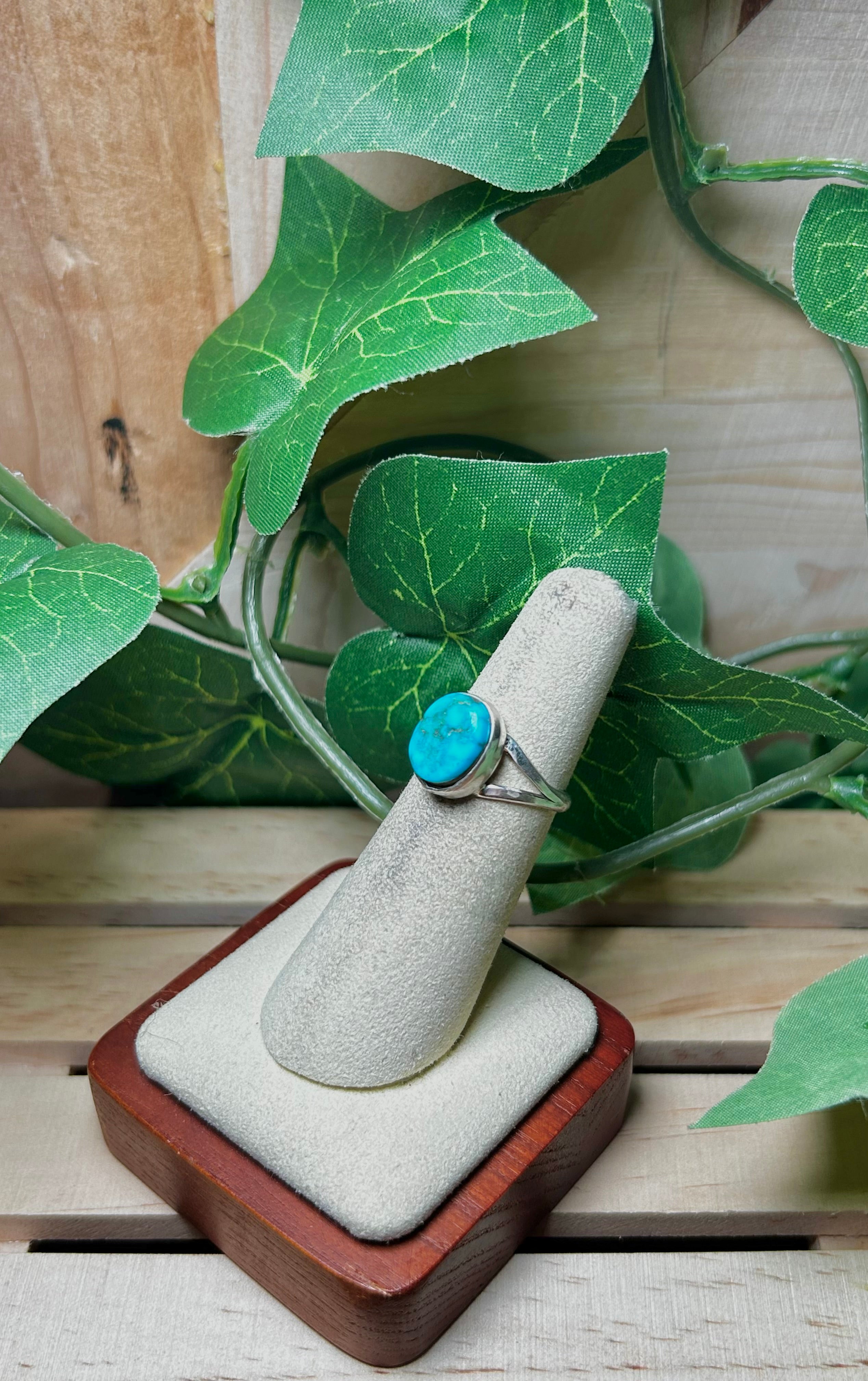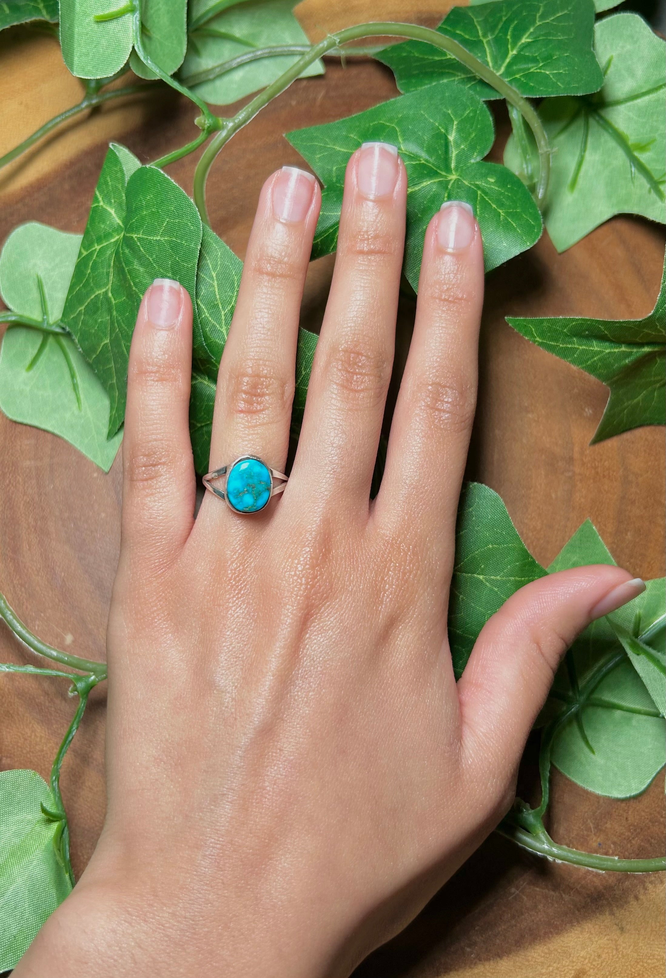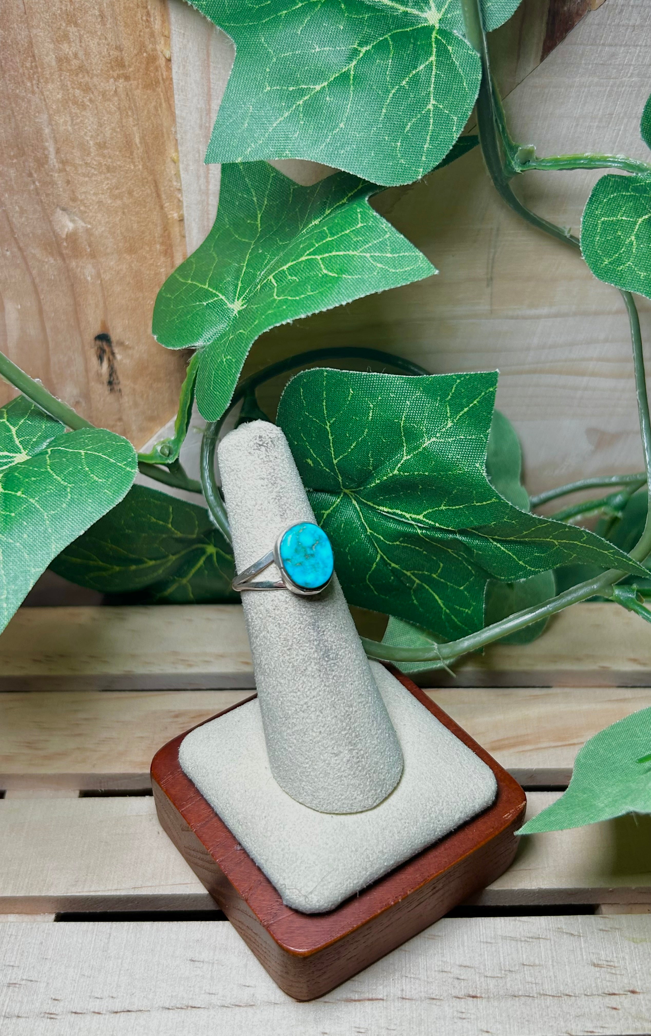 Navajo Made Kingman Turquoise & Sterling Sliver Cluster Ring Size 5.5. It measures 1/2 of an inch long and 3/8 of an inch wide. Signed by the artist and stamped sterling silver.