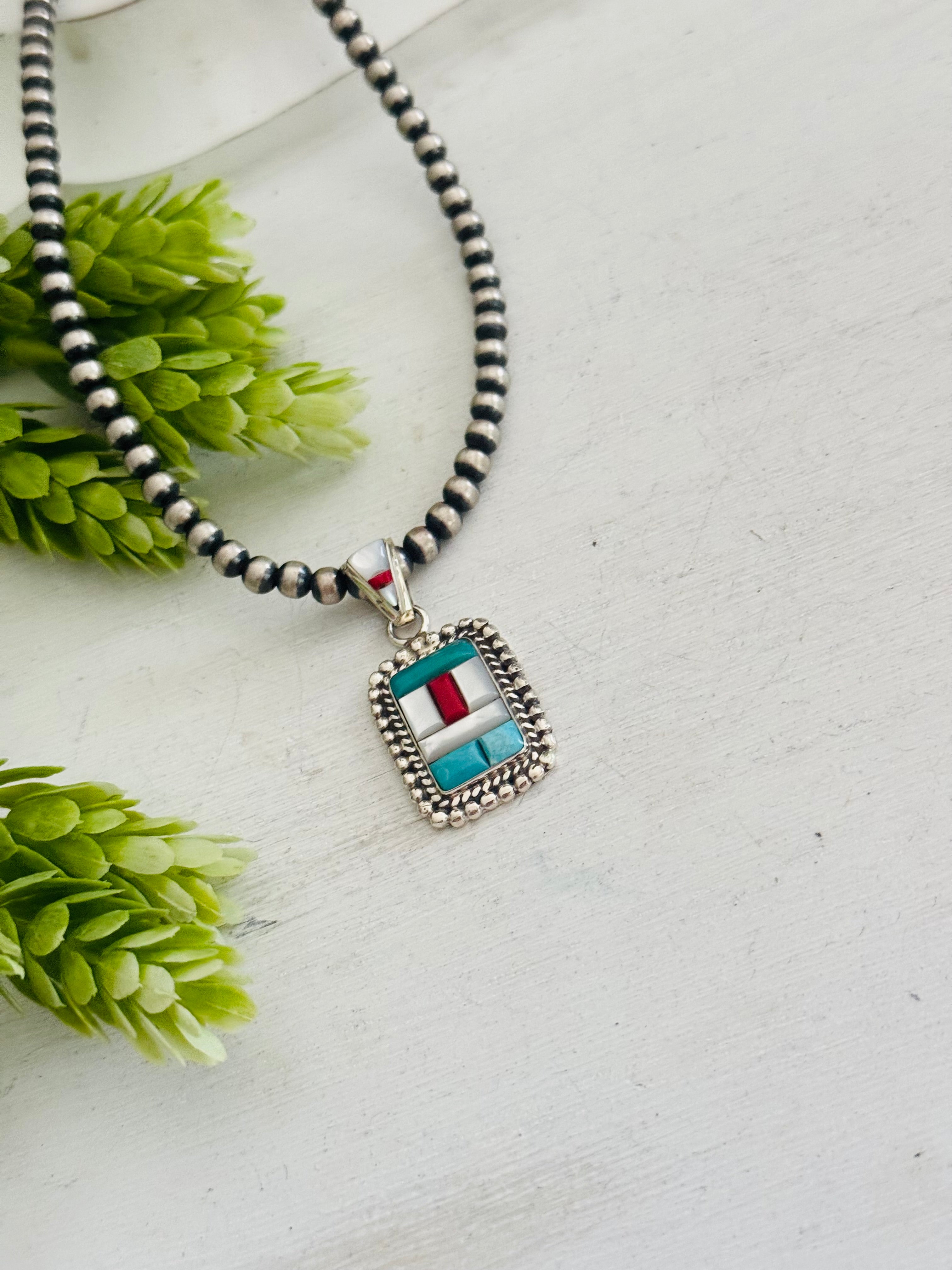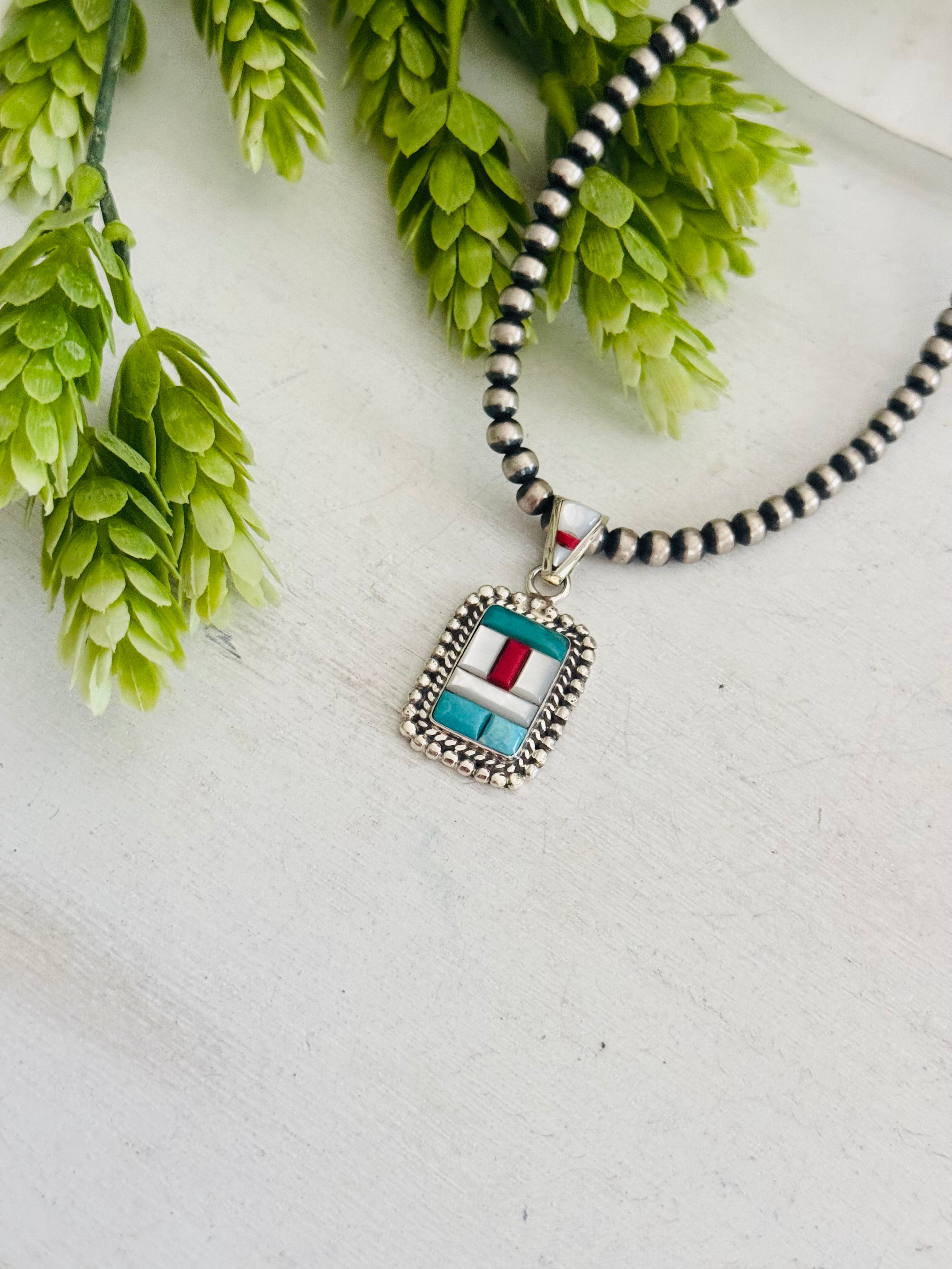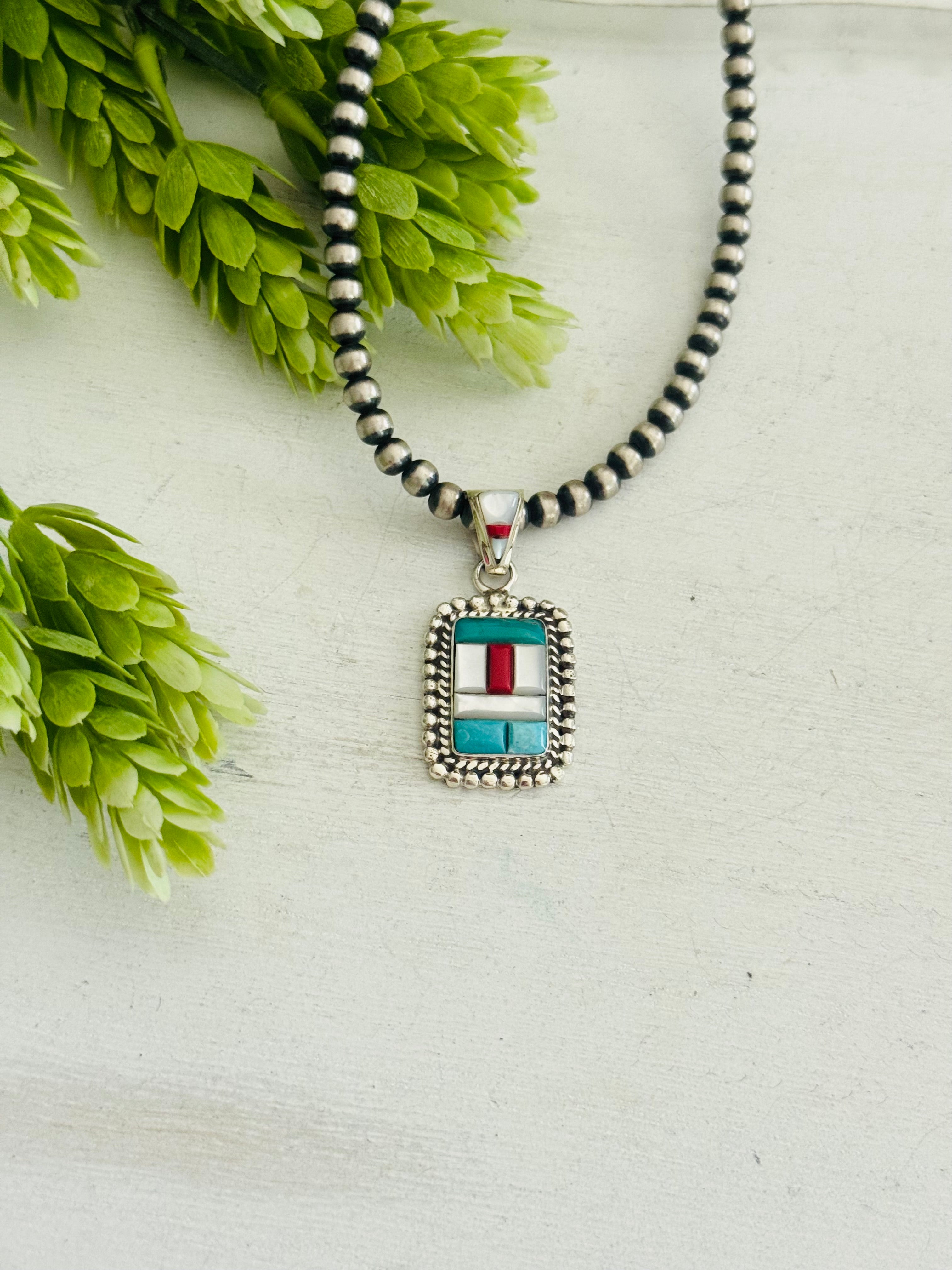 Southwest Multi Stone & Sterling Silver Cobblestone Pendant. It measures 2 1/8 inches long and 7/8 of an inch wide. Pendant Only.