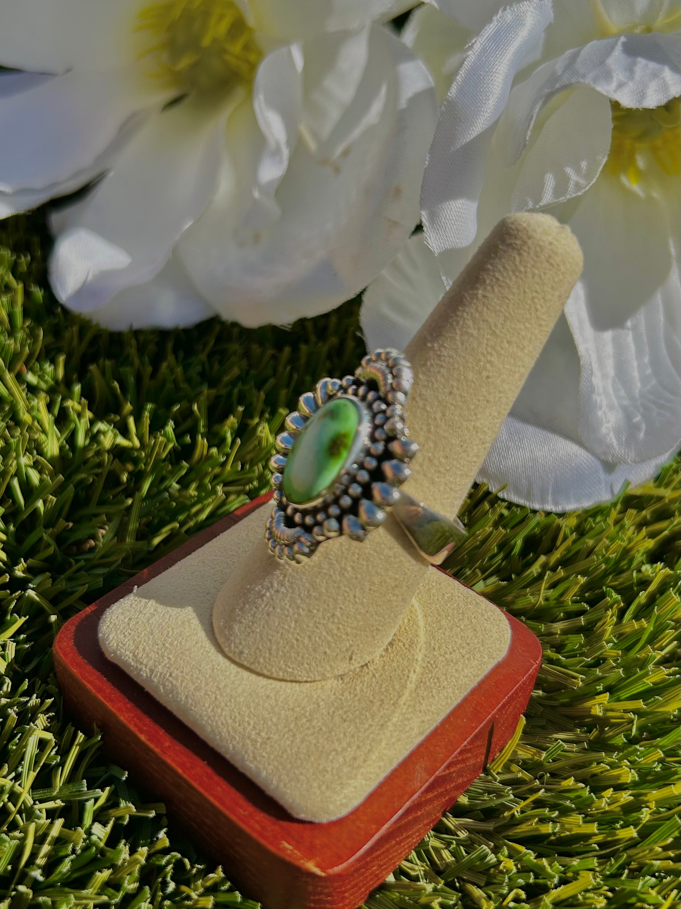 Southwest Sonoran Mountain Turquoise & Sterling Silver Ring Size 9. It measures 1 1/4 inches long and 1 inch wide. Signed by the artist and stamped sterling silver.